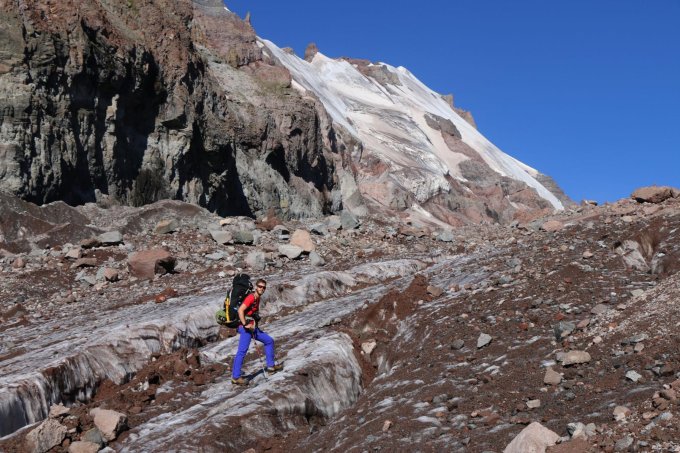 Einen wolkenloser Himmel begrüsste uns am Morgen und der Kazbek leuchtete rot in der Morgensonne. So macht Bergsteigen Spass! Nach einem Kaffe packten wir unser Biwak zusammen und wanderten zuerst noch über den Weg durch Gras, bald aber durch Geröll dem Gletscherrand entgegen. Hier zugen wir die Steigeisen an und überquerten den Gletscher გერგეტი (Gergeti) aufsteigend. Man sah nun schon schön die Bergütte ბეთლემის ქოხი (Bet’lemit K’oxi) bei der Meteostation. Sie war auch unser Ziel denn davor hat es genügend Platz für das "Lager 2" und wir biwakierten dort wie zahlreiche andere Bergsteiger. Nachdem wir unsere Zelt aufgestellt und eine Suppe gekocht hatten wollten wir noch etwas höher hinauf zu Akklimatisationszwecken. Von der Hütte folgten wir einem gut begehbaren, aber sehr steinigem Bergweg. Wir passierten den Aussichtspunkt თეთრი ჯვარი (T’et’ri J̌vari) und erreichten etwas 100m höher auf zirka 3900m wieder den Gletscher der hier aber wegen einer Geröllschicht kaum als solcher erkennbar ist. Die Spur verliert sich etwas und so folgten wir den Steinmännchen und bestiegen auf etwa 4000m einen Schuttkegel der Moräne. Da hier die Wegfindung eben nicht ganz einfach ist , waren wir froh dass wir nun die Route für den nächsten Tag kannten da wir die Stell ja mitten in der Nacht passieren werden.