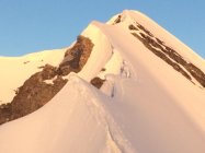 Wie momentan die meisten Touren mit mehrheitlich Firnanteil - ziemlich perfekt! Blümlisalpgletscher recht gut gedeckt, alle Spalten können gut überquert werden. Auch wenn heute mal wieder ein Alleingeher auf dem Gletscher spazierte - dieser hat grosse & tückische Spalten, sicher kein Gletscher zum experimentieren! Flanke zum Morgenhorn hat gute Spur, die letzten 150 Hm sind Stufenleiter - sogar mit Plateaus zum Wadenlockern - Dank dem unbekannten Schöpfer! Eis zum Schrauben findet sich jedenfalls keines, das hat Seltenheitswert! Überschreitung nur teilweise trittspuren, oft recht hart, aber immer griffig! Mit der harten Unterlage ist die Nordwand momentan wohl Wadenkiller.