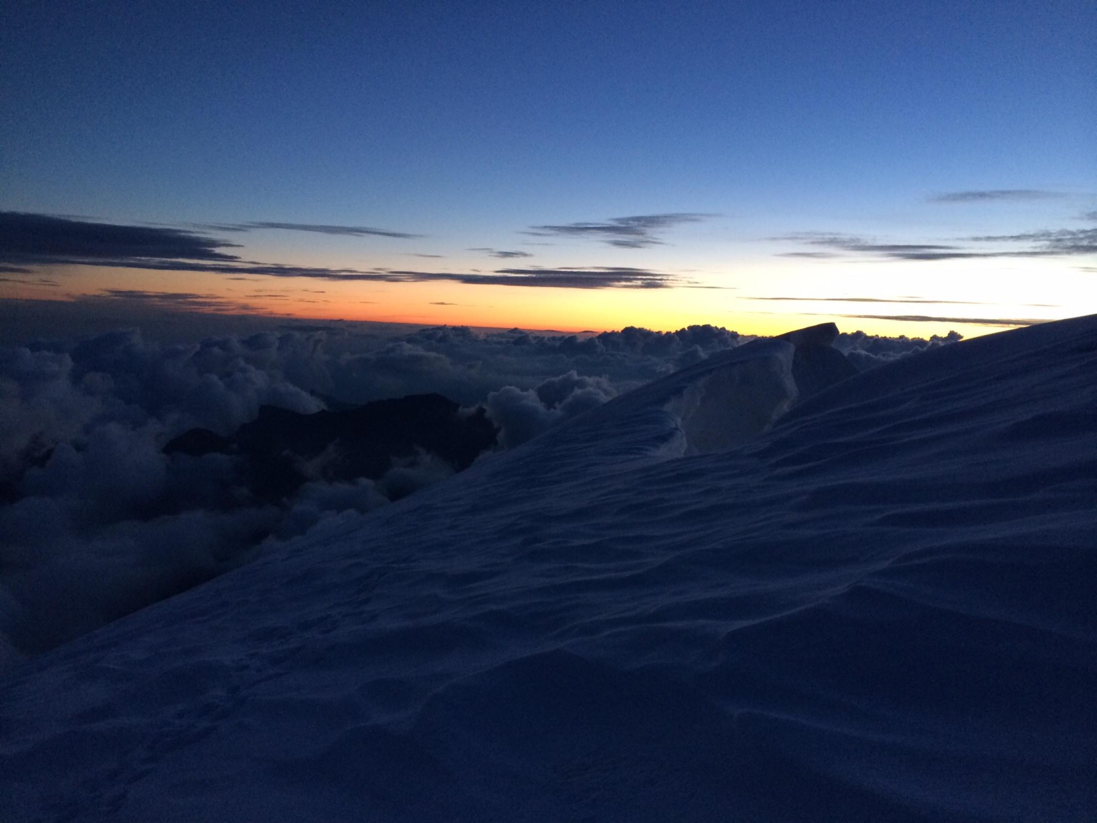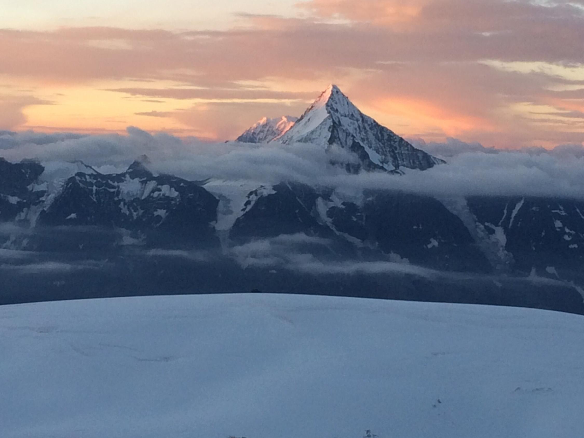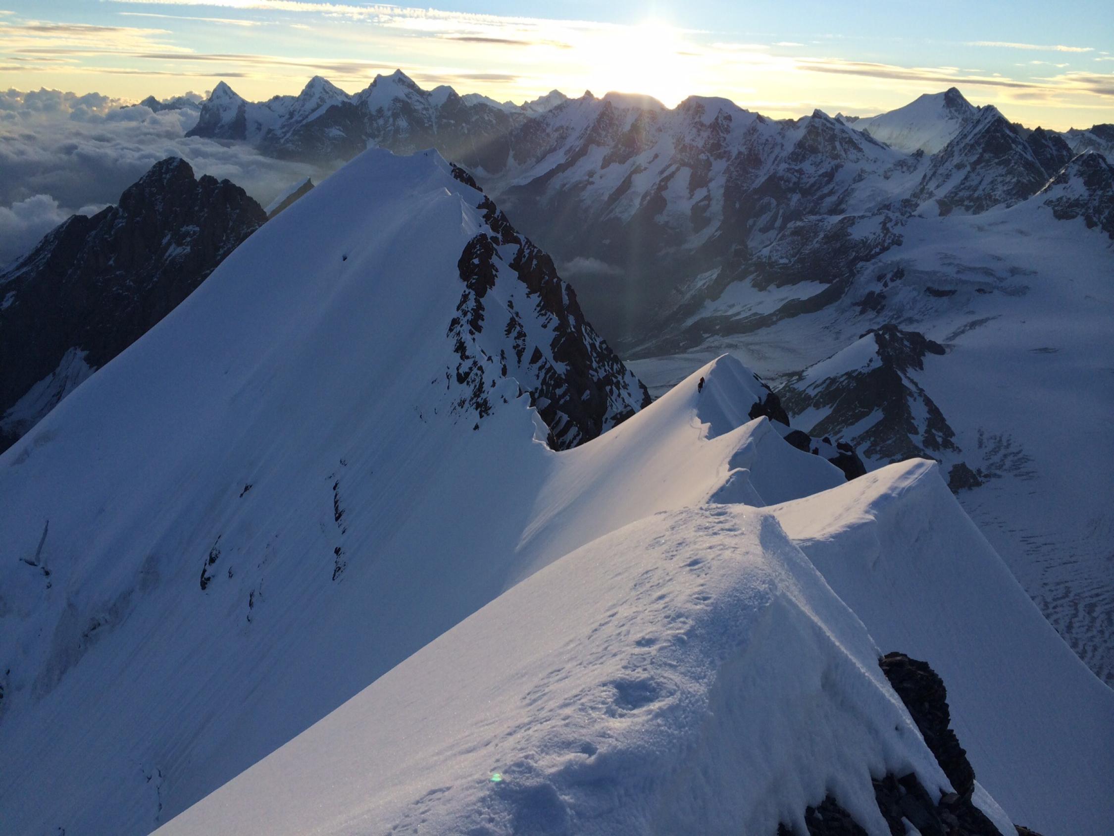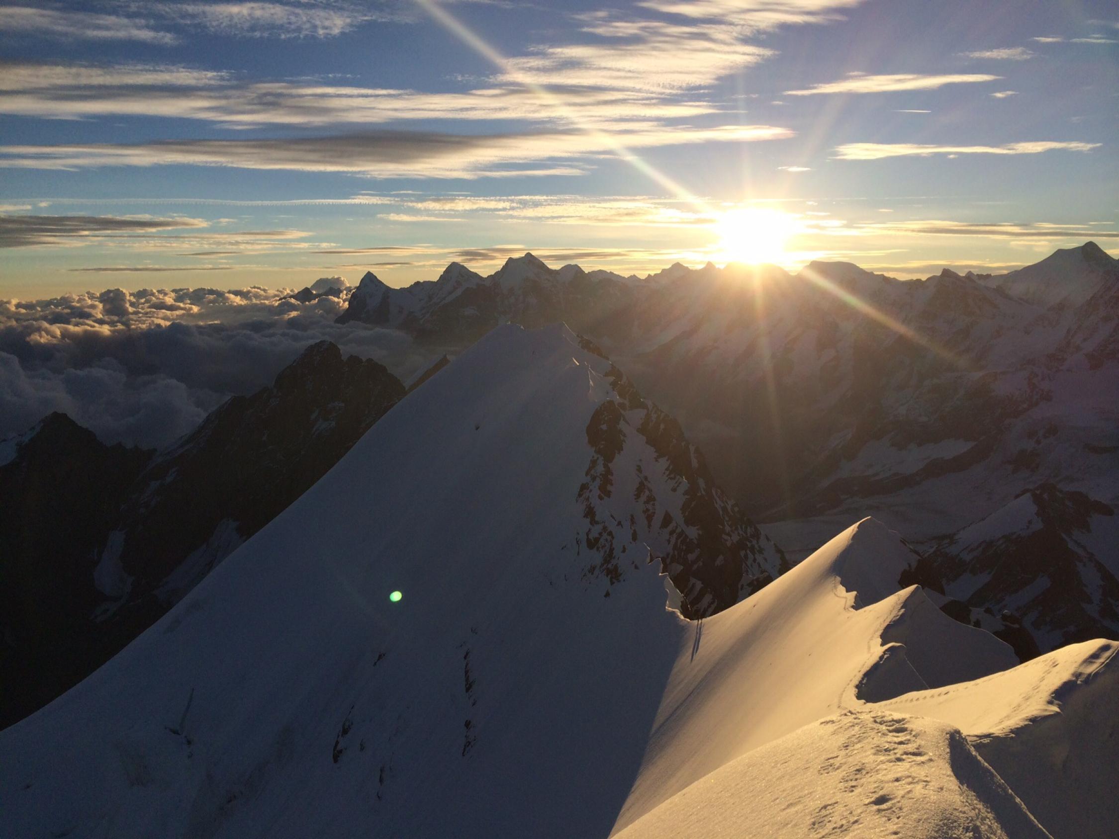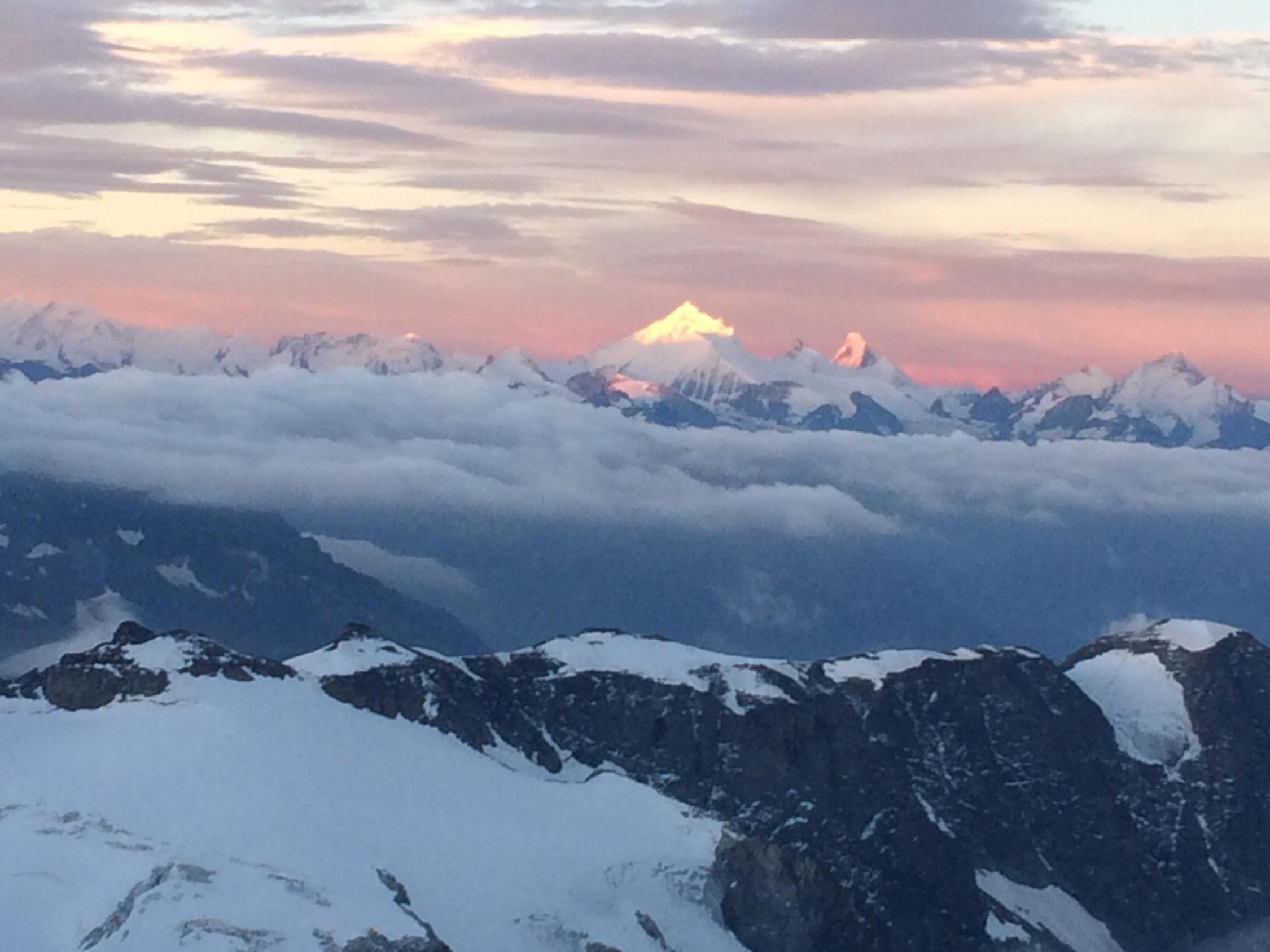 Biwakiert da Hütte voll war. Zumindest das Weinangebot der Hütte konnte genutzt werden, so mussten wenigstens nicht noch Flaschen hochgeschleppt werden. Im Herbst - wenn die Bedingungen noch stimmen, eine Traumtour. Der Sonnenaufgang verzaubert die Gipfelwelt, siehe Bilder. Dank der guten Verhältnisse eine flotte Tour, ohne Schrauberei bereits nach 1,5 h am Morgenhorn.