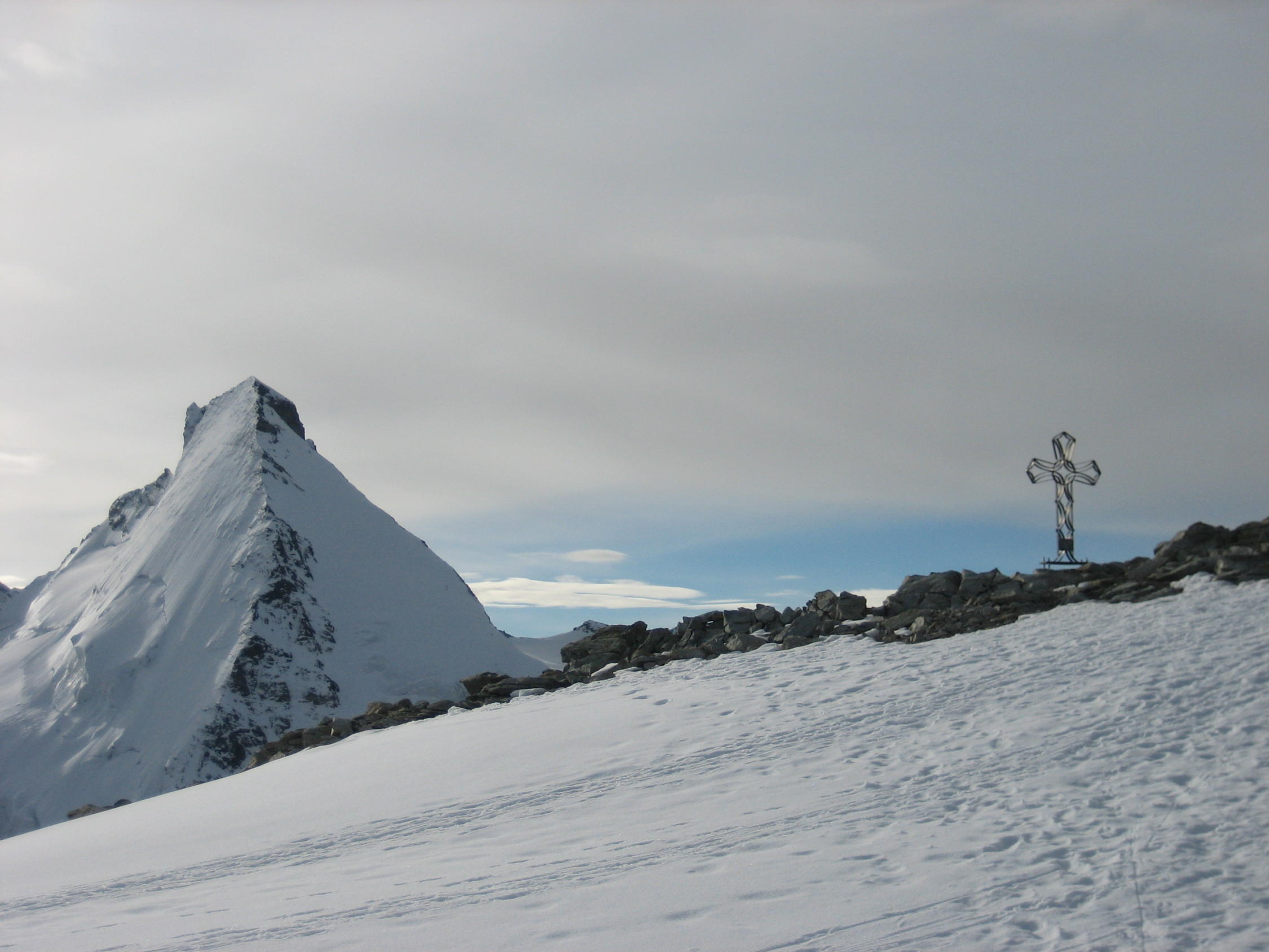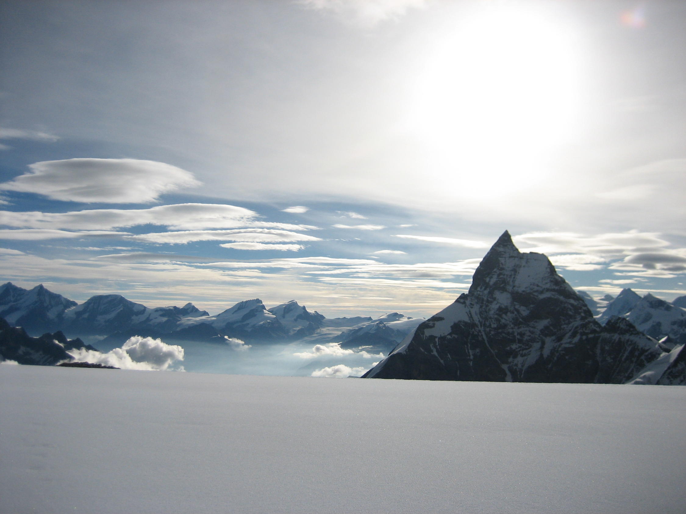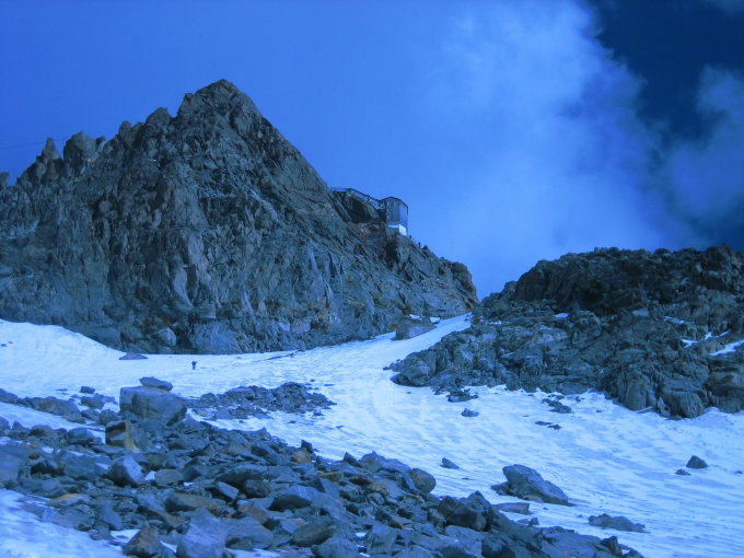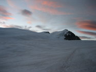 Glacier du Mont Miné nach dem kühlen Sommer noch gut eingeschneit, nur vereinzelt Spalten. Nullgradgrenze lag auf 3700 m, auf dem Gipfel wehte ein frischer Wind. Gletscherfirn blieb auf Hin- und Rückweg hart und gut zu begehen.