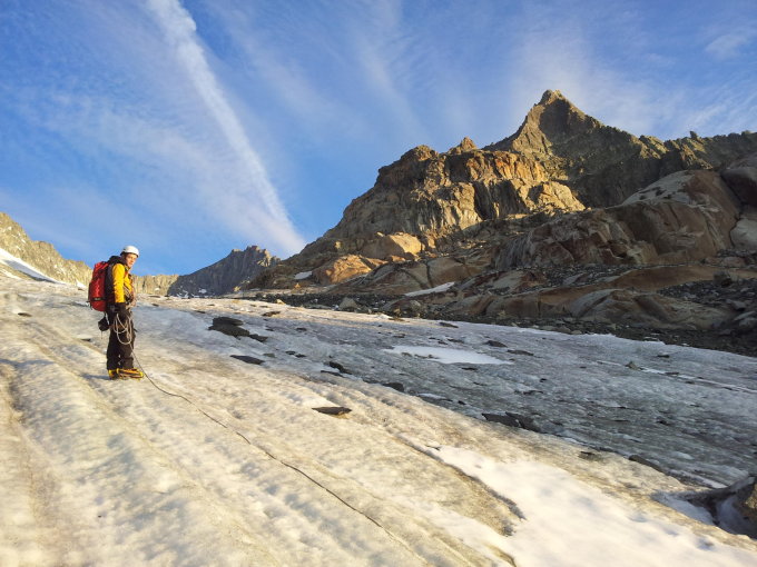 Allg. sehr gute Verhältnisse. Tiefengletscher unten blank, mit Steigeisen problemlos begehbar, ein paar Spalten können umgangen oder übersprungen werden. Ab ca. 2800 m erster Restschnee, danach zunehmend, der den Aufstieg zum Einstieg erleichtern. Grat selber ist trocken und schneefrei. Restschnee beim Abstieg in der Rinne, jedoch problemlos. 3 x 20 m abseilen auf das Firnfeld, welches noch mit ca. 15 cm Schnee bedeckt ist und den Abstieg ebenfalls angenehm macht.