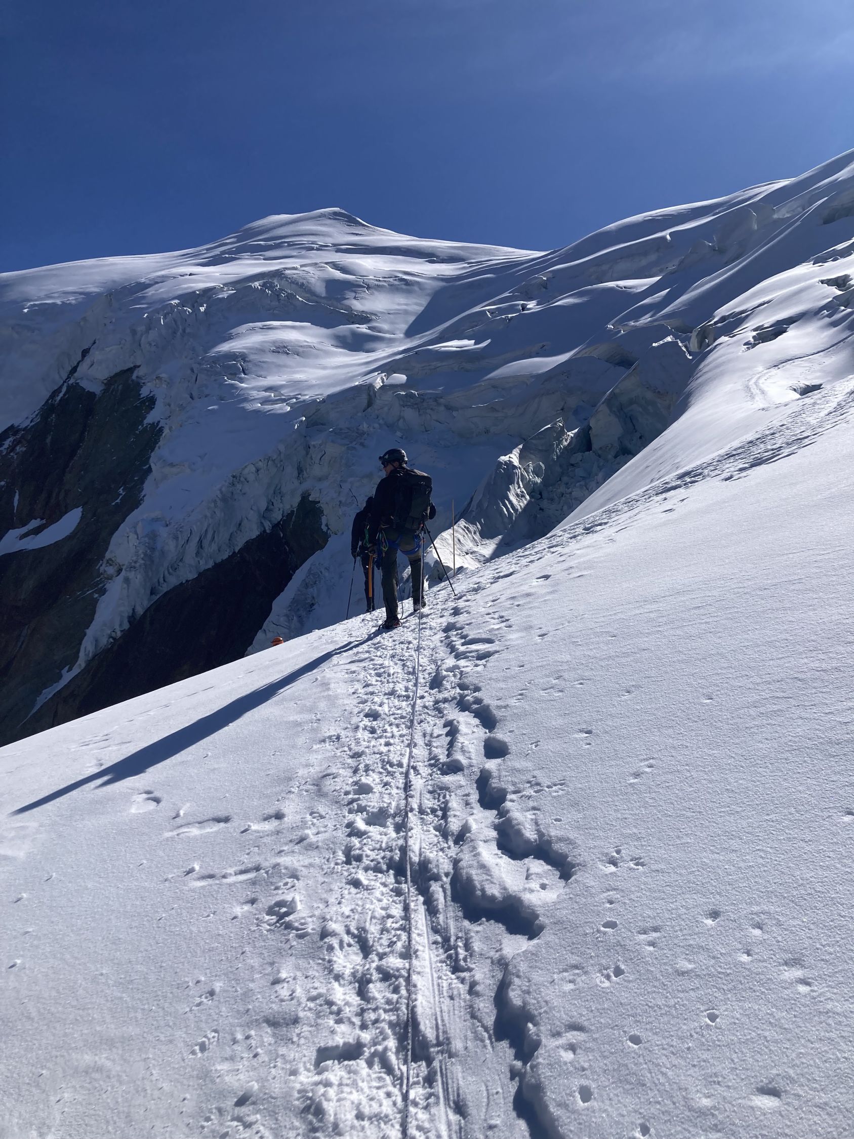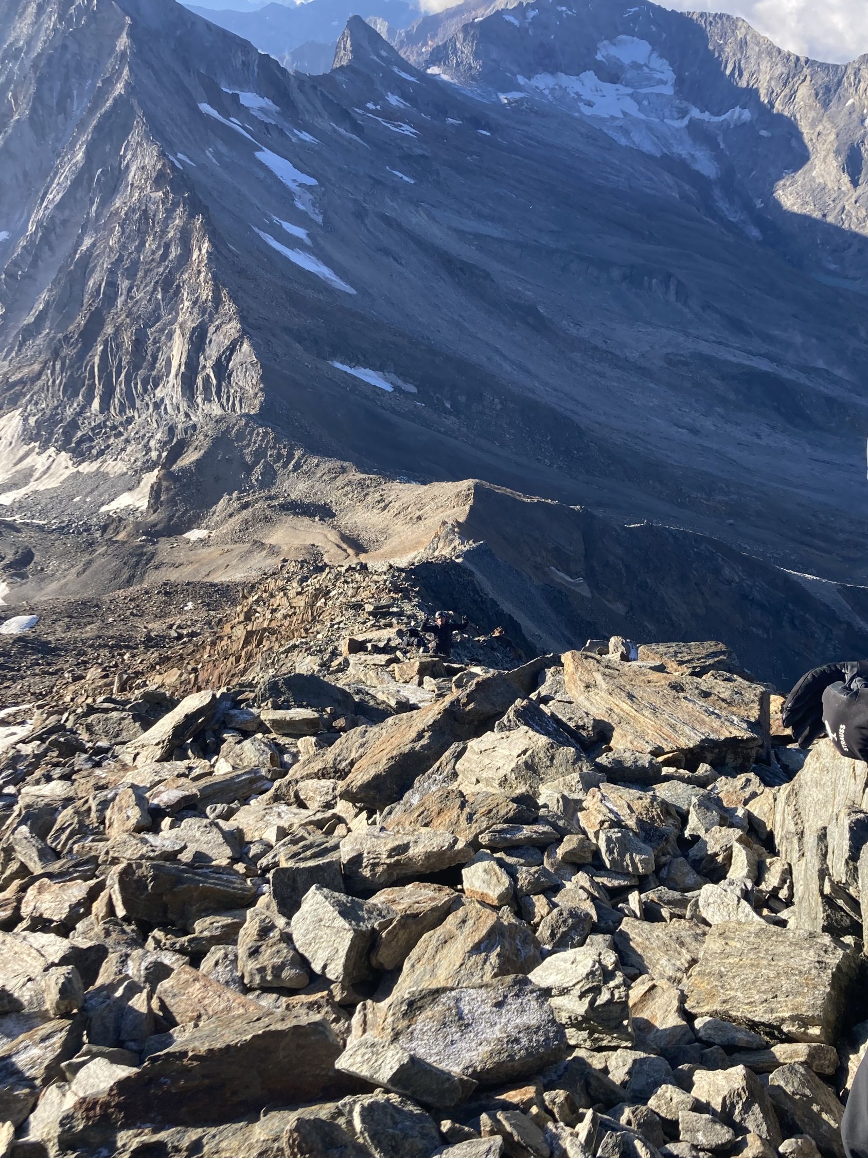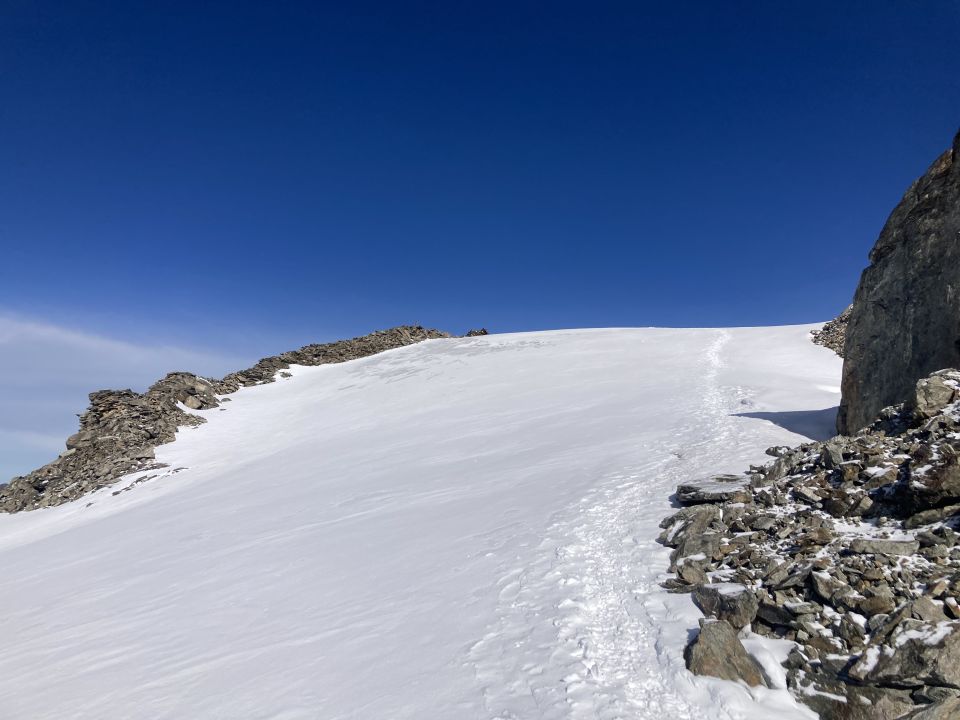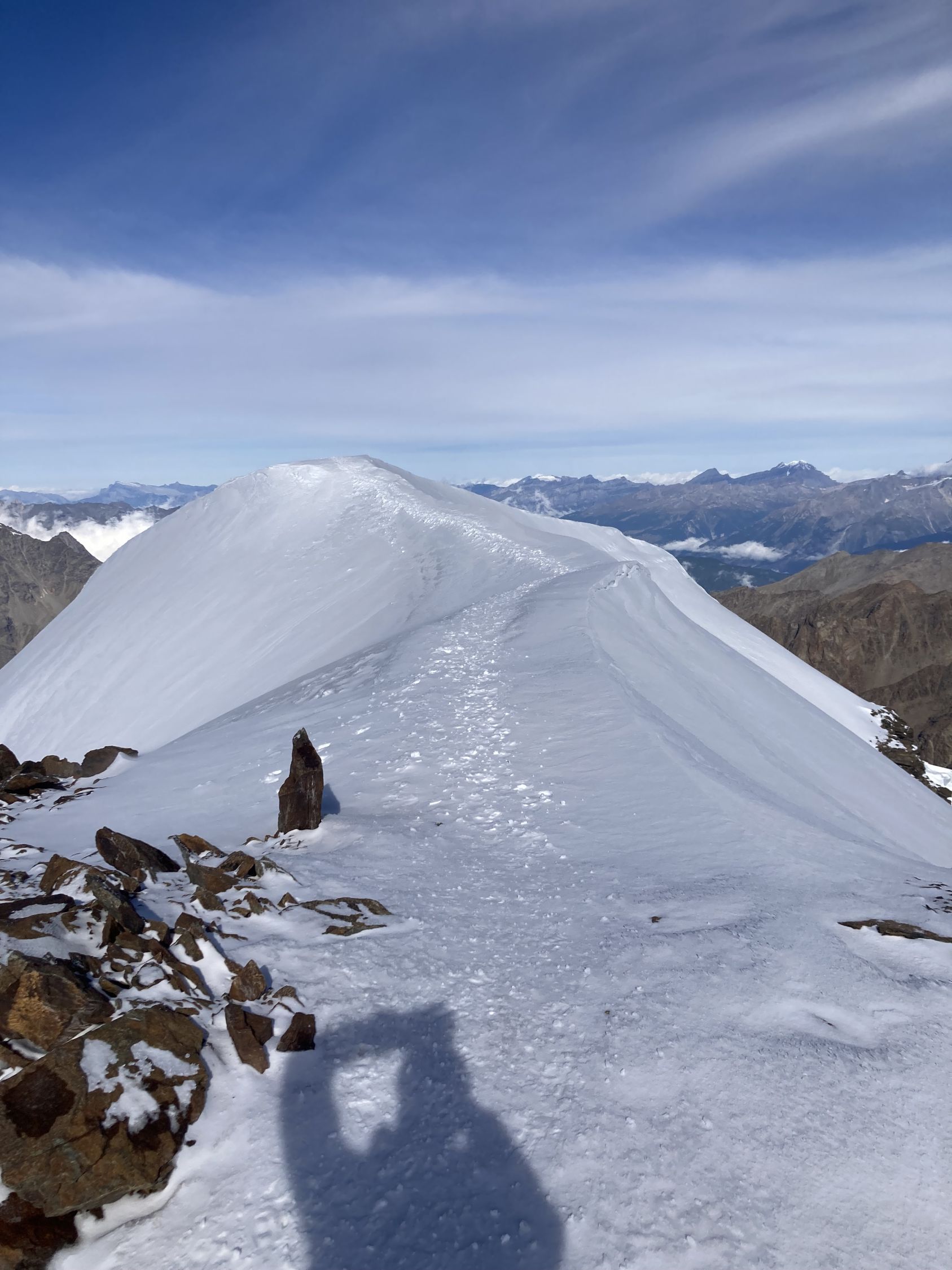 Gute Verhältnisse. Schöner trockener Fels beim Aufstieg. Der Gipfelgrat ist gut präpariert und hart. Der Abstieg nach HohSaas ist problemlos möglich. Der letzte Abschnitt ist allerdings etwas anspruchsvoll, da man sich den Weg durch die Gletscherspalten suchen muss.