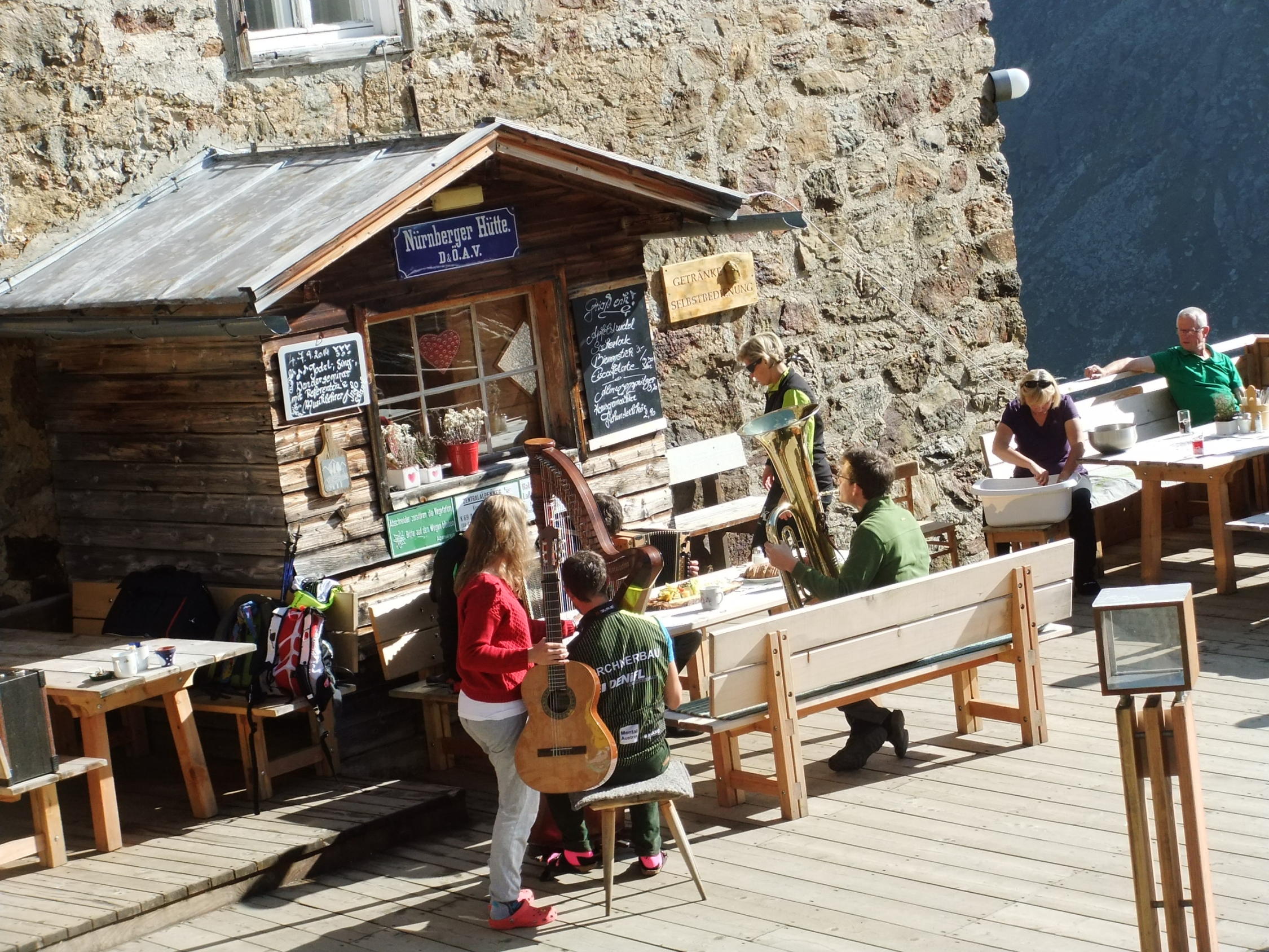 Klettern am Sonntag-Morgen um 10:00 Uhr bei Sonnenschein und begleitet mit "Hüttenmusik" von der Terrasse der Nürnberger Hütte hinauf. Wann hat man das ?