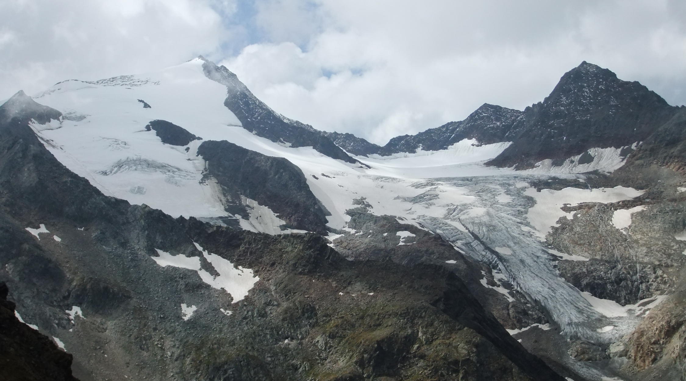 Vom Niederl Aussicht auf den Schrankogel, Wilden Freiger die Seespitze, Ruderhofspitze, Feuersteine, Kalkkögel bis hin zum Karwendel