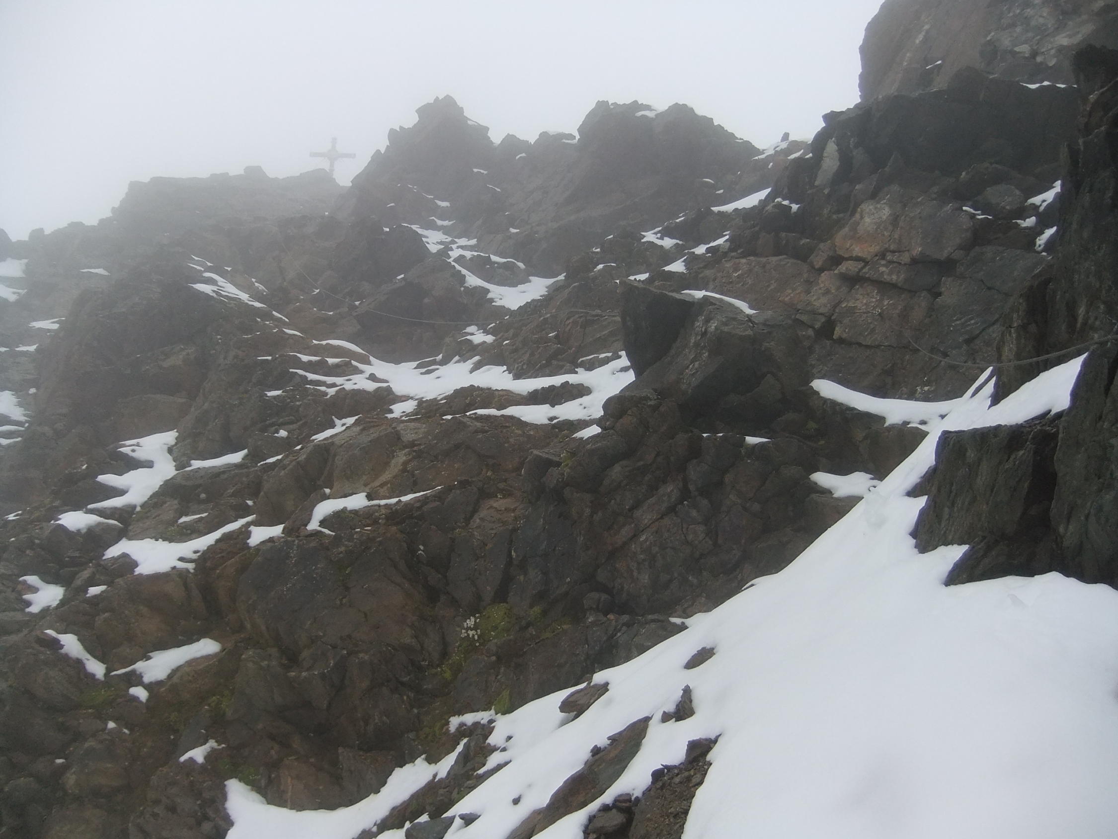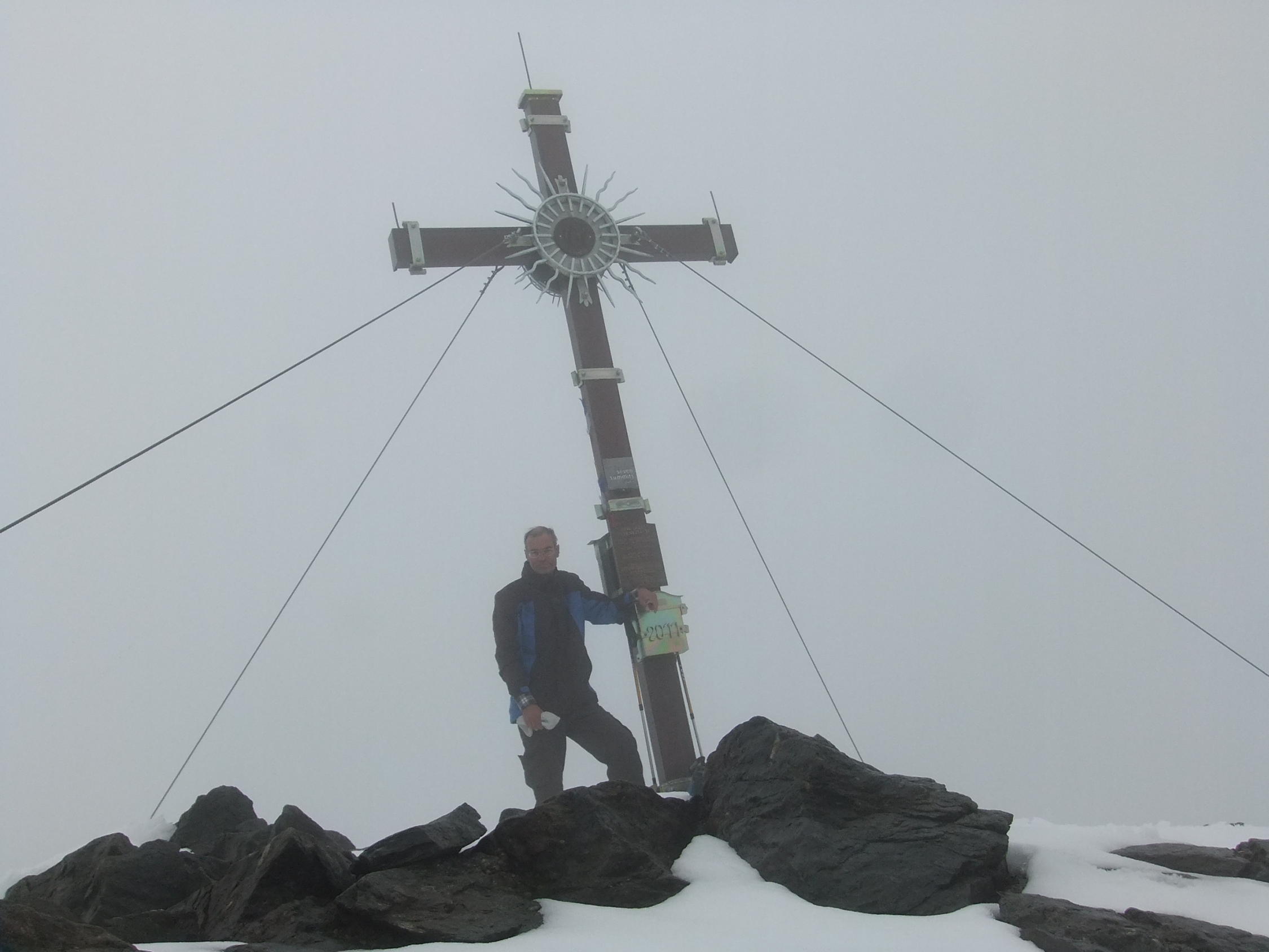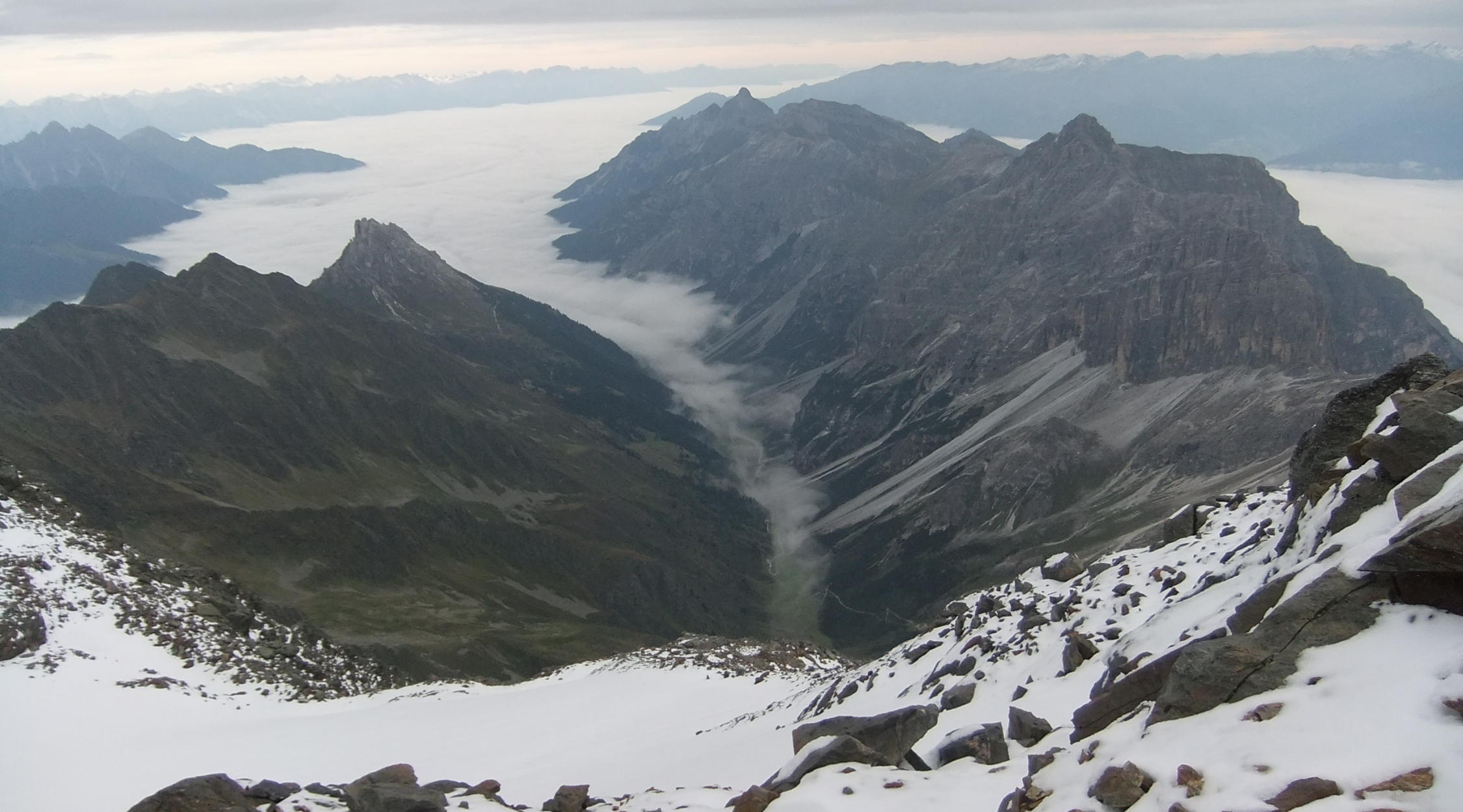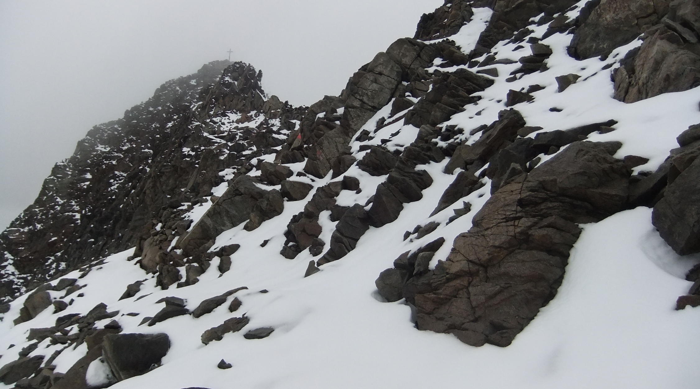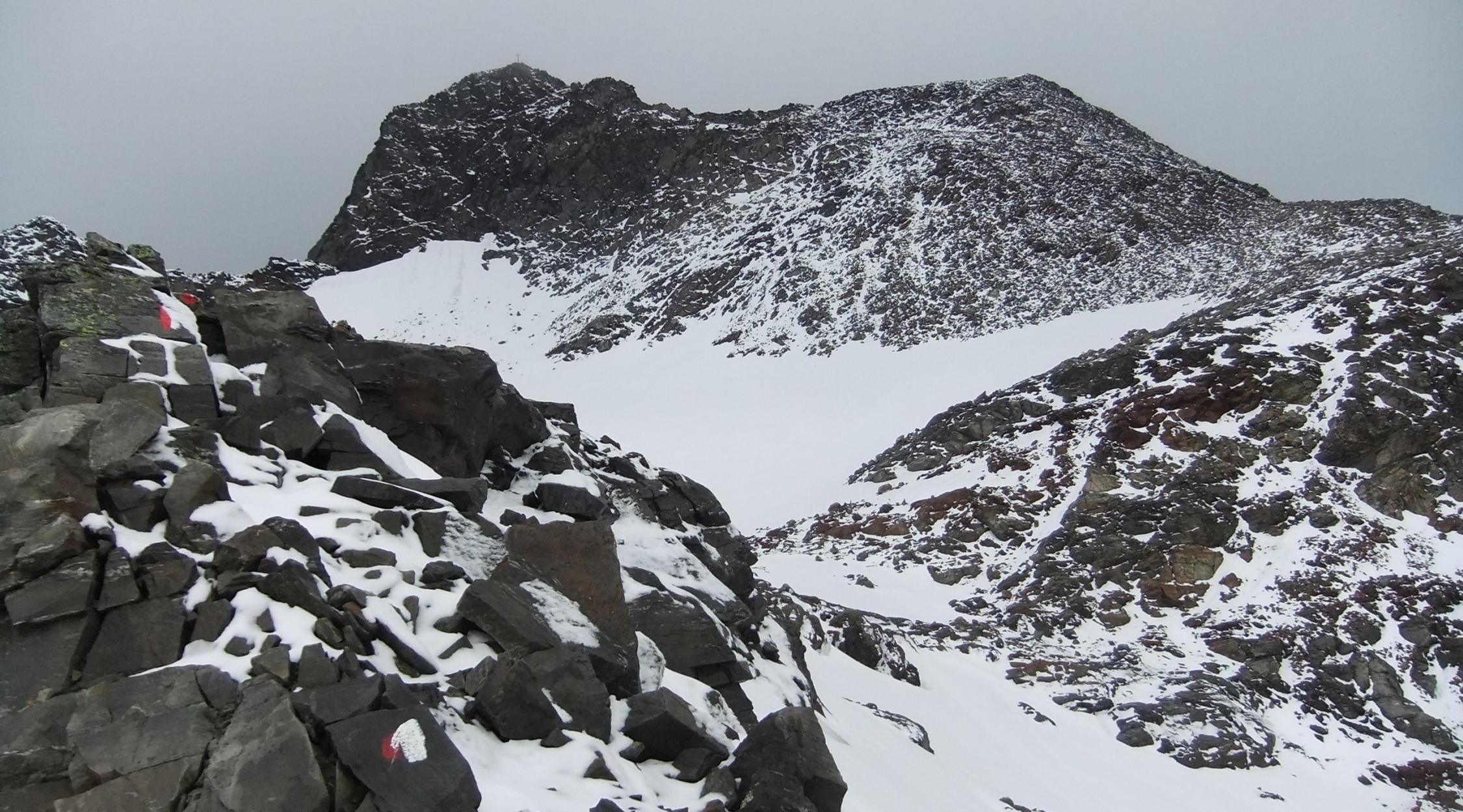 Tourenbeginn von der Innsbrucker Hütte um 06:30 Uhr. Ab ca. 2800 hm Neuschnee der Vortage, im Gipfelbereich kniehoch, jedoch wegen der nicht kalten Temperaturen nirgendwo vereist, so daß die Sommersteigeisen im Rucksack blieben. Bei Vereisung nimmt die Schwierigkeit erheblich zu.