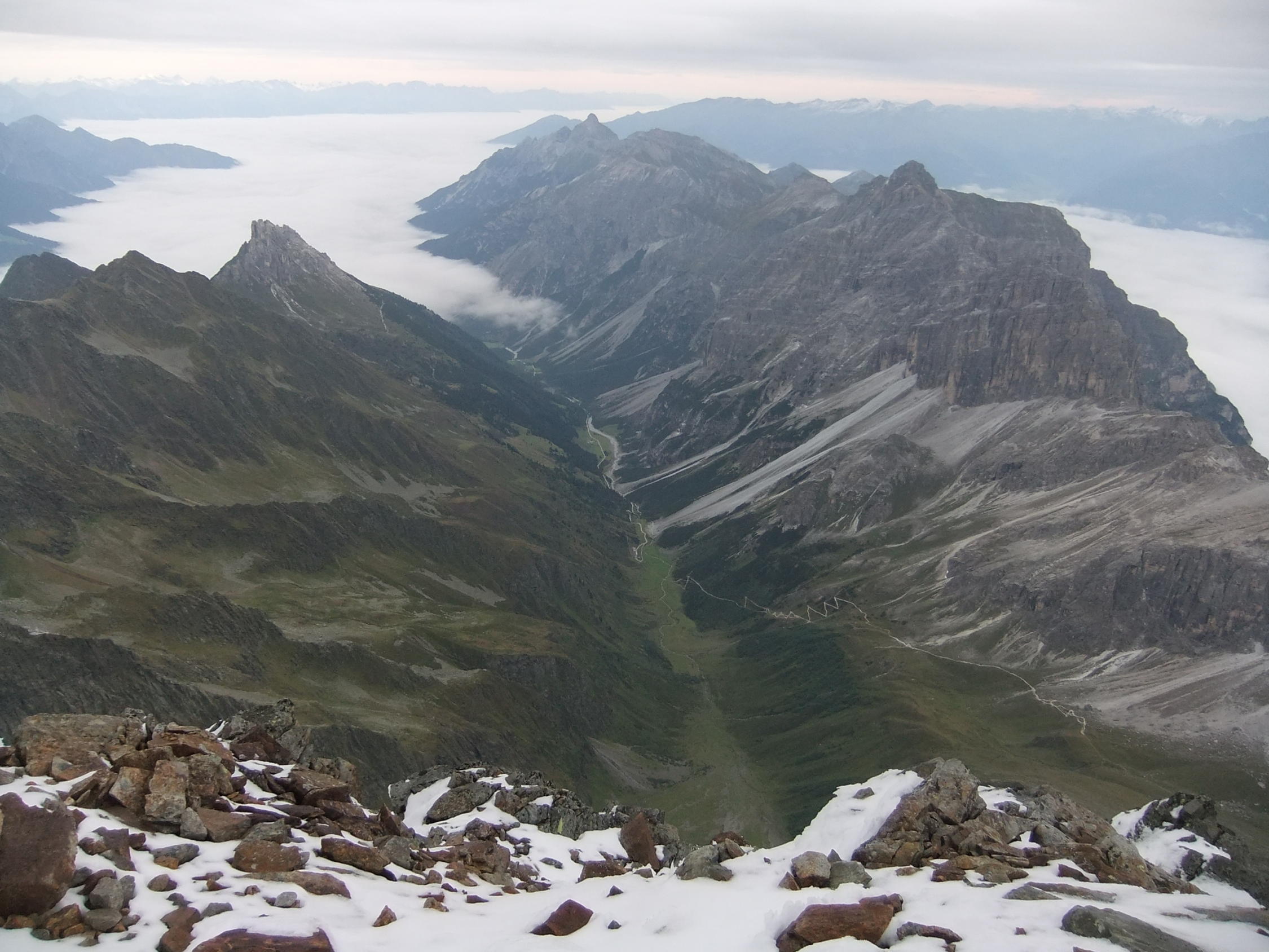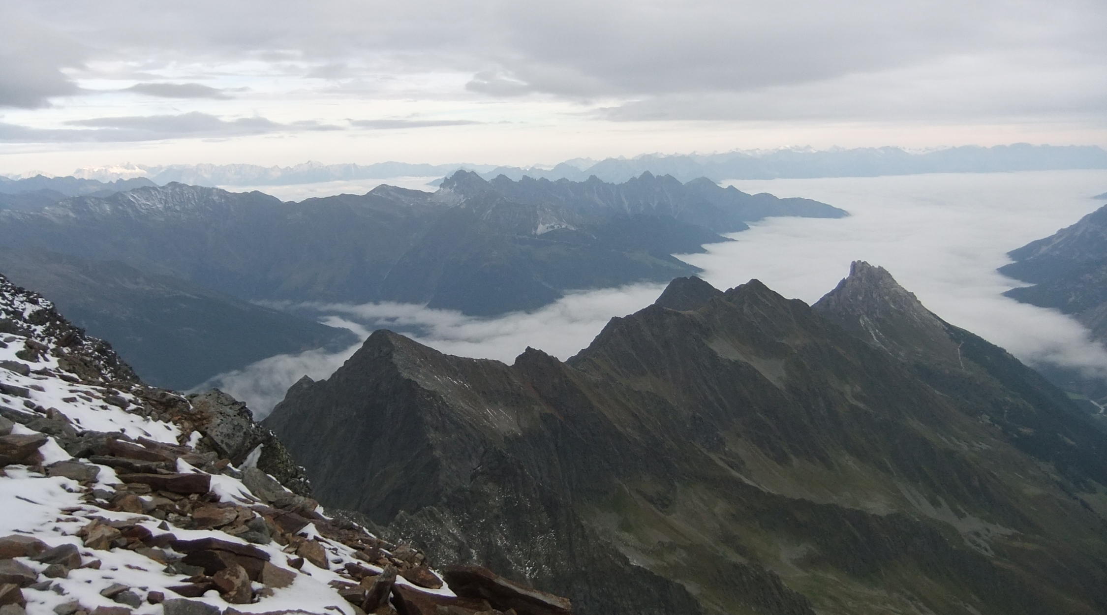 Panorama-Aussicht vom frei stehenden Gipfel zur Marmolada, Rosengartengruppe, Brenta im Süden, Olperer u. Mösler im Osten, Wilder Freiger , Zuckerhütl, Wildspitze, Ruderhofspitze im Westen, ..., wenn nicht im Nebel verhüllt.