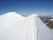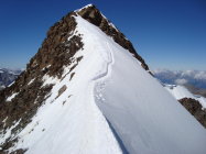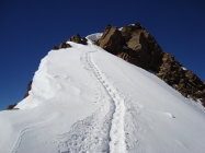 Auf dem Firngrat Trittschnee.Es ist eine gut gelegte Spur vorhanden.