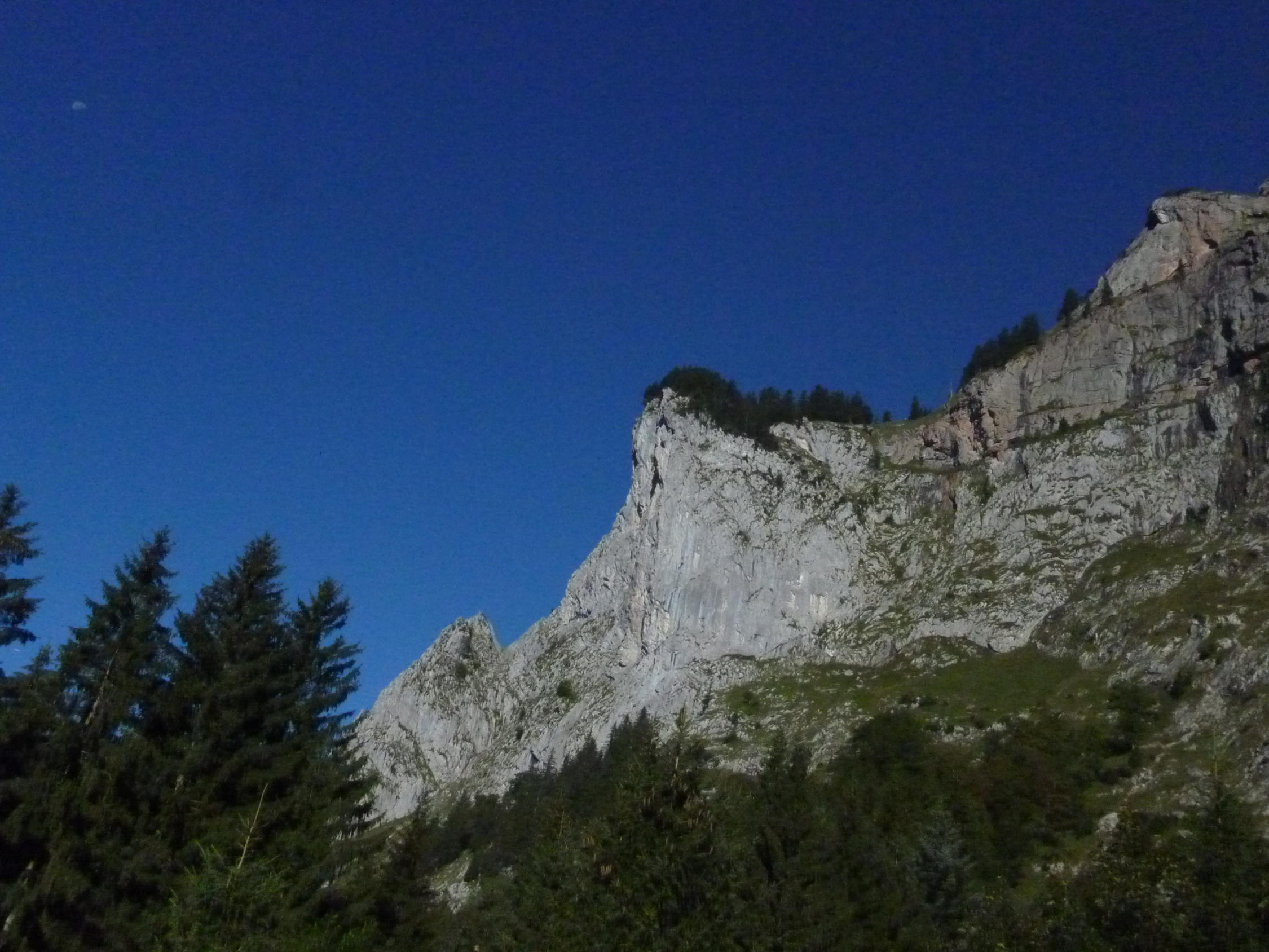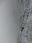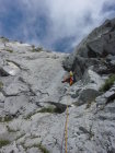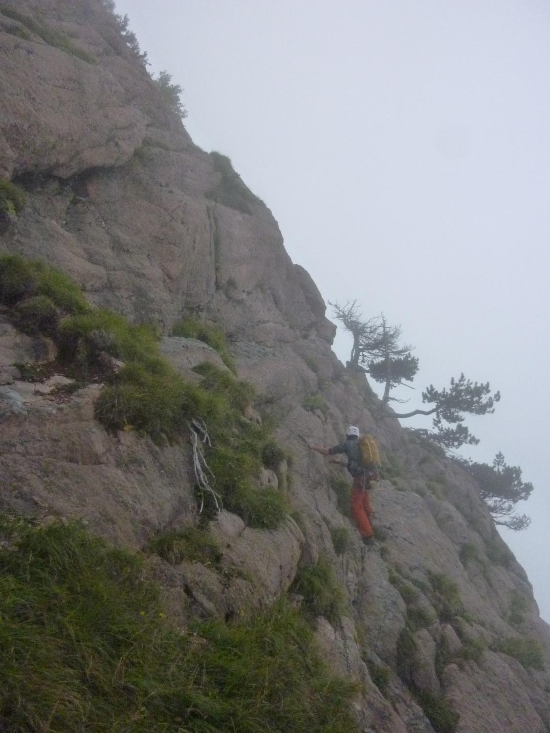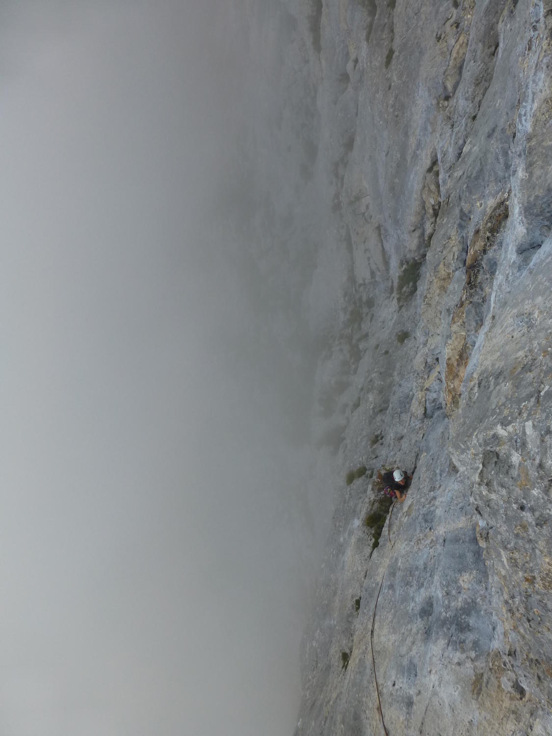 Die Route erhält nicht allzu viele Begehungen, d.h. man kann wieder mal onsight klettern da es kein Magnesia auf den Griffen hat. Auf der Negativseite führt dies leider dazu, dass die Vegetation den Fels allmählich zurück erobert. Ein bisschen jäten würde in der 3. SL. nicht schaden. Im allgemeinen ist die Route gut gebohrt. Ein bisschen heikel sind nur eine Stelle in der 3. SL und der Beginn der 4. SL. Ein Sturz kurz vor dem Bolt wäre hier unangenehm. Für die Stände 5 und 7 ist eine dünne Dyneema Schlinge (oder ein Messer) nützlich: Die alten und zimlich mürben Schlingen sind mehr Hinderniss als Hilfe. In der Traverse der 7. Seillänge braucht auch der Nachsteiger gute Nerven. Wir haben den Abstieg über den Schafweg genommen. Die Traverse zum Wyss Nollen verlangt ein bisschen Aufmerksamkeit aber dafür hat man den Rest des Weges mit Drahtseilen/Ketten gesichert. Insgesamt eine imposante, steile Route in meist hervorragendem Fels. Neben Abendsonne meiner Meinung nach die beste Route am Mythen.
