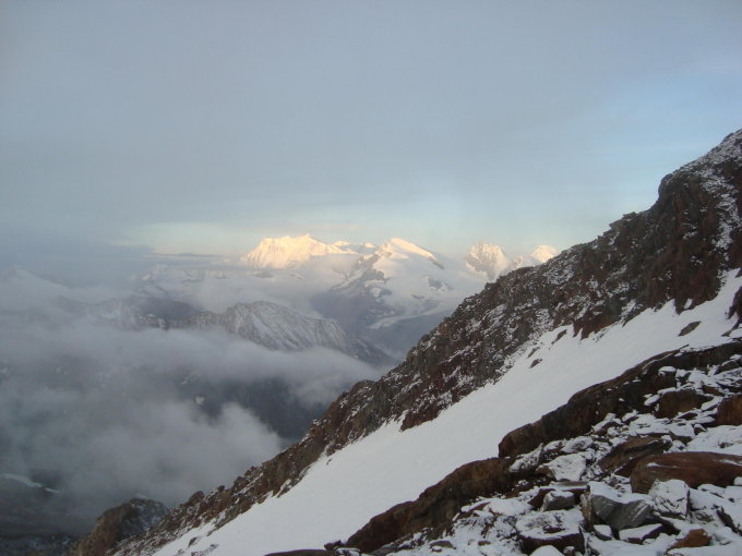am Mo. 15.9. wechselnd bewölkt und sonnig. In der Nacht auf Di. 16.9. Regen, ab 3000m in Schnee übergehend. Am S-Grat daher etwas Neuschnee. Im Aufstieg über das Firnfeld soweit wie möglich hoch gestiegen - dito im Abstieg.