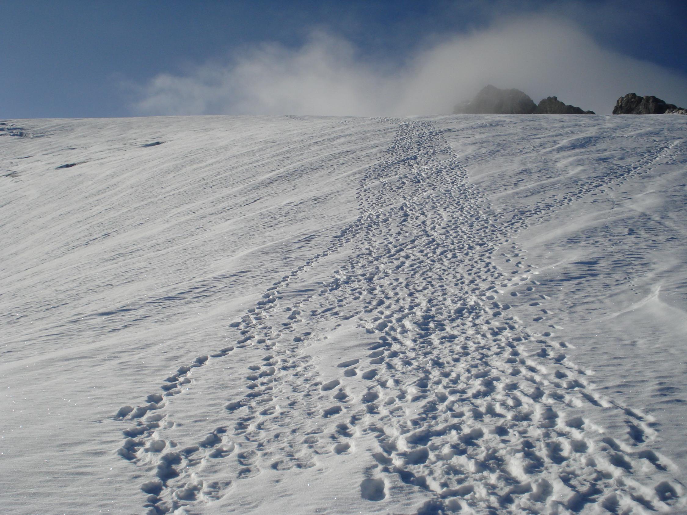 Alles trocken im Aufstieg. Weg bis zum Iswändli für diese Jahreszeit noch mit stellenweise reichlich Schnee bedeckt. Iswändli komplett schneebedeckt und daher bestens zu begehen. Vorgipfel und Gipfel stellenweise noch reichlich Schnee drin. Wir sind deshalb ab Iswändli bis zum Gipfel mit den Steigeisen gegangen. Gletscher noch gut eingeschneit. Da und dort gilt es aber acht zu geben.
