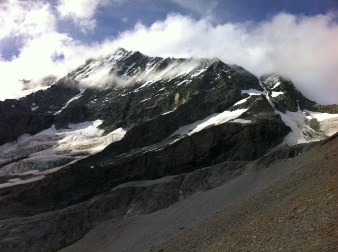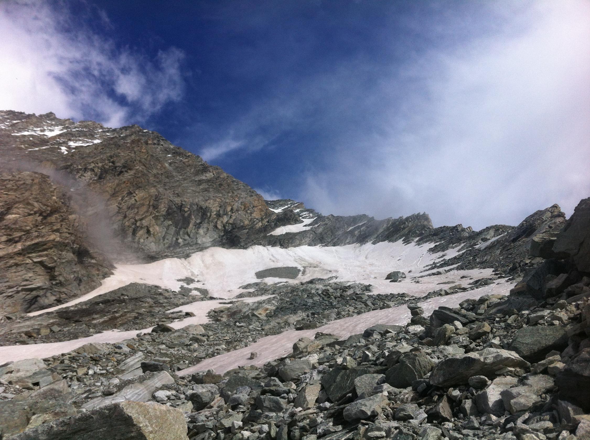 zugang über gletscher und das band hinauf auf 3100 m weiter zum felsrigel und weiter zur verschneidung ca. 3500 und rippe (schneefrei) auf grat ist in top zustand. der gletscher unten ist aper und hat kaum spalten, (seilfrei zu begehen).. dort wo schnee liegt herrschen griffige bedingungen.