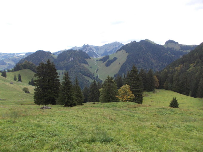 Der Aufstieg aus dem Vallée du Motélon führt über wenig geneigte Hänge. Vorbei an mehreren Alpstallungen mit Viehwirtschaft. Im Winter werden wir bis in den Pass mit Skis steigen.