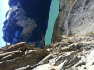 Abstieg erst 5cm Pulverschnee, der mit Stahlseilen gesicherte Teil (ca50m) ist wegen Vereisung recht heikel. Danach trocken.
