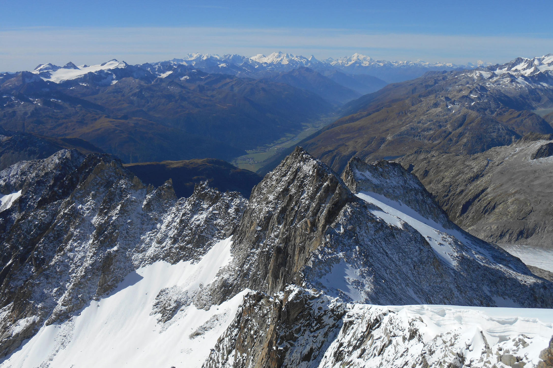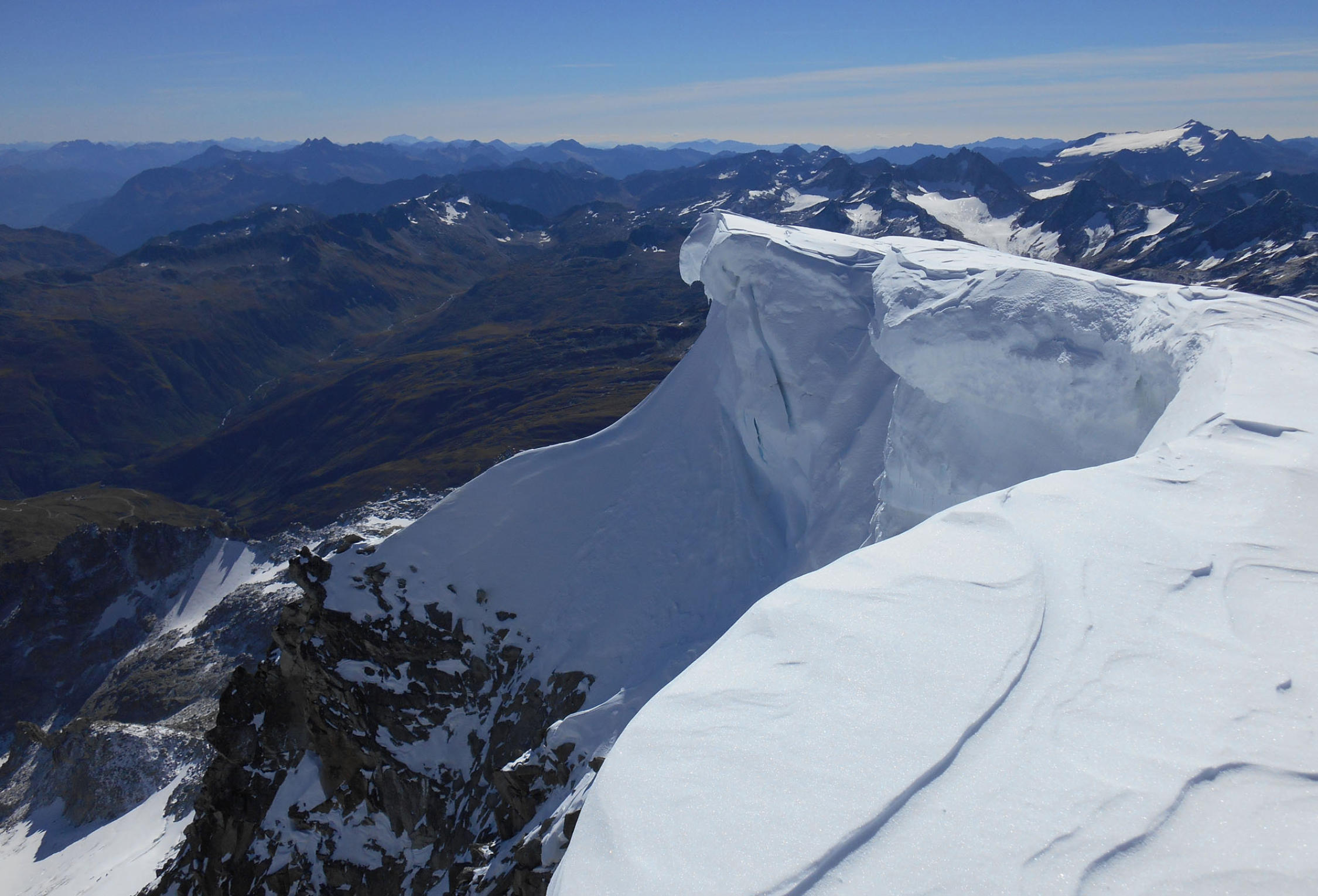 Neuschnee auf dem Gletscher und in den Felsen (zuoberst ca. 20 cm). Während der Schnee auf dem Gletscher ein Vorteil war (hart gefroren, aber griffig), machte er die Kletterei Felsen natürlich nicht einfacher. Der Schnee war aber nicht mehr pulvrig, sondern gut verfestigt. Wir kletterten mit Steigeisen. Die schwierigen Stellen waren schneefrei. Über den Galengrat bis zum Gipfel super Bedingungen.