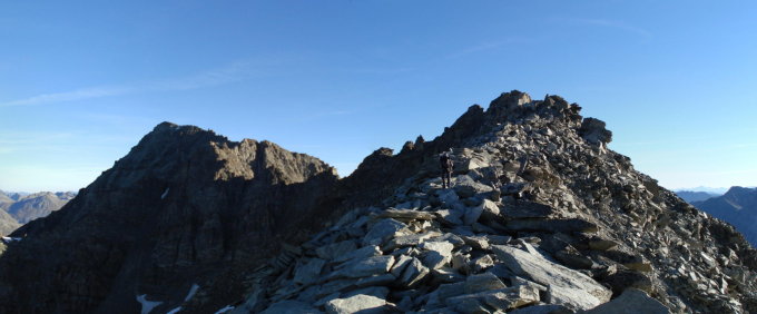 Grat bis auf Schneefelder in flachen Partien in Gipfelnähe meist trocken; Geröll in N- und W-exponierten Abschnitten aber häufig mit Raureif überzogen.