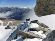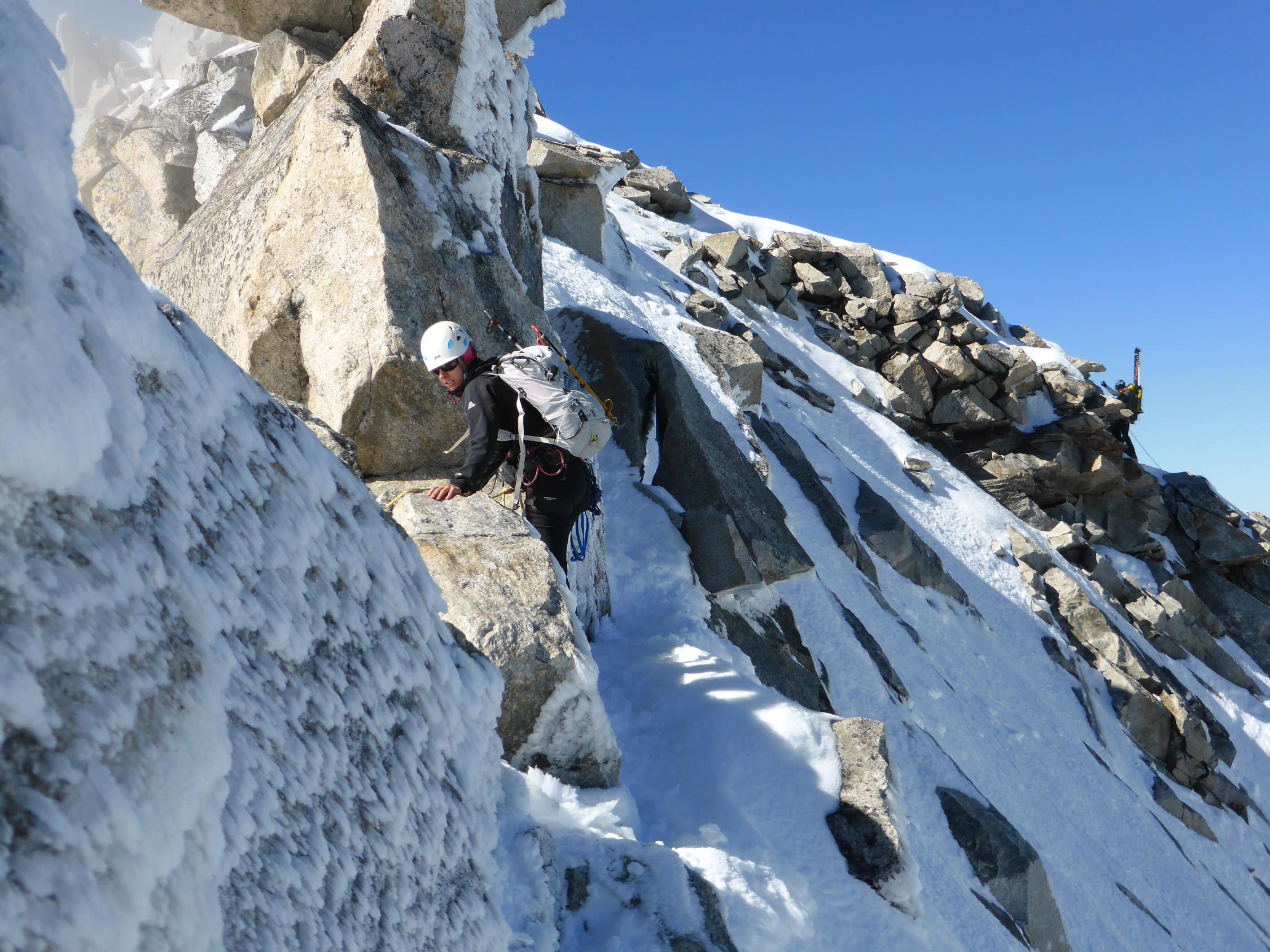 Eine herbe Entäuschung war die Drahtseilversicherung am Einstieg des Grates, Unglaublich was manche Leute sich erlauben, quer durch den allerschönsten Granit mit Rissen,Schuppen und Leisten, schönstes UIAA IIIer Gelände, ein Drahtseilgeländer zu bauen, Hier wurde wiedermal mit Kanonen auf Spatzen geschossen, wer hat das zu verantworten, ein paar Bohrhaken an geeigneter Stelle hätten das ganze nicht derart verschandelt und einen alpinen Klassiker belassen wie er immer schon war.