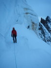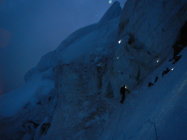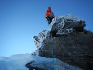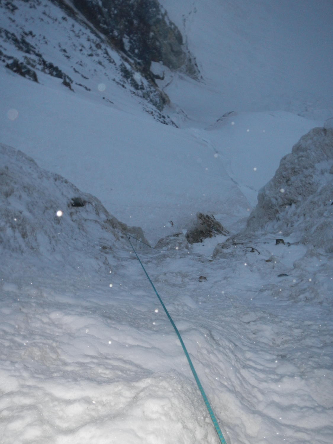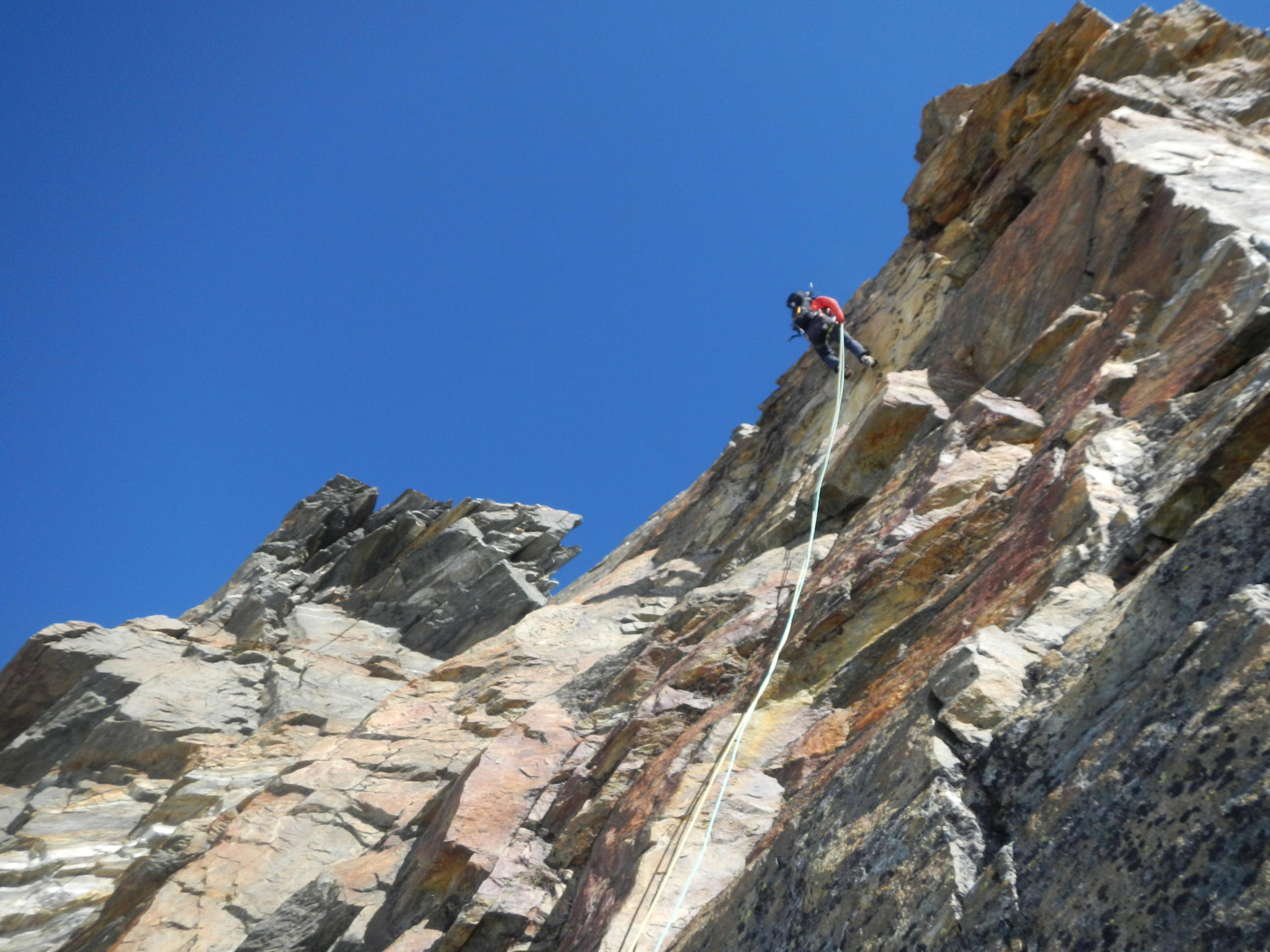 Abstieg auf die italienische Seite: Sehr viel Schnee in der Wand, so dass wir die etwas weiter unten eingerichteten Abseilstellen benutzen mussten.