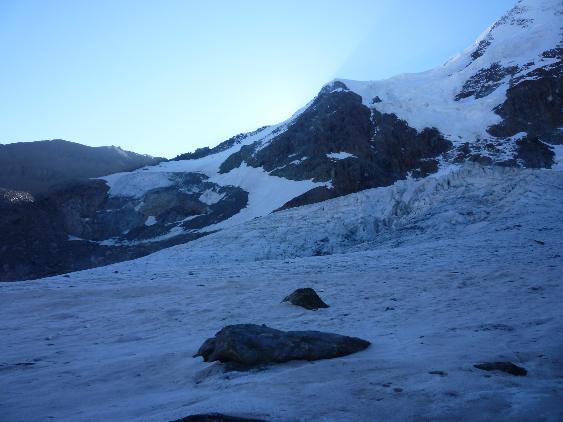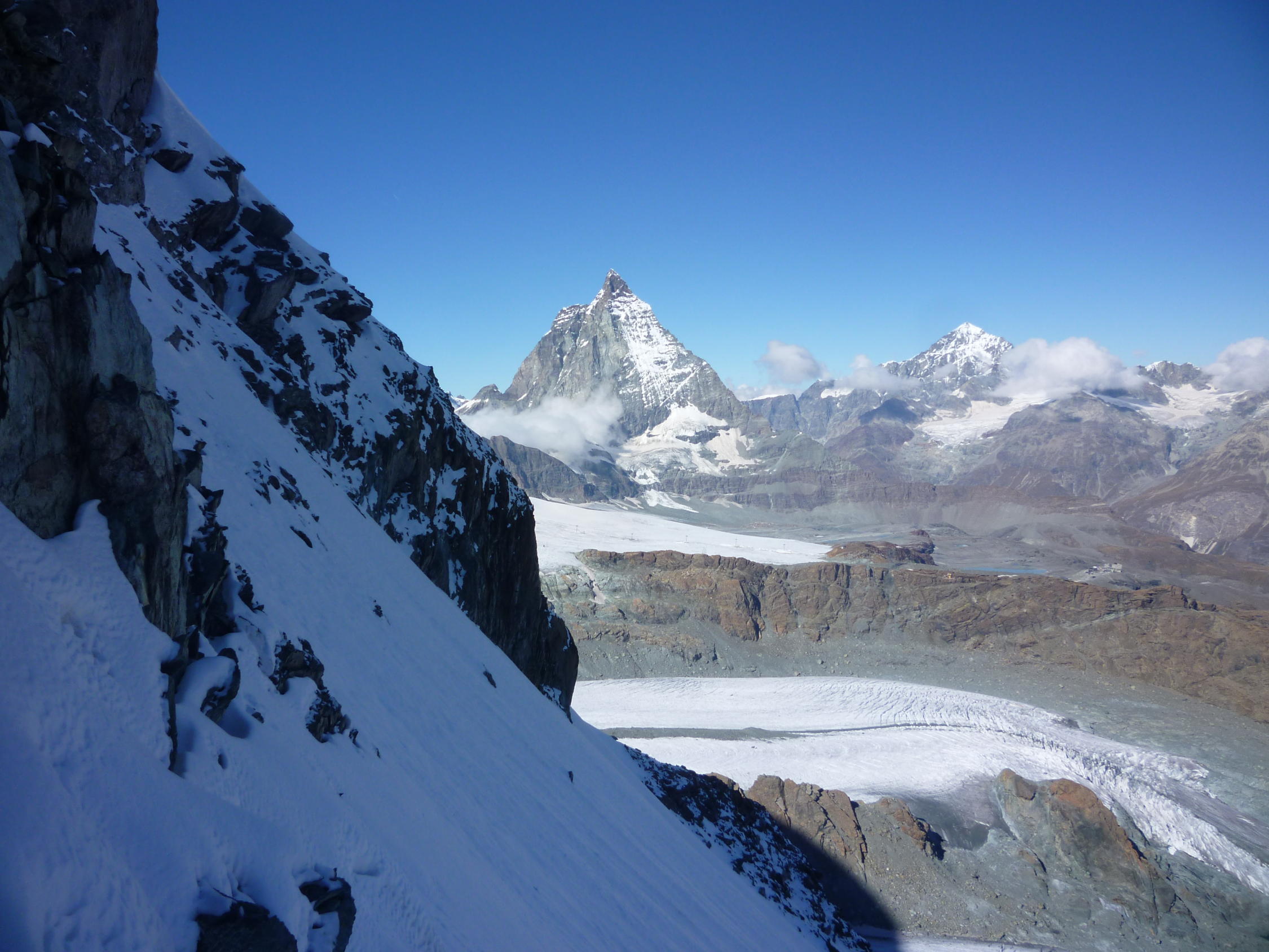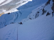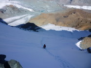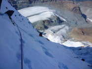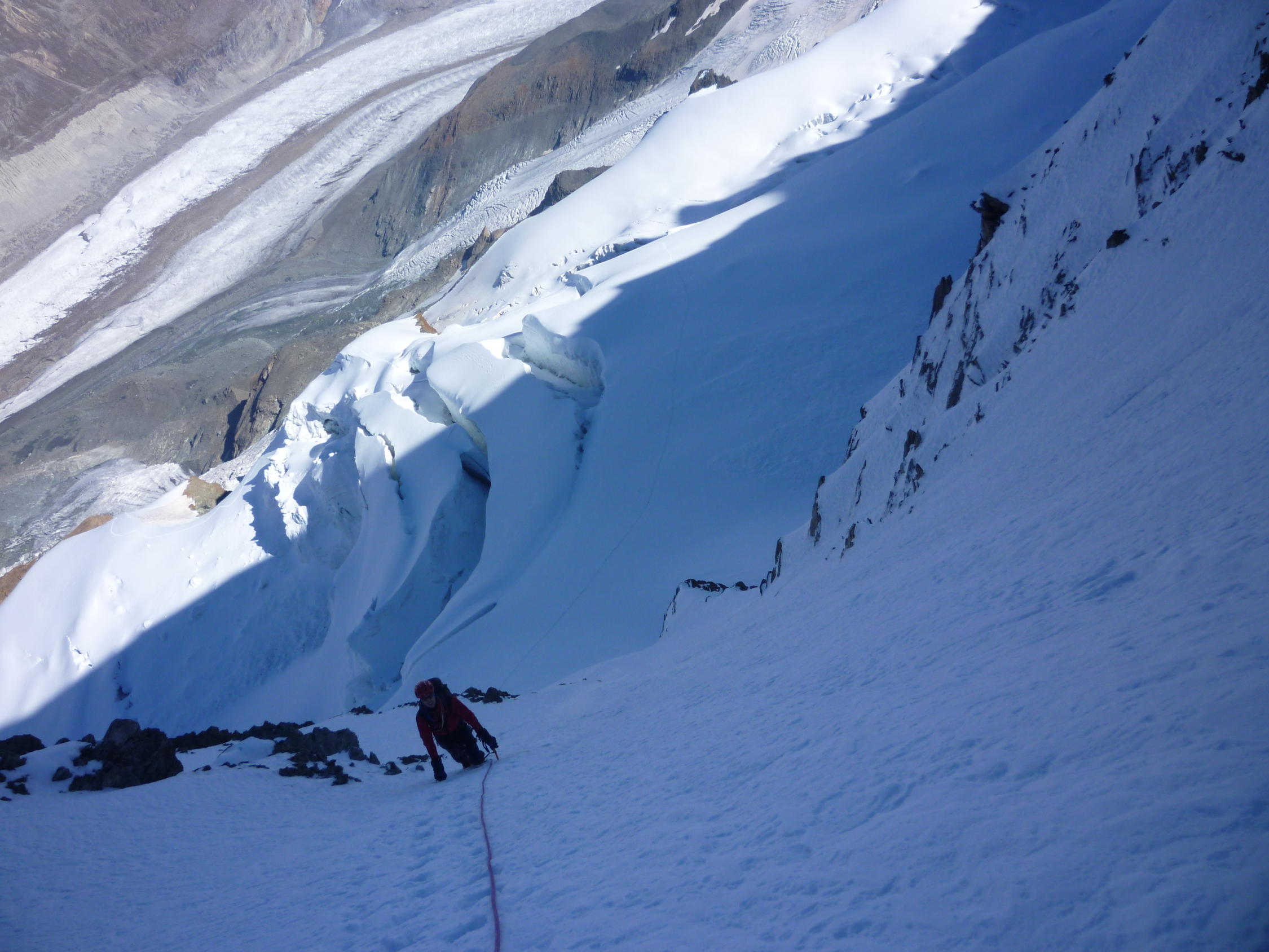 Die Verhältnisse sind derart gut, dass sich der Triftigrat momentan als Tagestour durchführen lässt. Die beiden grossen Spalten bei ca. 3300 m rechts des Triftigrates sind durch solide Brücken gedeckt, so dass seilfreies Gehen bis zum zerschrundeten Bereich unterhalb des Triftiplateaus vertretbar ist. Wir sind exakt der Linienführung aus Daniel Silbernagels Topoführer Walliser Alpen gefolgt, dabei ab Triftisattel fast durchgehend guter Trittschnee, wenn teilweise auch bereits etwas hart. Einzig am Triftiplateau - wie schon im letzten Eintrag zur Tour vom 1.10. knietiefes Einsinken. Oberhalb des Bergschrundes auf ca. 3800 m ist die Schneeauflage teils etwas dünn, daher 2 x mit Schrauben zwischengesichert. Fels mit Kletterstellen 3a fanden wir nicht, entweder weil überschneit oder wir auf falscher Fährte... Das was an Fels vorhanden ist eignet sich aber um mit Friends 0,5 - 1 zwischenzusichern, da auch dort die Firnauflage manchmal etwas dünn ist. Die Wand hat keine Sonne mehr, dh. die Verhältnisse werden sich bis zum nächsten grösseren Schneefall nicht mehr ändern. Bis zum nächsten grösseren Niederschlag (max. 10 mm im Raum Zermatt, persönliche Einschätzung) bleibt die Route in diesem Zustand, danach ist fertig.