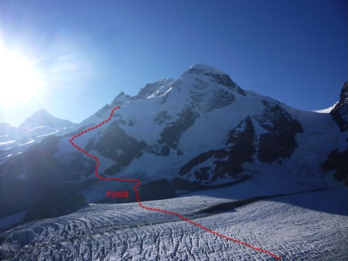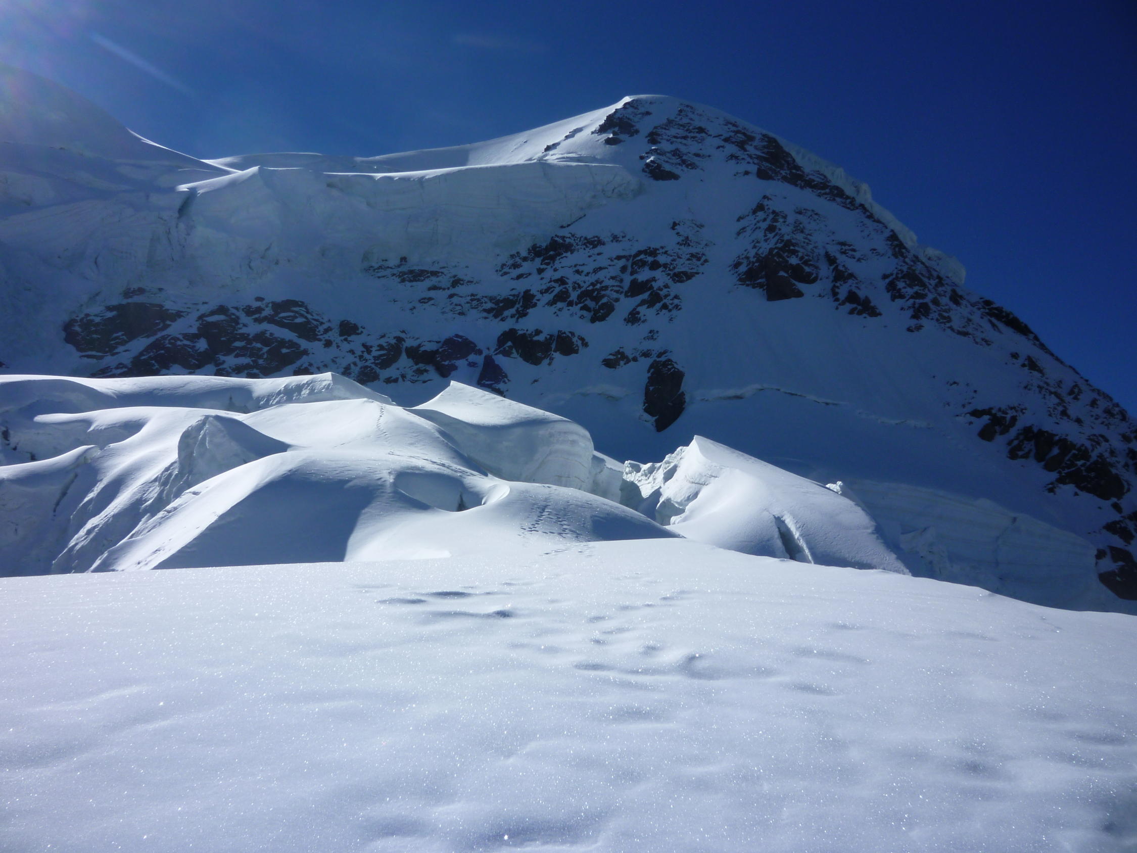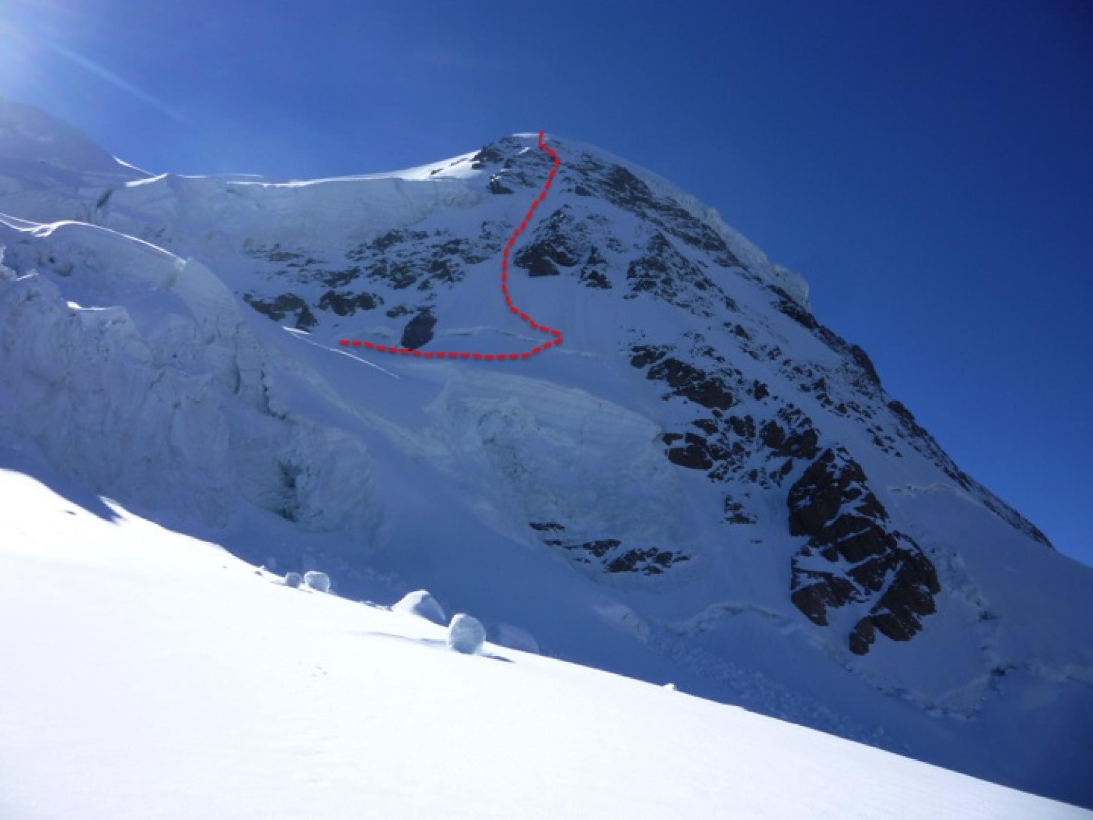Die Verhältnisse sind derart gut, dass sich der Triftigrat momentan als Tagestour durchführen lässt. Die beiden grossen Spalten bei ca. 3300 m rechts des Triftigrates sind durch solide Brücken gedeckt, so dass seilfreies Gehen bis zum zerschrundeten Bereich unterhalb des Triftiplateaus vertretbar ist. Wir sind exakt der Linienführung aus Daniel Silbernagels Topoführer Walliser Alpen gefolgt, dabei ab Triftisattel fast durchgehend guter Trittschnee, wenn teilweise auch bereits etwas hart. Einzig am Triftiplateau - wie schon im letzten Eintrag zur Tour vom 1.10. knietiefes Einsinken. Oberhalb des Bergschrundes auf ca. 3800 m ist die Schneeauflage teils etwas dünn, daher 2 x mit Schrauben zwischengesichert. Fels mit Kletterstellen 3a fanden wir nicht, entweder weil überschneit oder wir auf falscher Fährte... Das was an Fels vorhanden ist eignet sich aber um mit Friends 0,5 - 1 zwischenzusichern, da auch dort die Firnauflage manchmal etwas dünn ist. Die Wand hat keine Sonne mehr, dh. die Verhältnisse werden sich bis zum nächsten grösseren Schneefall nicht mehr ändern. Bis zum nächsten grösseren Niederschlag (max. 10 mm im Raum Zermatt, persönliche Einschätzung) bleibt die Route in diesem Zustand, danach ist fertig.