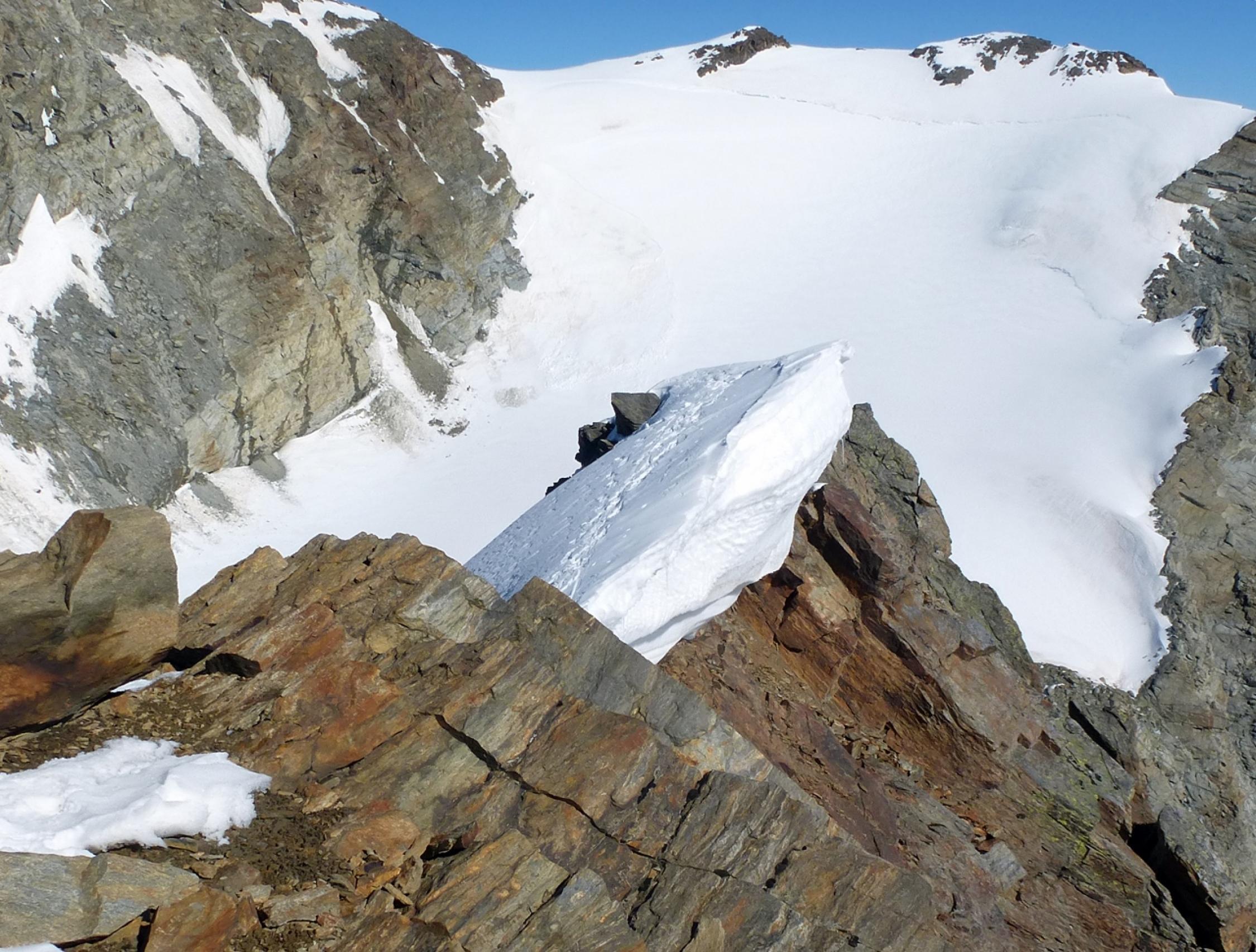 Beste Verhältnisse für die Tour! Einstieg auf den Grüebugletscher bei P3400 über guten trittfesten Firn. Auf dem Gletscher selbst nur ganz kurze apere Stellen. Gut sichtbare Aufstiegspur, wenig Spalten. Abstieg vom Fletschhorn zum Joch in angenehmem Firn. Nordgrat ist noch ziemlich schneebedeckt, was den Grat aber eher einfacher macht, da trittfester Firn. Allerdings auf Wechten achten, die sind zum Teil sehr abenteuerlich. Im Abstieg vom Lagginhorn zum Grat einige vereiste Stellen, die aber wegen der häufigen Begehung recht griffig sind.