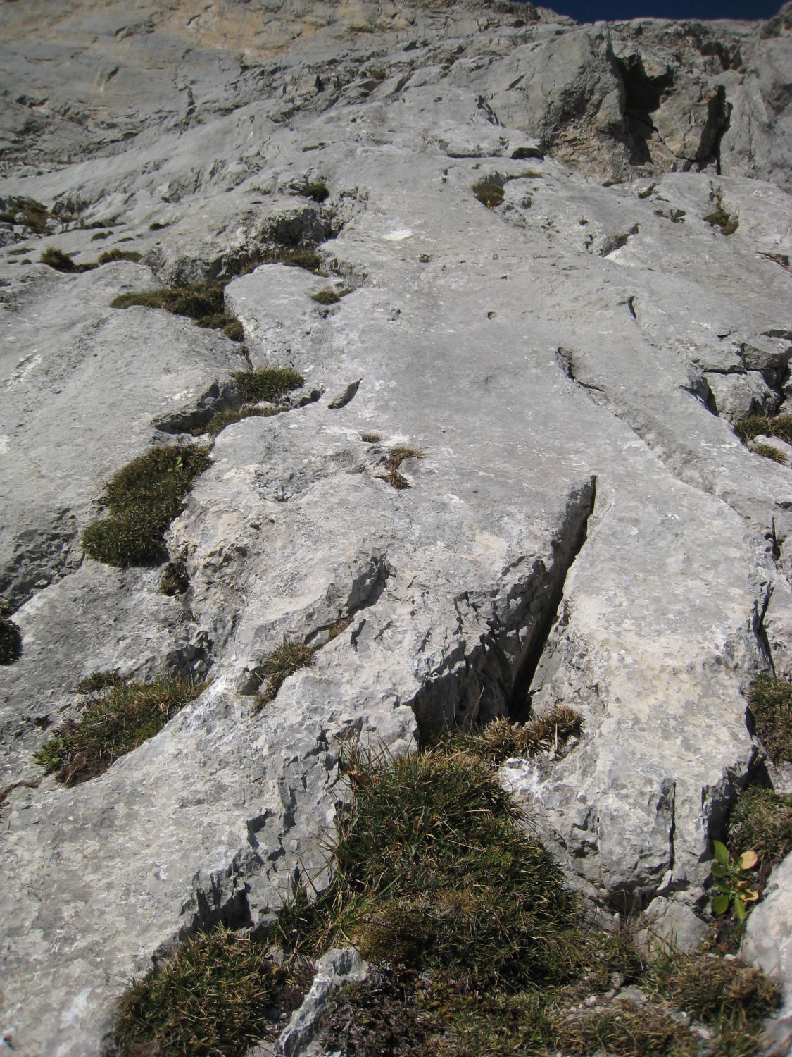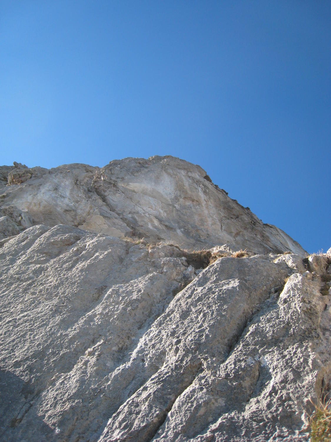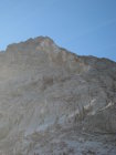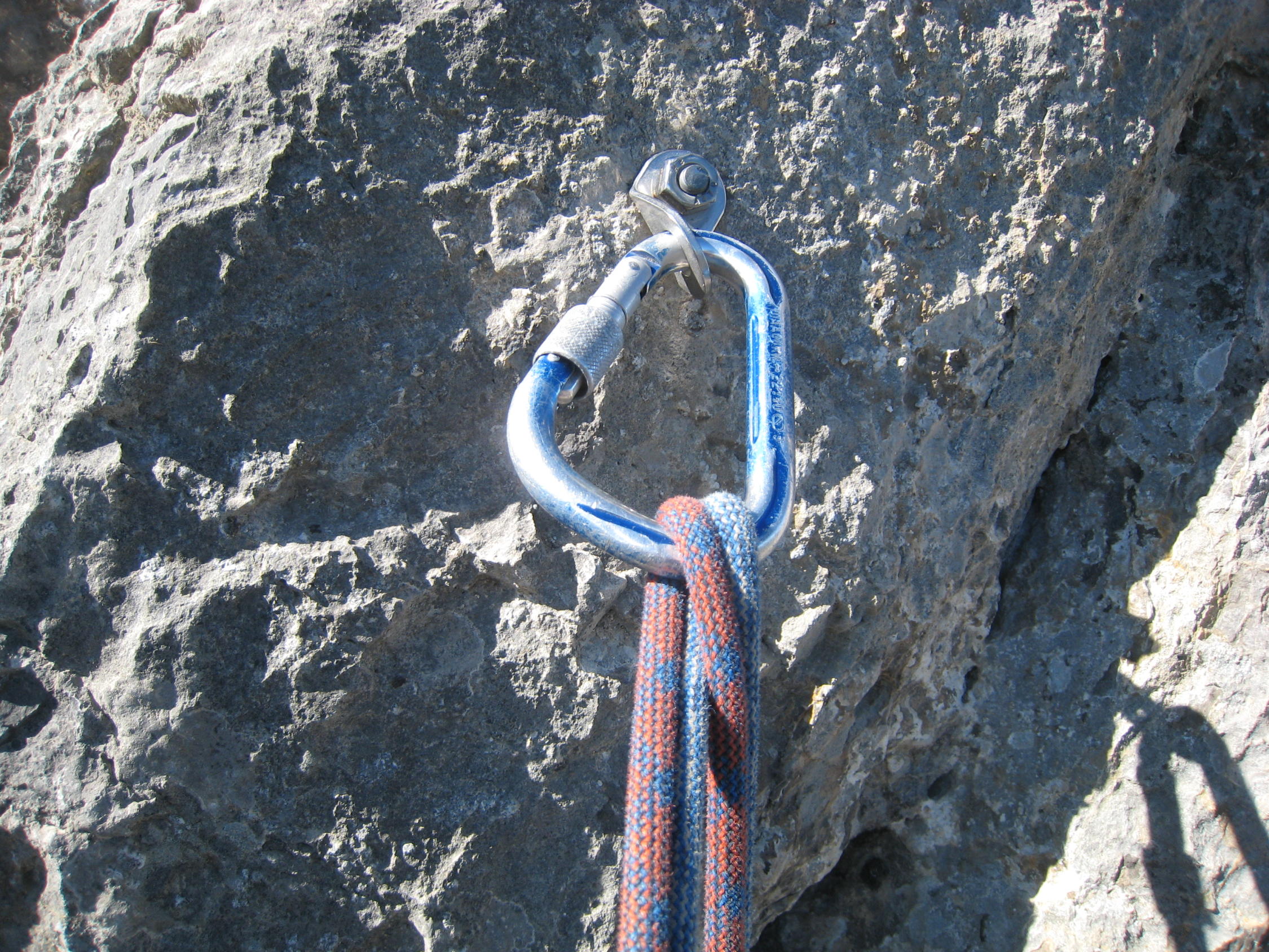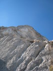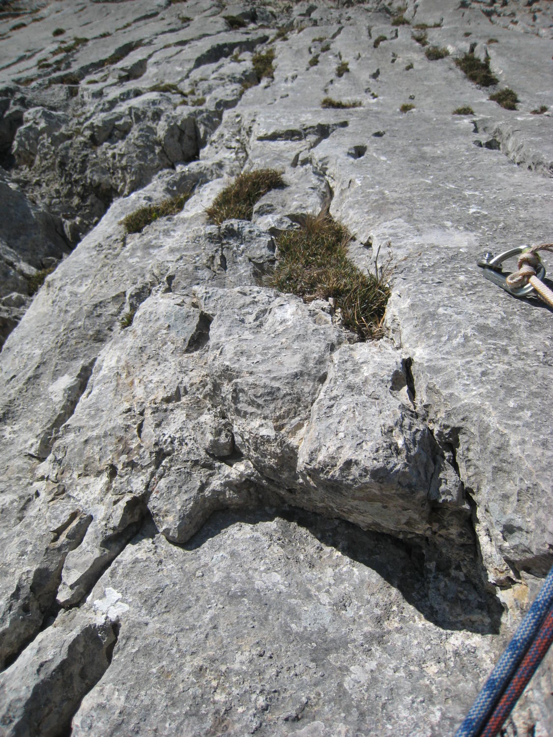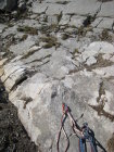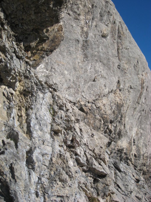 Zum Zustand der Route: hatten nicht die Infos vom Felssturz mitbekommen, ergo mal so "blank" eingestiegen. Bitte unbedingt den Eintrag von Seilbahn-Cüci vom August 2014 nachlesen und ernst nehmen! Durch den Wind wurde recht viel Gestein/Sand in der Gegend herumgewirbelt, schlussendlich dann auch festgestellt, wo das ganze Zeug herkam - von überall her, weil alles voll war damit durch den massiven Ausbruch vom Sommer! Die einfachen Passagen am Ende mancher SL sind sehr bedeckt mit Schotter/Sand, nicht so schön zu gehen mit Kletterfinken. Die Kletterpassagen der SL1-4 sind ok, ebenso alle Haken und Stände, die Abseilstände sind ebenfalls 100% in Ordnung, Muttern evtl. mal nachdrehen. SL 5+6 existieren wie gesagt nicht mehr, am 3. Haken der 5.SL ist ein HMS, der hängt da nicht umsonst, wie wir dann festgestellt haben (Foto), also spätestens da umkehren und nicht (wie ich) weiterklettern und plötzlich im Nirvana stehen...Rückzug ging gerade noch so in der 7m weiter links befindlichen überhängenden Verschneidung. Alles oberhalb ist Brösel. Also Alternativausstieg machen oder gleich ne andere Route wählen?! Steinschlagtechnisch war's ok, eher der Sand, der durch den starken Wind durch die Wand befördert wurde, war unangenehm. Allerdings muss man die Situation als heikel betrachten, wenn da oben was runterkommt, dann endet das wohl nicht so gut. Muss jeder selber wissen - ich denke, ich wäre nicht eingestiegen, wenn ich die Infos gehabt hätte. Lerneffekt: nicht nur nach Topos suchen (Plaisir Ost ist gut, aber wollte mehr Infos), sondern auch nach Felsstürzen :)