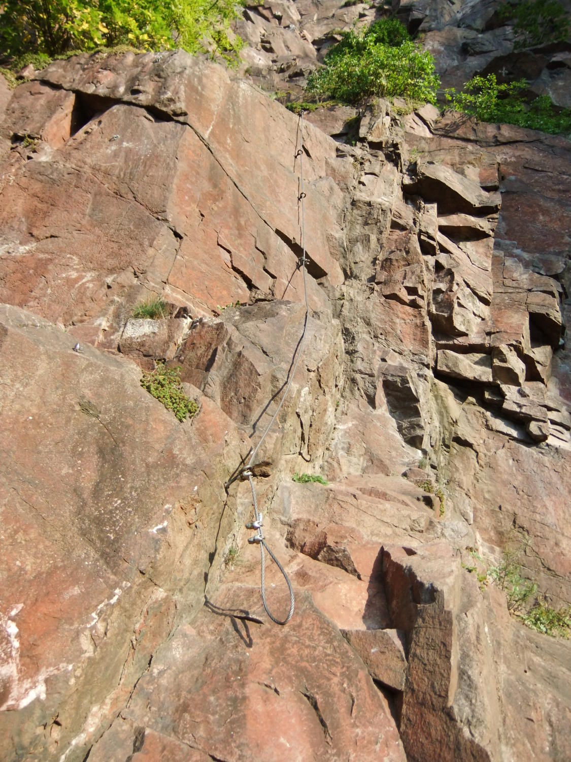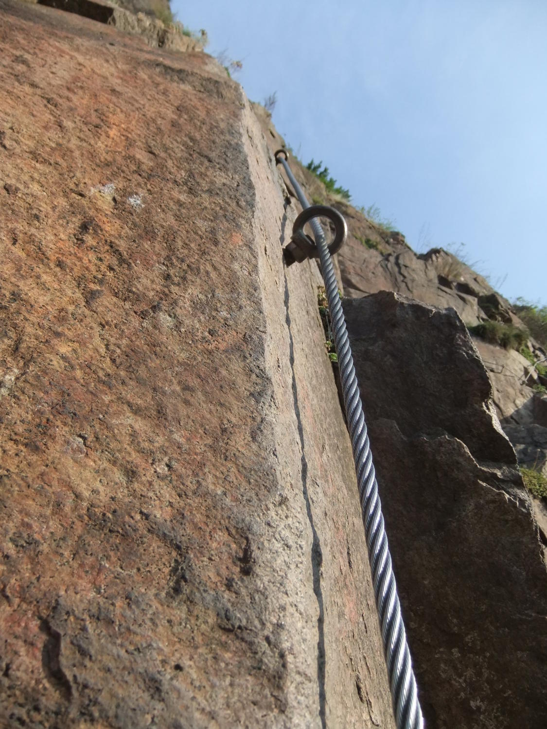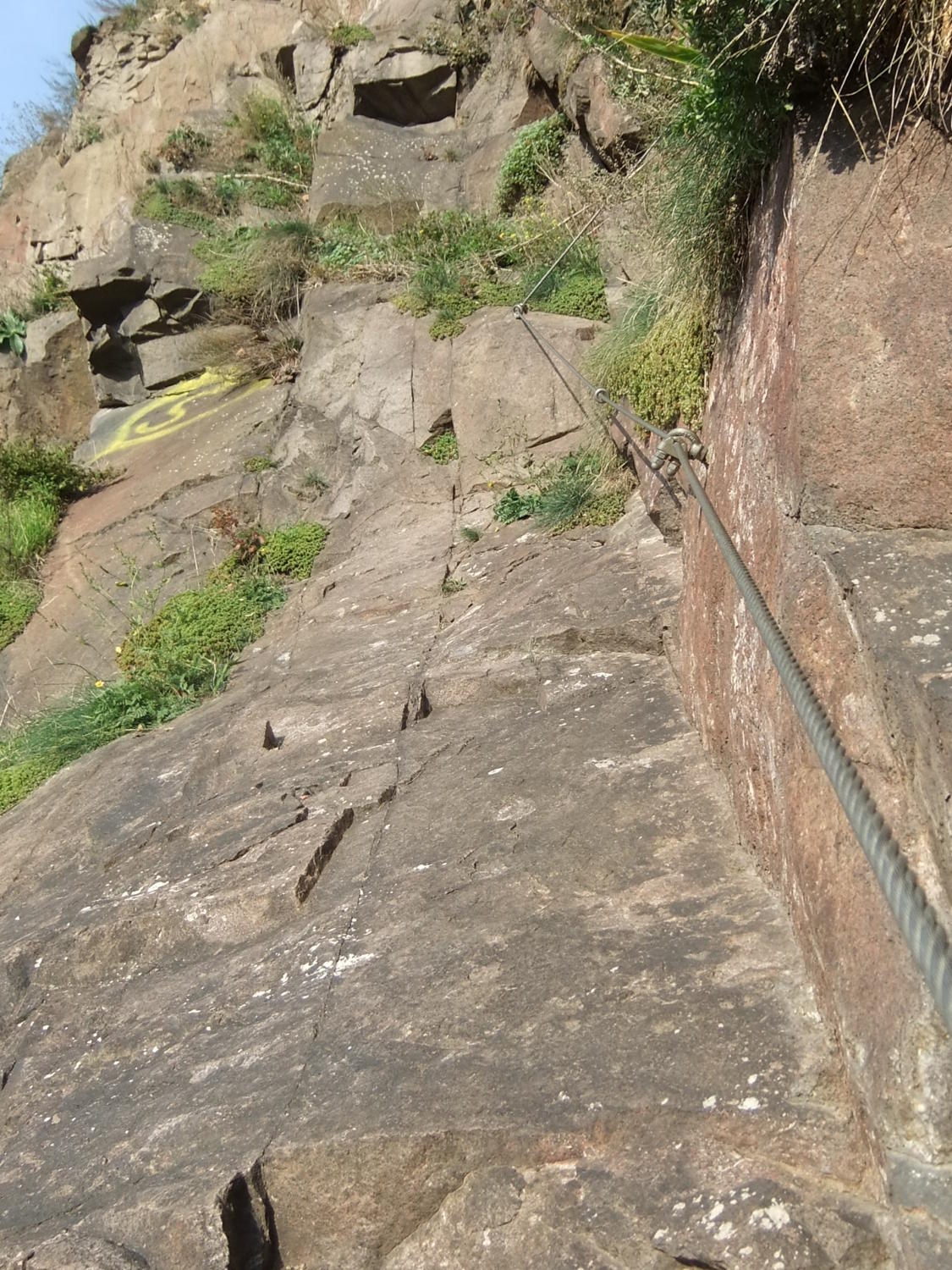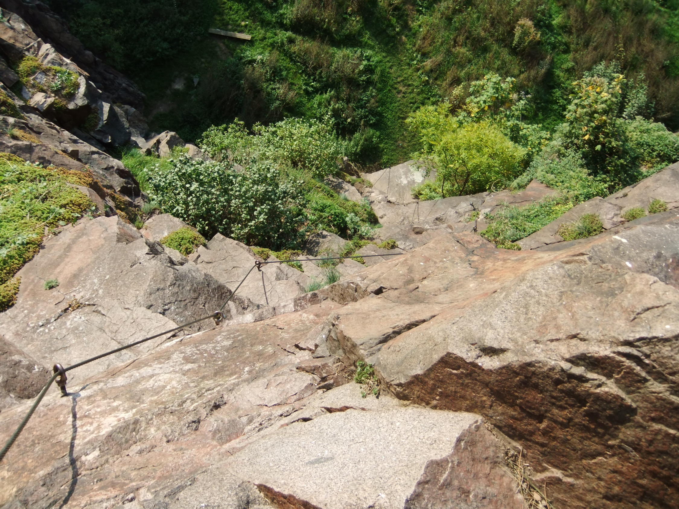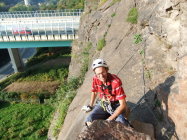 Der glatte Fels ist gewöhnungsbedürftig. Kletterschuh-Sohlen bewähren sich, wenn sie bis zum Einstieg trocken blieben.
