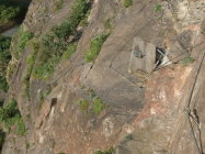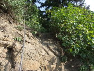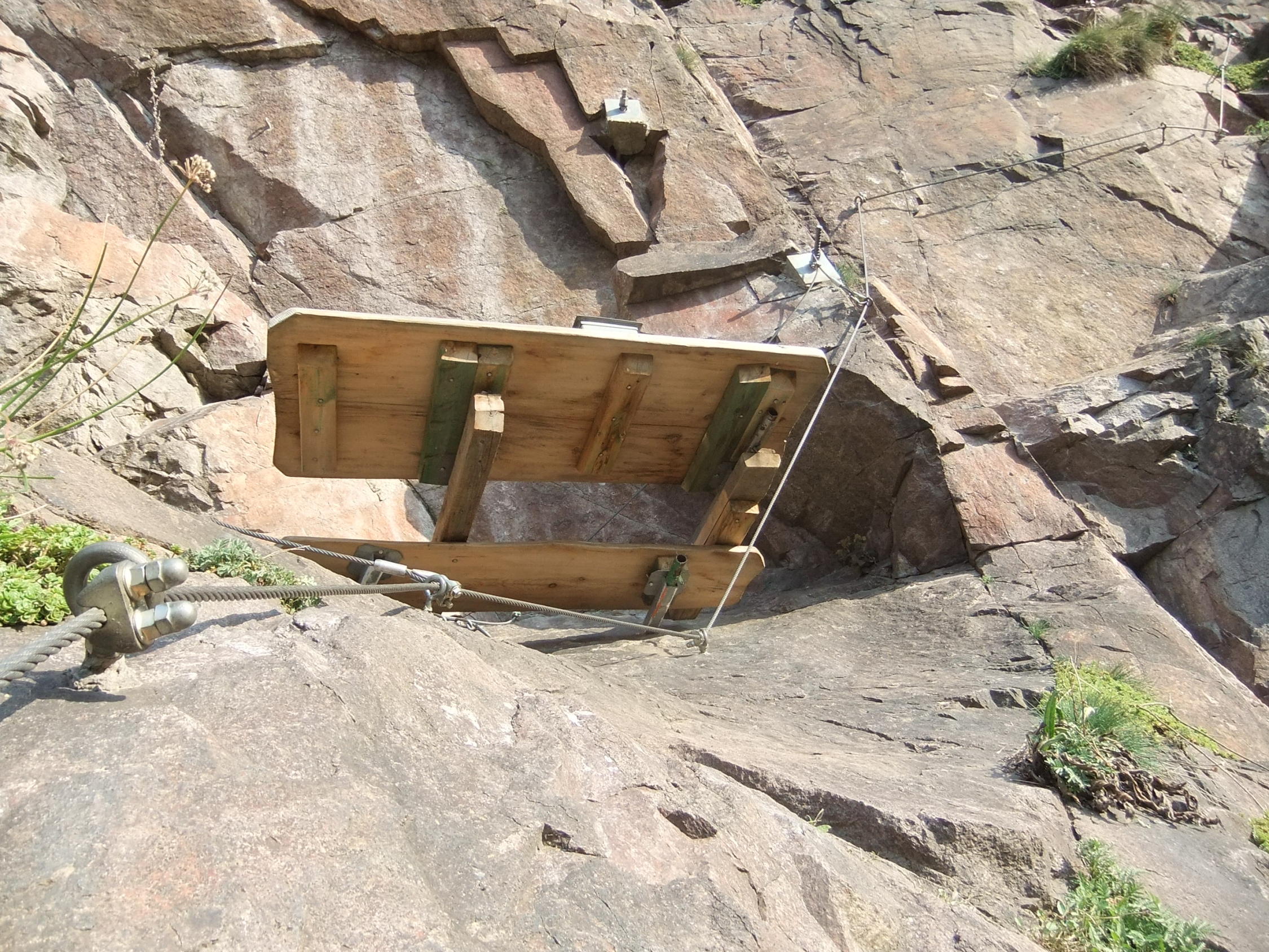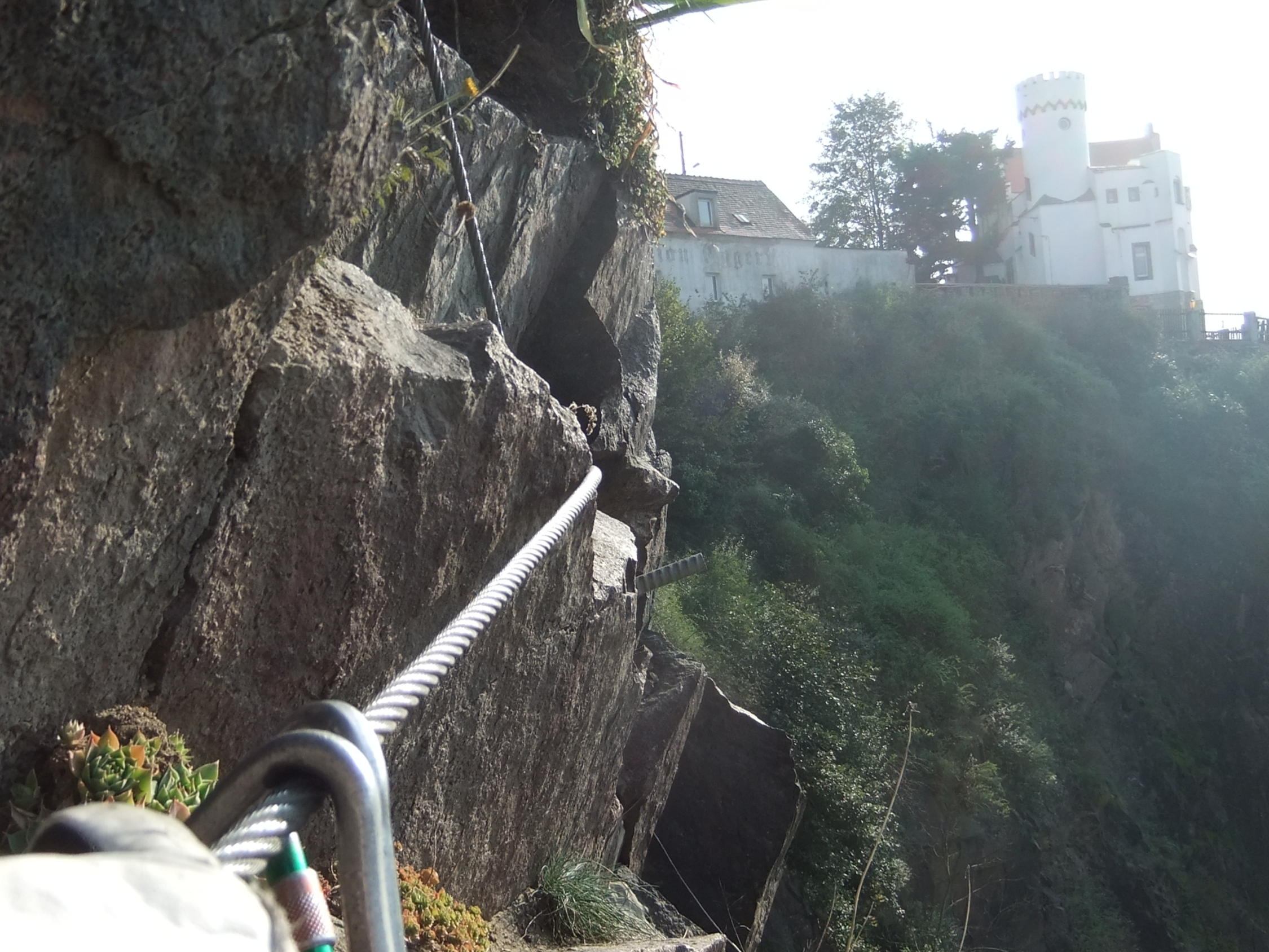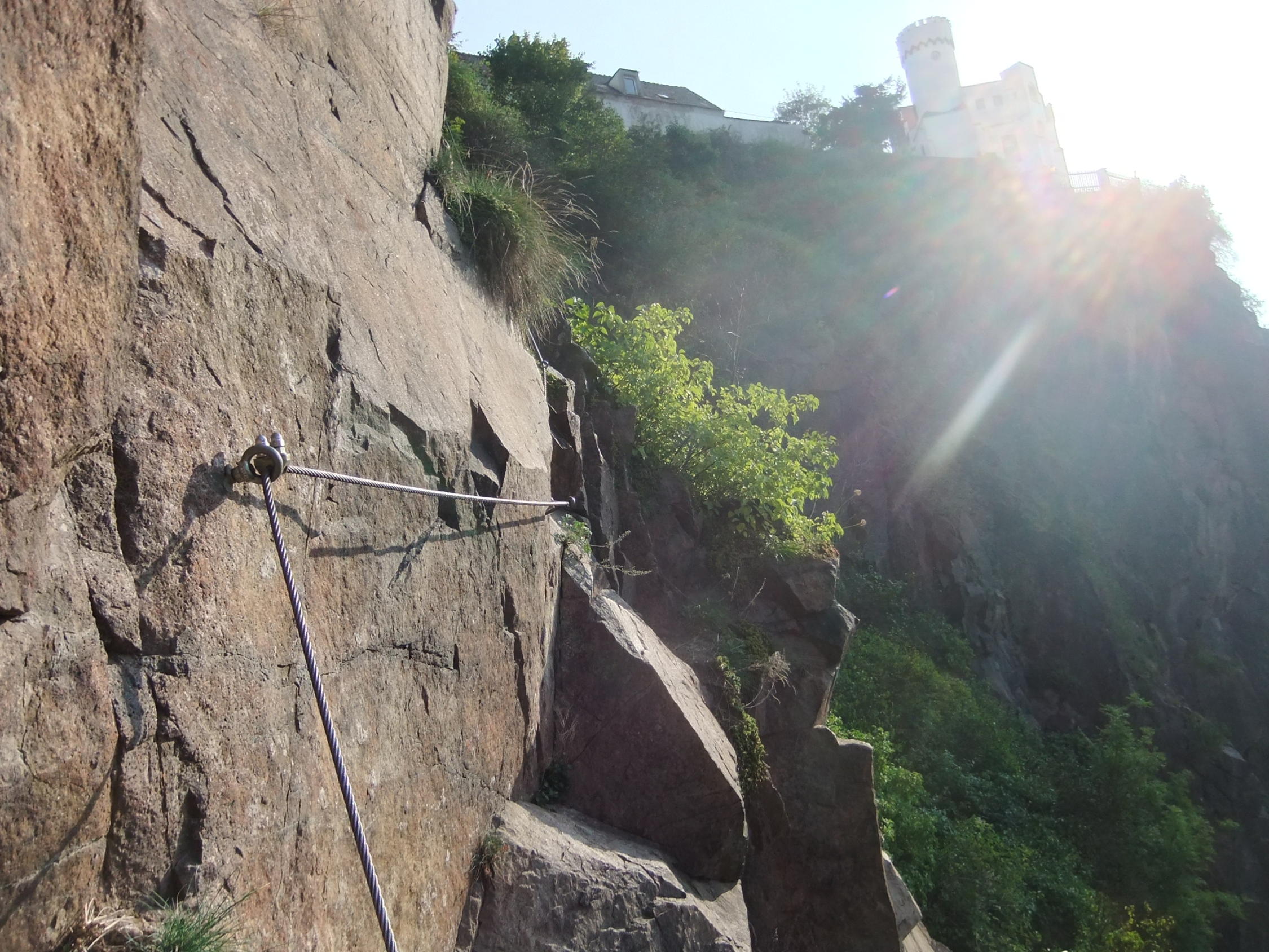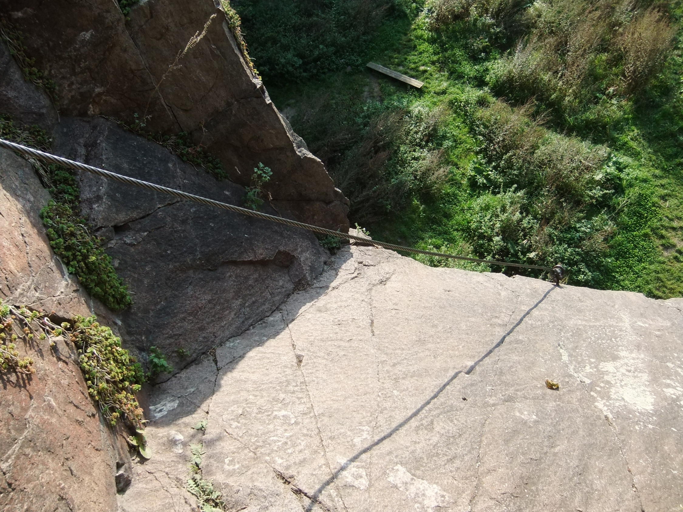 Der glatte Fels ist gewöhnungsbedürftig. Kletterschuh-Sohlen bewähren sich, wenn sie bis zum Einstieg trocken blieben.