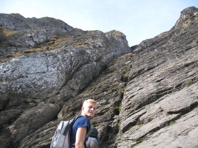 Wilde und sehr einsame Umgebung; heute schön und trocken. Kaum hatten wir den Kamin verlassen, kamen wir aber voll in den Föhn. Deshalb haben wir uns mit dem Ostgipfel begnügt und den ziemlich exponierten Weiterweg für ein anderes Mal aufgehoben.