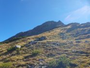 Ältere Hiker Einträge erwähnen hier den Aufstieg über einen Jägerpfad vorzuziehen. Ich erkenne da diesen Pfad jedoch nicht, resp. verliere ihn unterhalb der Felsen, so, dass ich das Suchen aufgebe und meine eigene Nase folge. Ich steige in der W-Flanke und kraxle einige Rinnen und Felsstufen in schönem Gelände hoch zum S-Grat (T5, II). Zuletzt erkenne ich einen Pfad in der W-Flanke parallel von meinem Aufstieg, jedoch leicht nördlich davon. Ab dem S-Grat gehe ich im Gehgelände sehr einfach zum Piz S-chalambert Dadora (P2679) mit Steinmann und Gipfelkreuz, aber ohne Gipfelbuch. Ab hier sieht der grössere Bruder, der Piz S-chalambert Dadaint furchteinflössend aus. Aber der Schein trügt zum Glück auch hier.