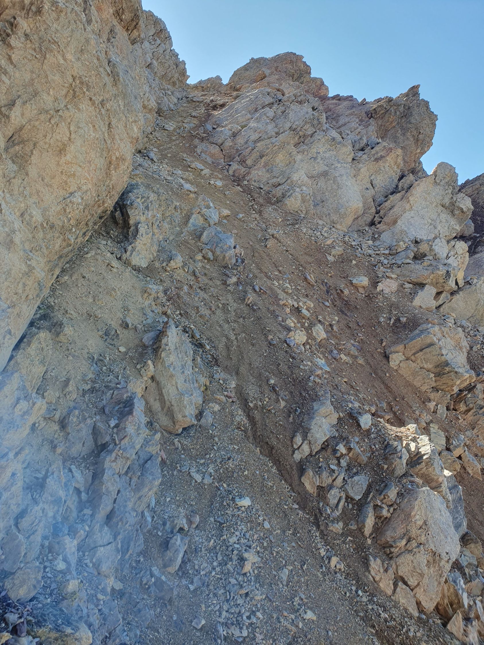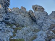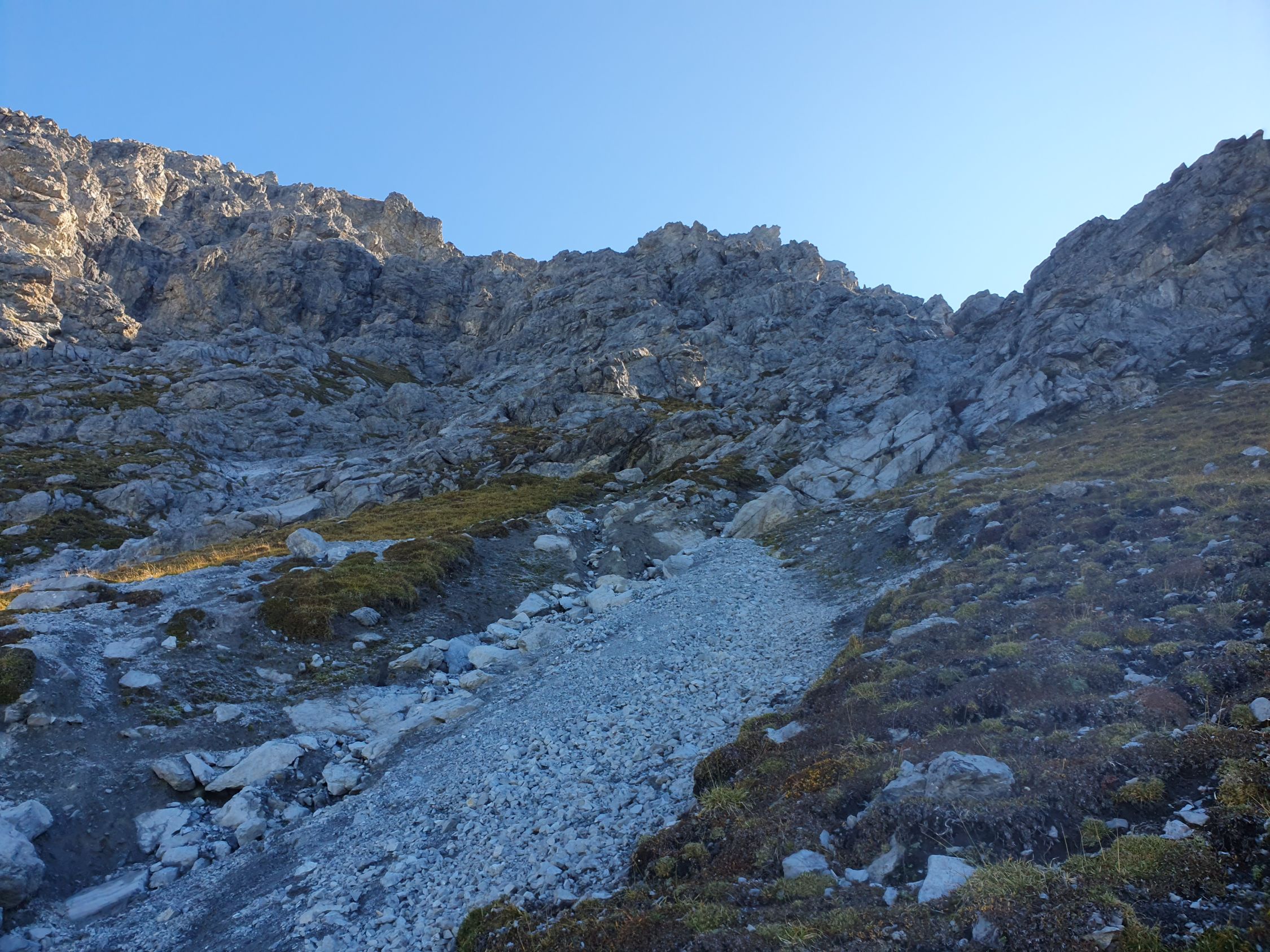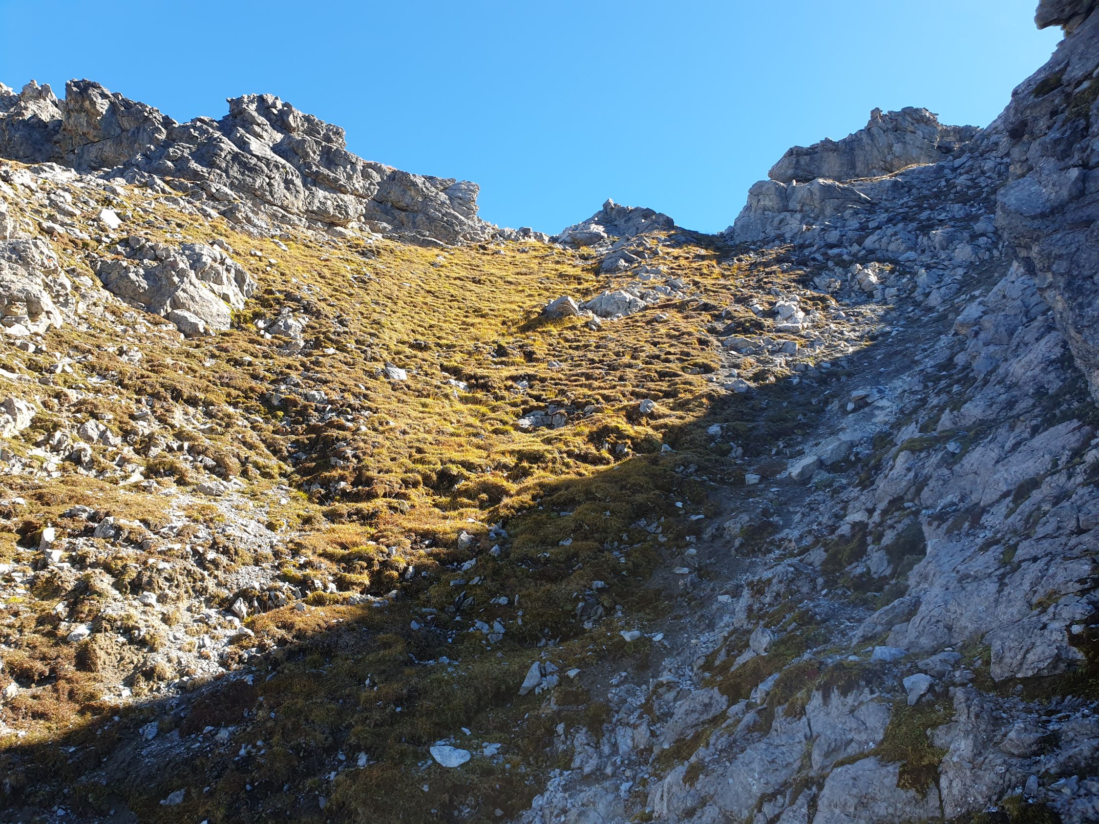 Ab hier steige ich etwas anspruchsvoller südlich, resp. rechts, über einen kurzen leicht ausgesetzten Band (unten ist es einfacher als oben) zu einer steilen sandigen Rinne, wo ich oben zu einem dritten Sattel bei ca. 2895 Hm ankomme, wo ein Steinmann liegt (T5-, I).