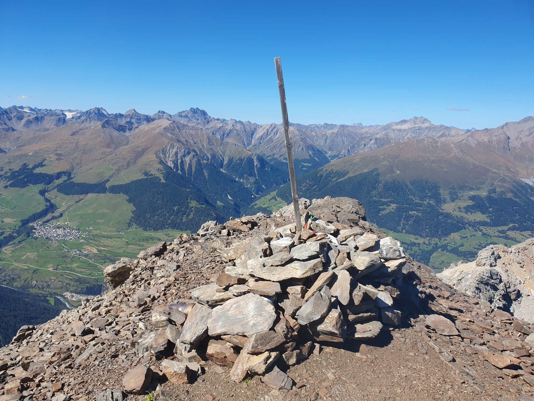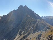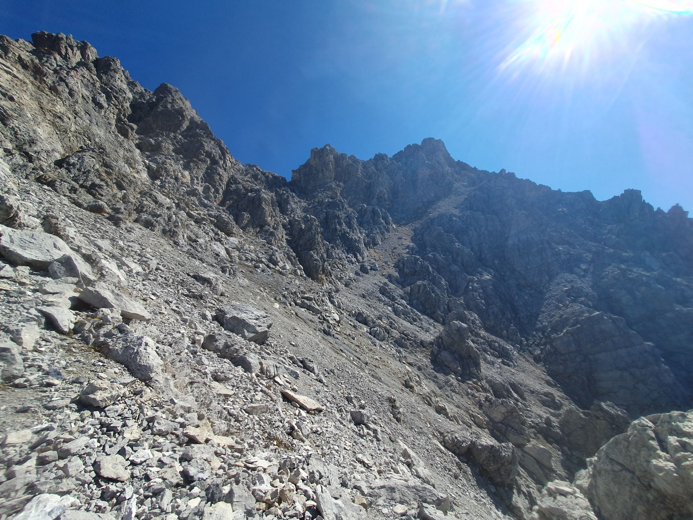 Nun in der SW-Flanke nicht ausgesetzt über Schutt in einfachem Gehgelände nach NE hoch zum N-Grat und einfach hinüber zum Piz S-chalambert Dadaint mit Stock und Gipfelbuch (T4, I).