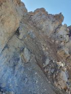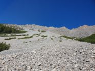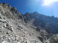 Auf ca. 2791 Hm erreiche ich in der W-Flanke einen ersten Sattel, wo ich den weiteren Wegverlauf gut einsehen kann. Ich traversiere weiterhin die W-Flanke zuerst flach auf Schutt und später steil auf sandigem Kies zu einem zweiten kleinen Sattel bei ca. 2859, wo ein Steinmann liegt Hm (T4, I).