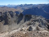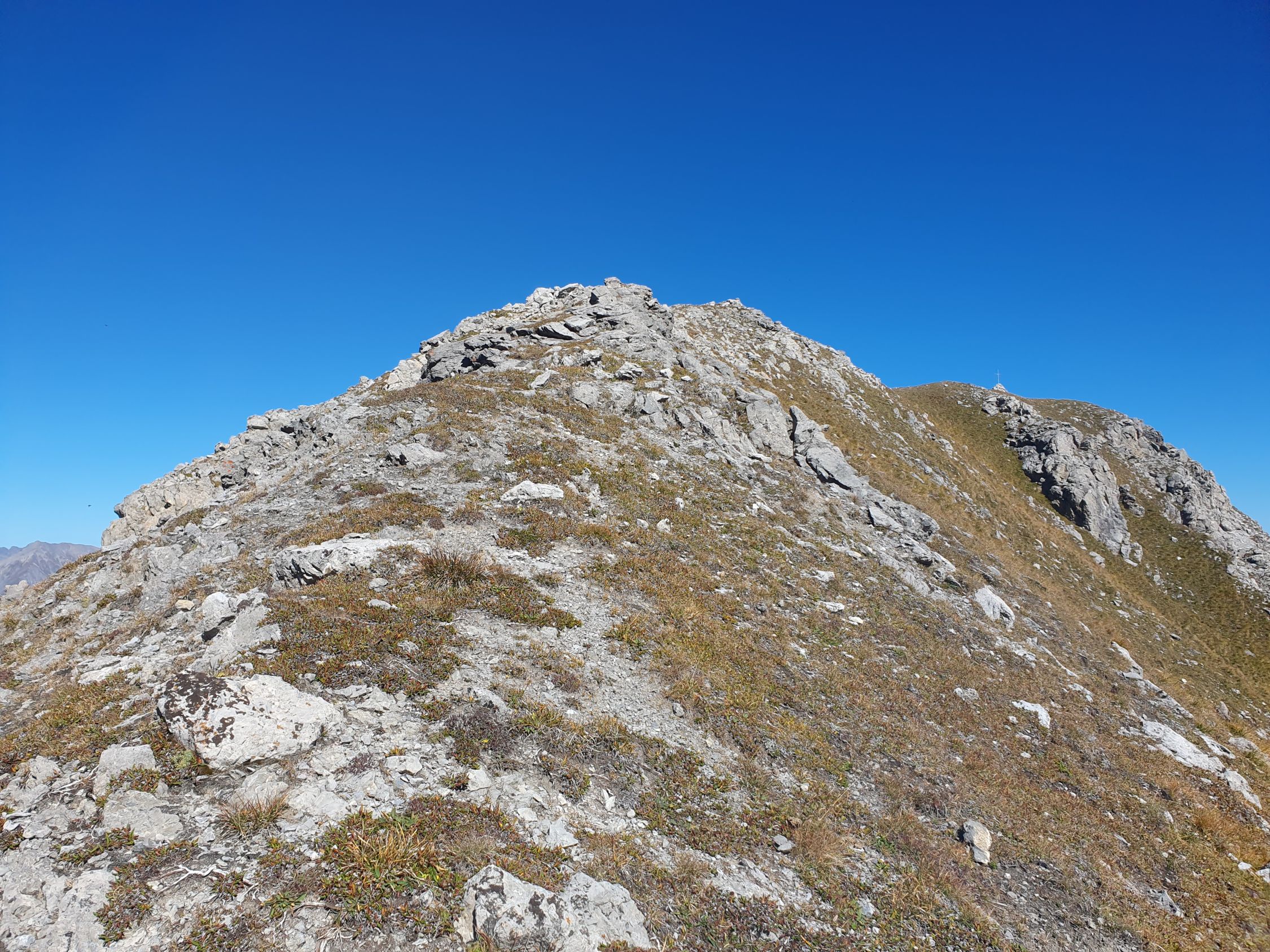 Kurzer Abstieg auf einem Pfad den Grat, oder leicht E davon, hinab zum Sattel bei P2584. Der P2667 umgehe ich in einfachem Gehgelände westlich vom Grat. Nun auf einem erkennbaren Pfad weiter dem Grat folgen bis zum Gipfelaufbau vom Piz S-chalambert Dadaint.