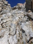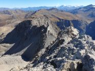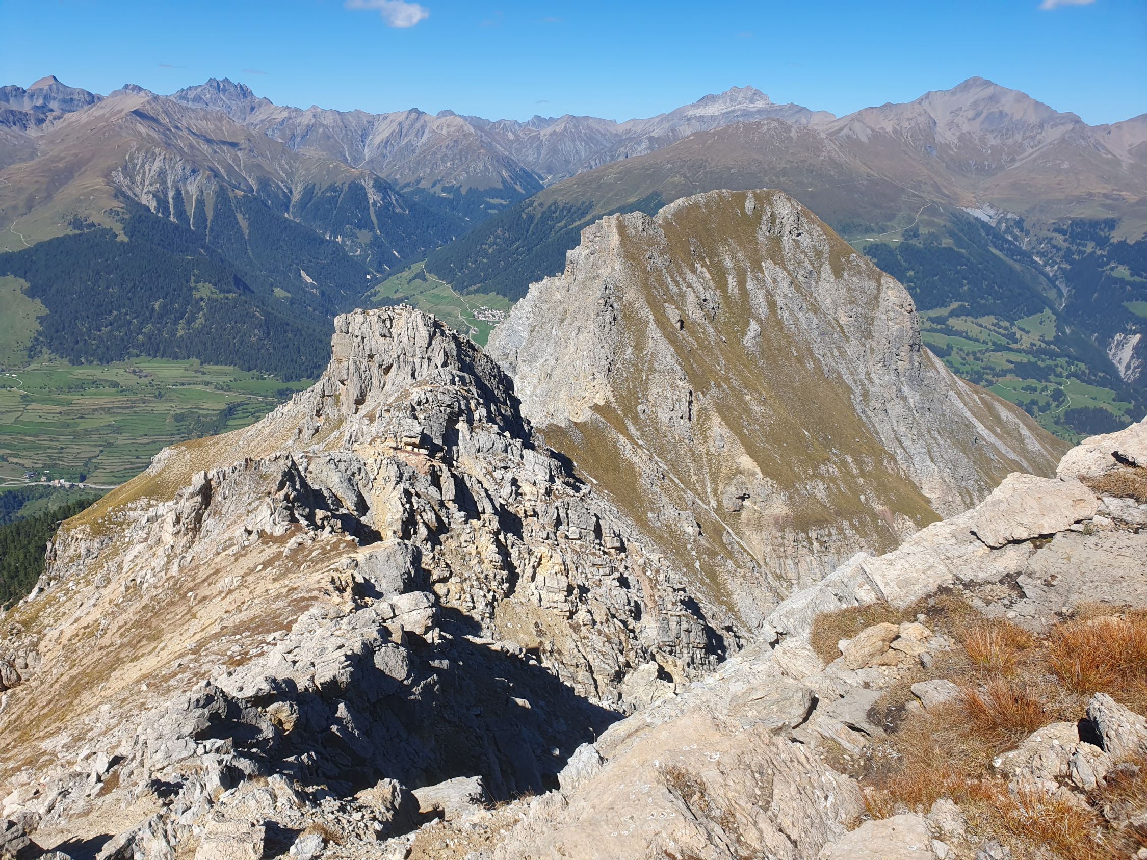 Ich möchte jedoch noch den Piz dal Cuatal anschliessen. Dieser lässt sich nicht direkt auf dem Grat oder SW davon besteigen. Ich komme hier in riesige Felsspalten, die den Grat zu Türmen umgestaltet hat. Ich steige kurz NE vom Grat in Richtung Fora dal Vadret hinab und traversiere den Grat unter den imposanten Felsen und steige so bald wie möglich kurz vor dem Gipfel zum Grat wieder hoch. Nun in einer kurzen Kletterei auf morschem Gestein zum Piz dal Cuatal (T5-, I+). Hier oben habe ich nichts Menschliches ausmachen können: Kein Steinmännli, kein Stock, einfach nichts... Auch liegt der Gipfel auf einem grossen Brocken, der an seiner Stabilität zu zweifeln scheint.