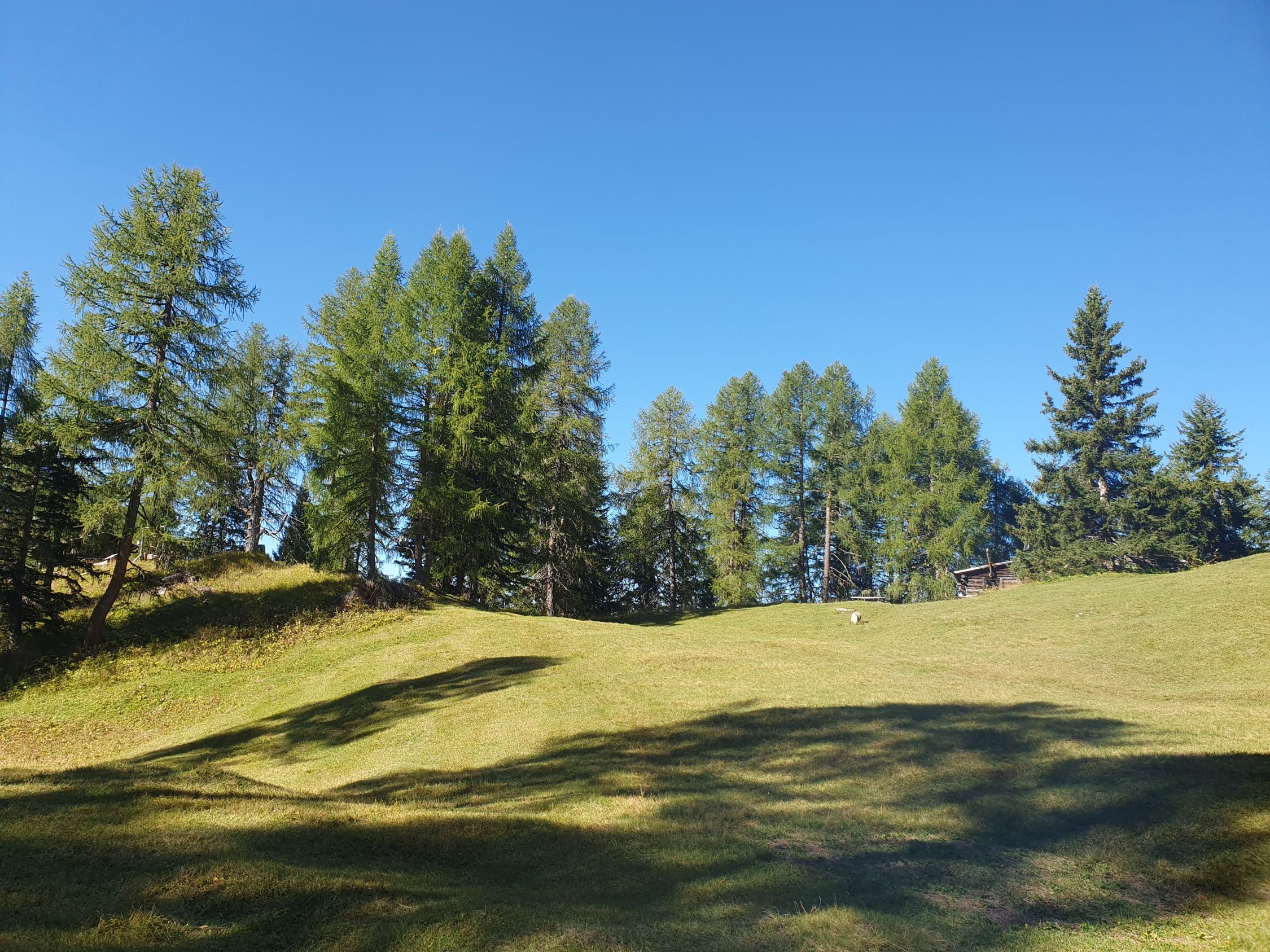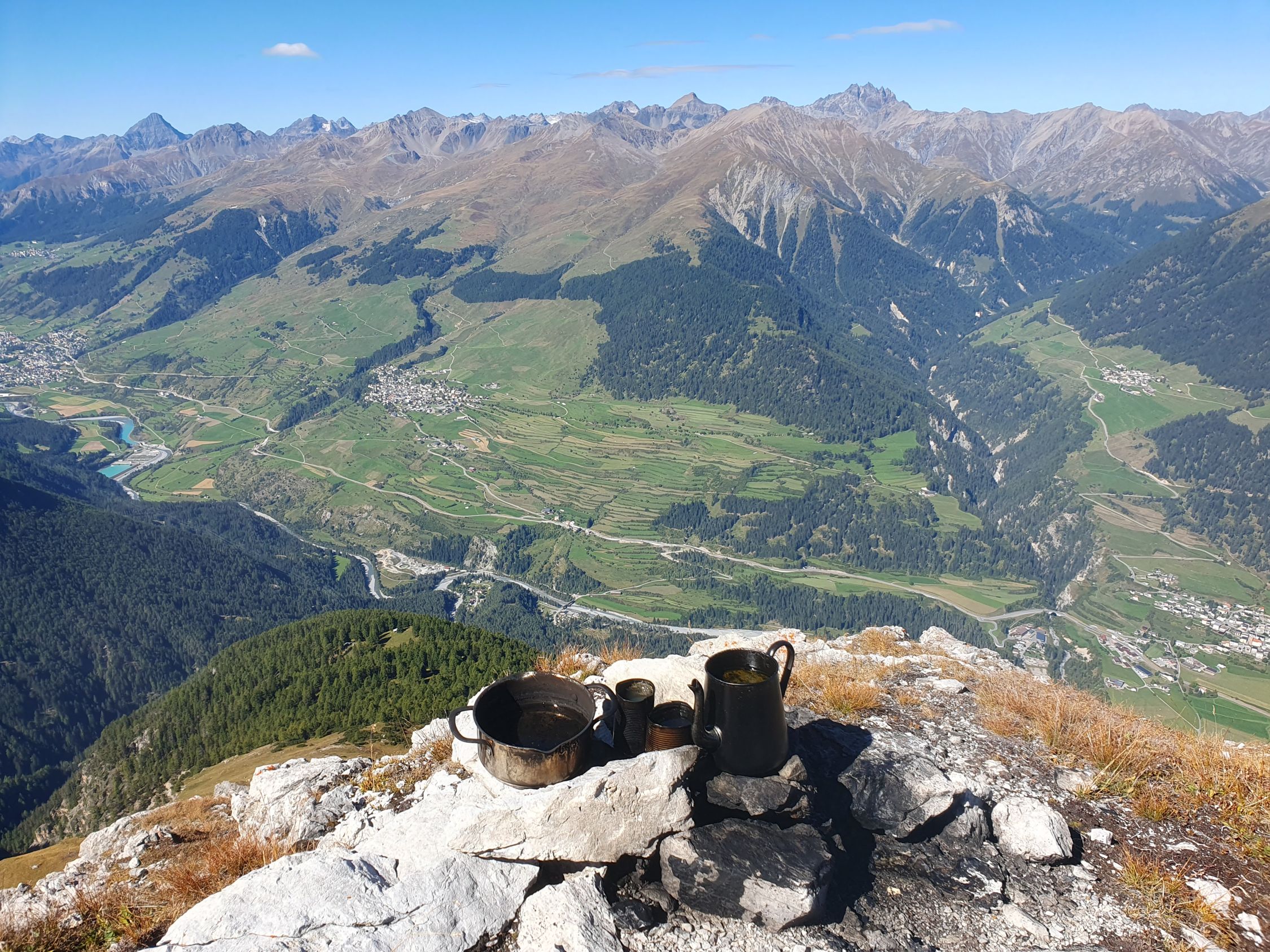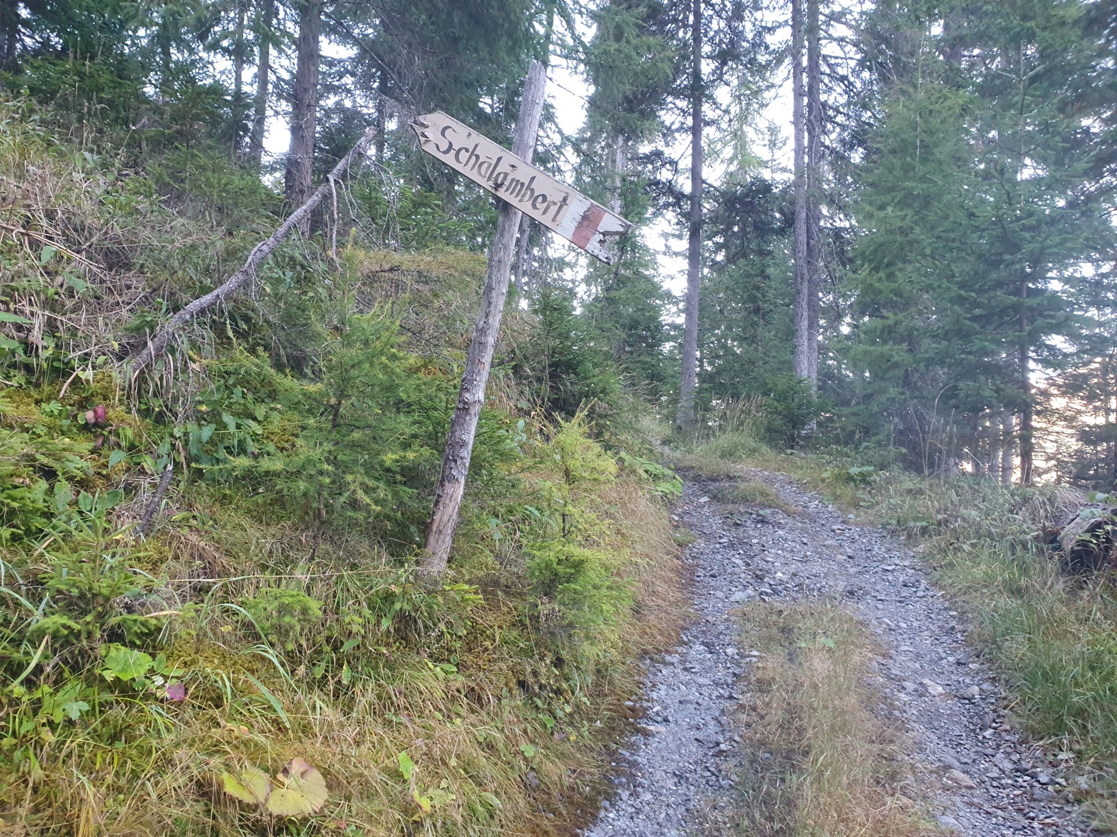 Von der ÖV-Haltestelle "Sent Sur En" auf dem Forstweg der Via dal Munt hoch zu P1189 via P1417 nach P1624. Bis hier wäre der Weg Velotauglich. Nun steige ich ziemlich steil auf einen kleinen Pfad im Wald hoch. Ich kann ab P1624 bis P2069 (S-chalambert) über einen anderen Pfad sehr steil die vielen Kurven abkürzen. S-chalambert liegt in einer schönen Waldlichtung und ist mit zwei Hütten bestückt, jedoch ohne Wasserquelle. Kurz danach, auf dem Wanderweg in NE-Richtung, erreiche ich dennoch die erste und letzte Wasserstelle. Hier unbedingt Wasser tanken! Wie auf der Wanderkarte zu erkennen verliert sich der Wanderweg im Wiesegelände. So steige ich weglos über die Wiese hoch, wobei ich später merke, dass ich ziemlich direkt auf dem W-Grat besser vorankomme als weiter unten. Ich erreiche so ohne Schwierigkeiten P2449. Das Gelände zum Gipfel sieht von hier schwieriger aus als das was es ist.