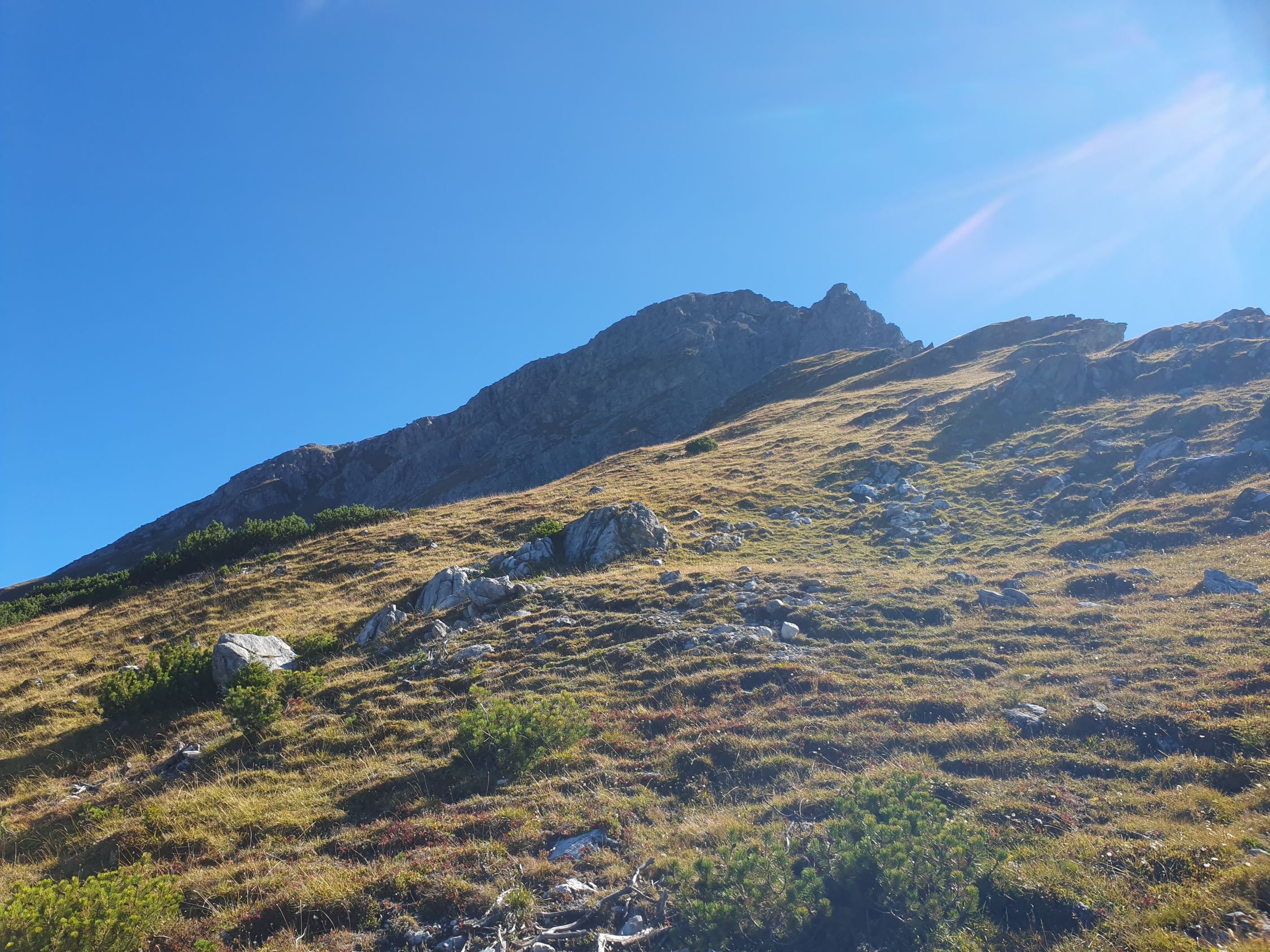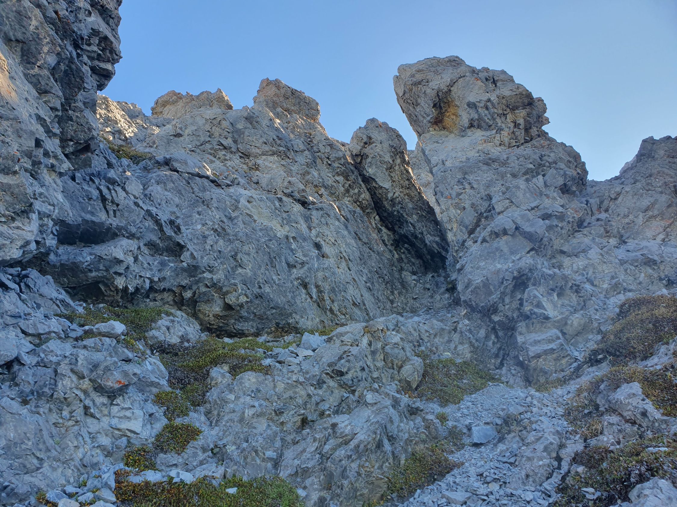 Der weitere Wegverlauf ist ab hier ziemlich klar. P2958 wird südlich umgangen, auch weisen nun vermehrt Steinmännli, die ich an den Knotenpunkten erhöht habe, den weiteren Wegverlauf auf. Ich bewege meist im Gehgelände und es sind nur 1-2 kleine und einfache Kletterpassagen zu meistern (T4+, I+).