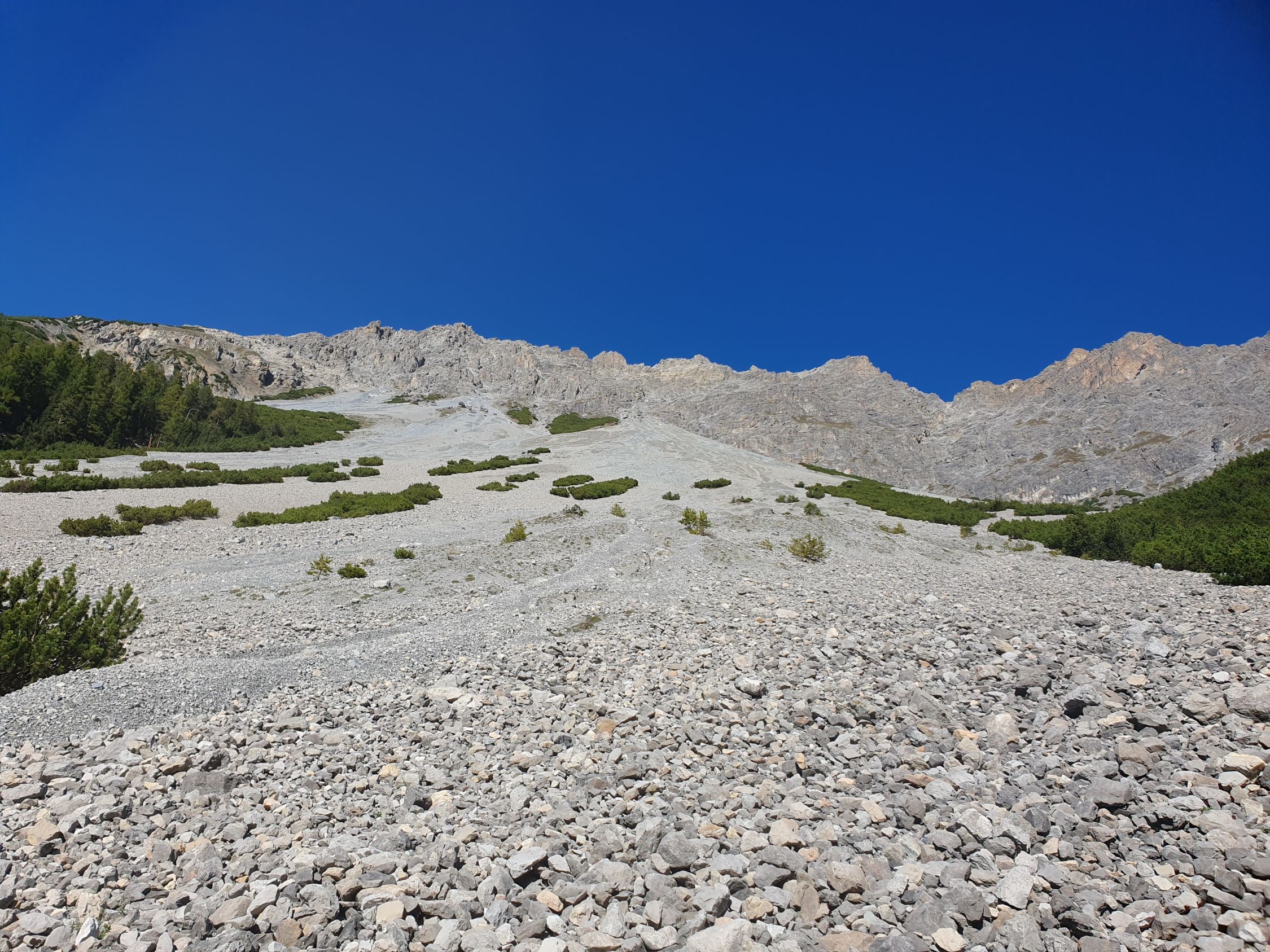 4. Ich versuche direkt südlich vom Piz dal Cuatal zur Abstiegsroute Nr. 1 (tiefsten Sattel zwischen Piz S-chalambert Dadaint und Piz dal Cuatal) zu gelangen, vergebens. Ich steige weiter sehr steil und abschüssig auf brüchige Felsen (auch die grossen Steine halten nicht alle) hinab, um eine durchgehende Rinne in das Val d'Uina zu finden, vergebens. Ich schaffe es gerade noch zum Sattem zwischen Piz dal Cuatal und P2890 (T6+, II+). Auch von hier kommt man auf die Abstiegsroute Nr. 3. Etwas anspruchsvoller sollte es jedoch auch in SW-Richtung in das Val d’Uina gehen. Ich bevorzugte diese Seite aufgrund der näher liegenden ÖV-Stelle. Zuoberst steige ich in SW-Richtung ziemlich steil, später etwas angenehmer über Kies und Schutt hinab. Doch der Geröll-Abrutsch-Spass hält sich stets in Grenzen. Immer wieder spüre ich feste Steine unter dem Kies, so, dass das Abrutschen den Spasseffekt etwas schmälert. Erst ab ca. 2300 Hm kann ich dann doch noch lachend über Kies bis P1789 hinab rutschen. Weiter über Legföhre hinab zur Aua d'Uina, hier Schuhwechsel. Nun auf dem Alpweg durch das nicht mehrenden wollende Val d’Uina bis nach Sent Sur En.