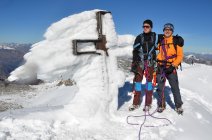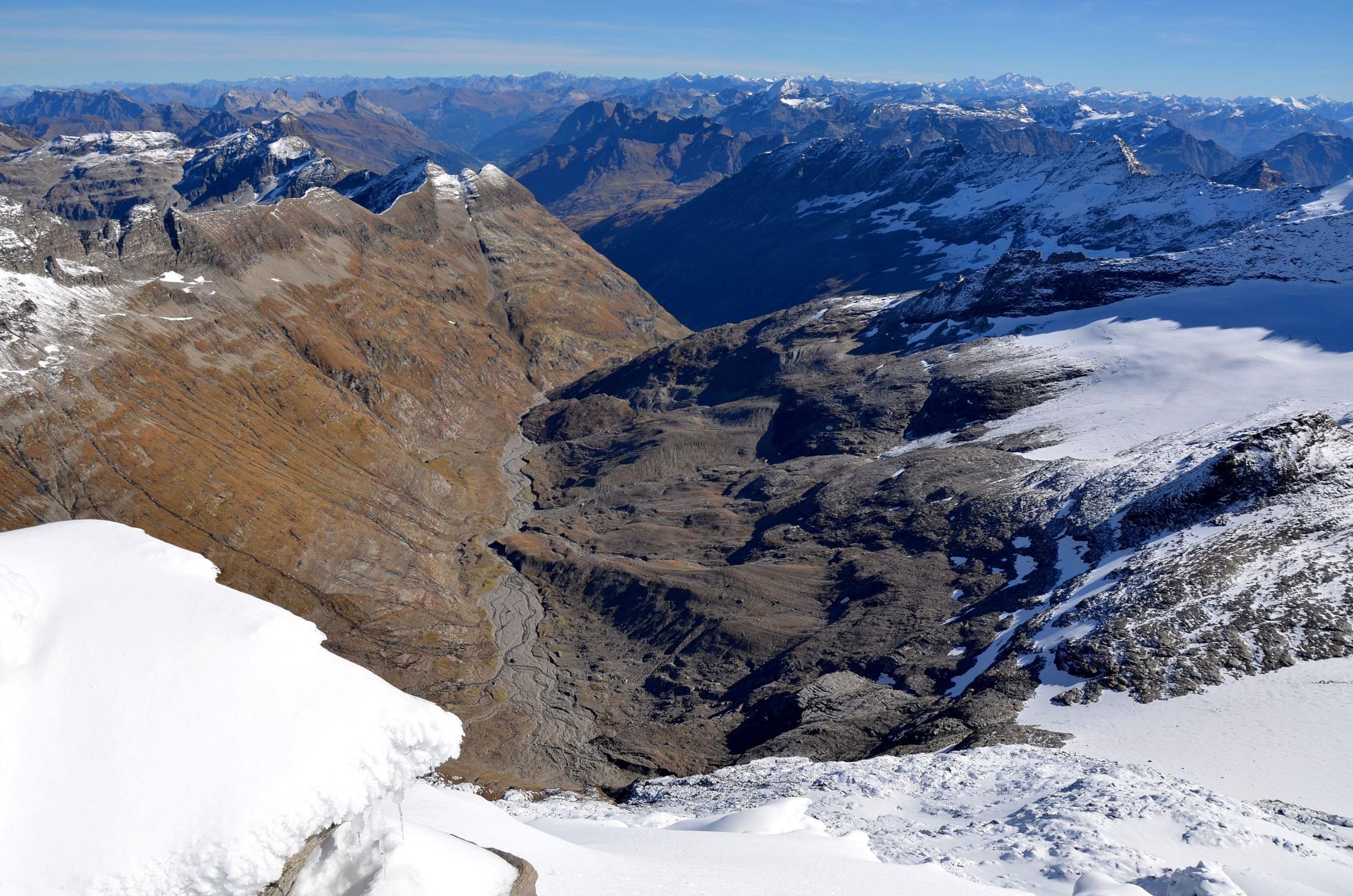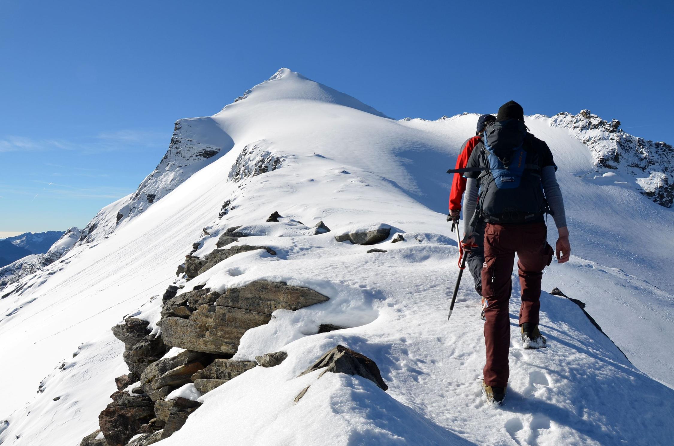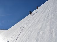 Als Abstieg wählten wir die Route durch die Ostflanke. Diese abschüssige und im oberen Abschnitt 40° steile Flanke darf nur bei Trittschnee und lawinensicheren Verhältnissen betreten werden.