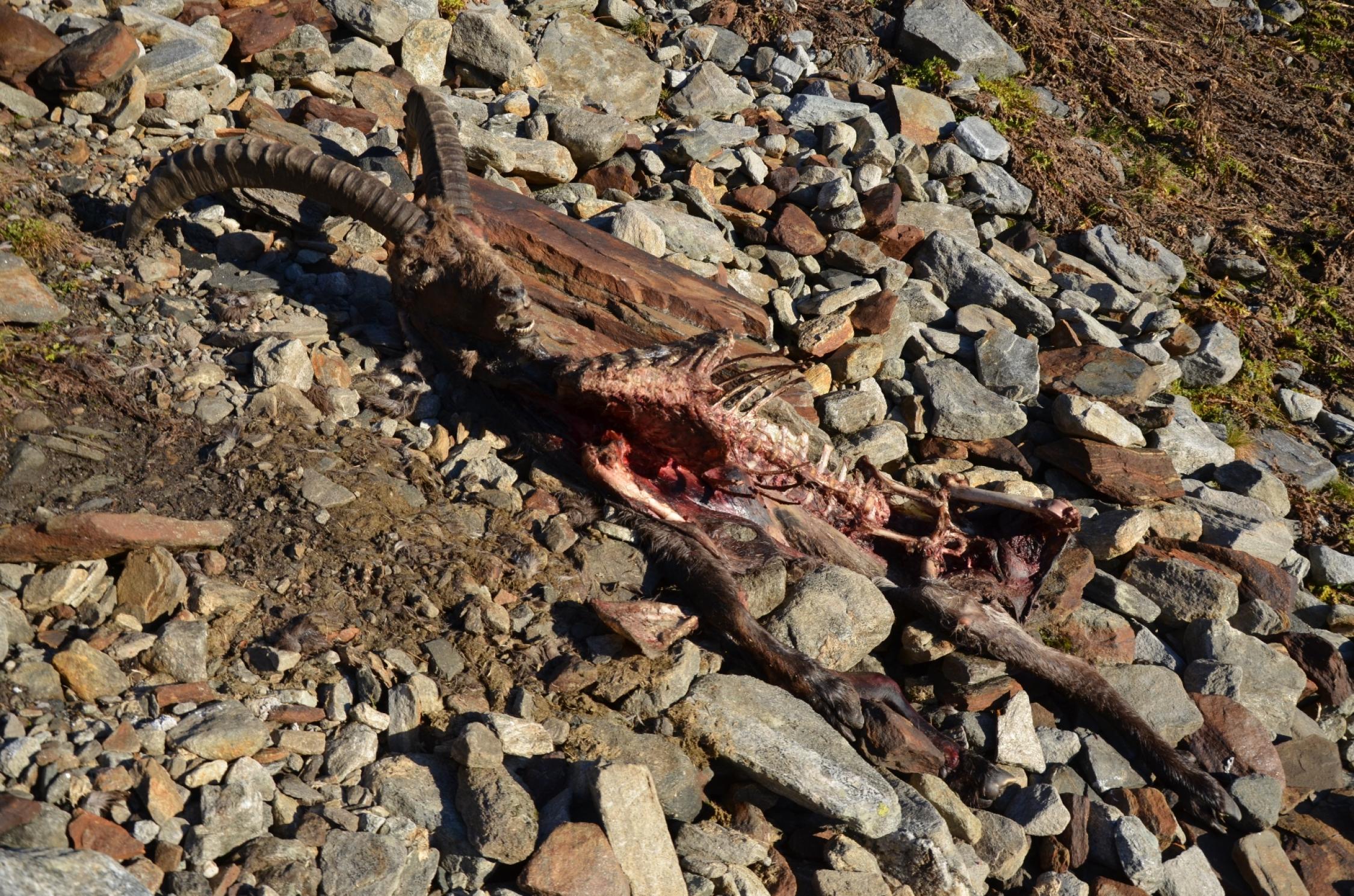 Oberhalb des Ursprungs trafen wir auf einen Steinbockkadaver. Die Hörner nahmen wir als Erinnerung mit und meldeten den Fund dem Wildhüter.