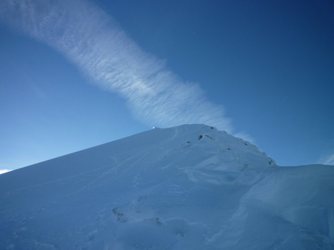 Sehr gute Verhältnisse auf dem Gletscher. Tragender Firn unten, im mittleren Teil leichter Bruchharsch und oben noch nicht gesetzter Schnee. Weg bis knapp unter den Gletscher ist schneefrei (bis Mittwoch?).