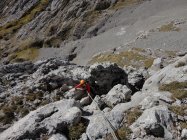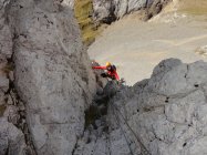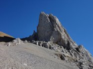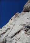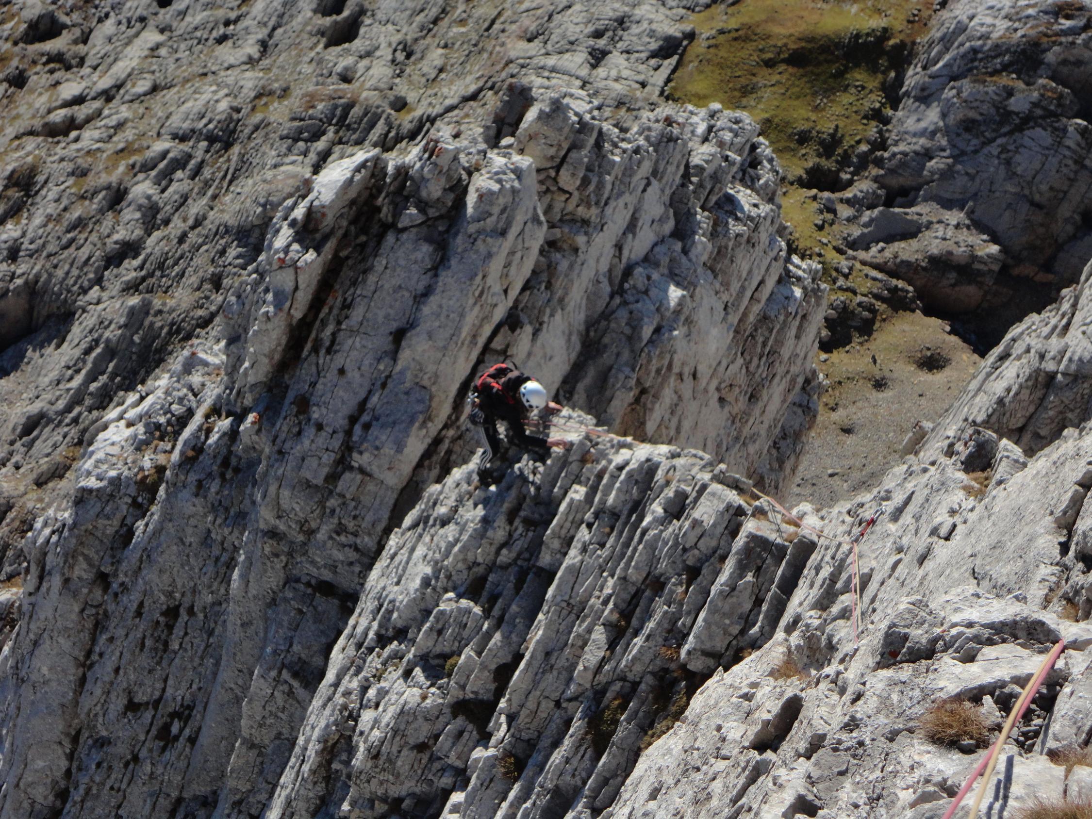 An allen Ständen gebohrte Ringhaken vorhanden, lediglich am Ende der 3. SL fanden sich nur zwei geschlagene Haken. Vermutlich sind wir dort zu weit links auf die alte Westgratroute geraten. Zwischensicherungen nicht üppig, aber der Schwierigkeit entsprechend ausreichend. Friend o. kleines Klemmkeilsortiment schaden trotzdem nicht.