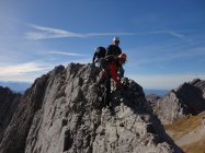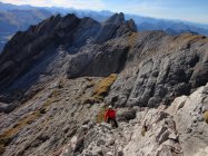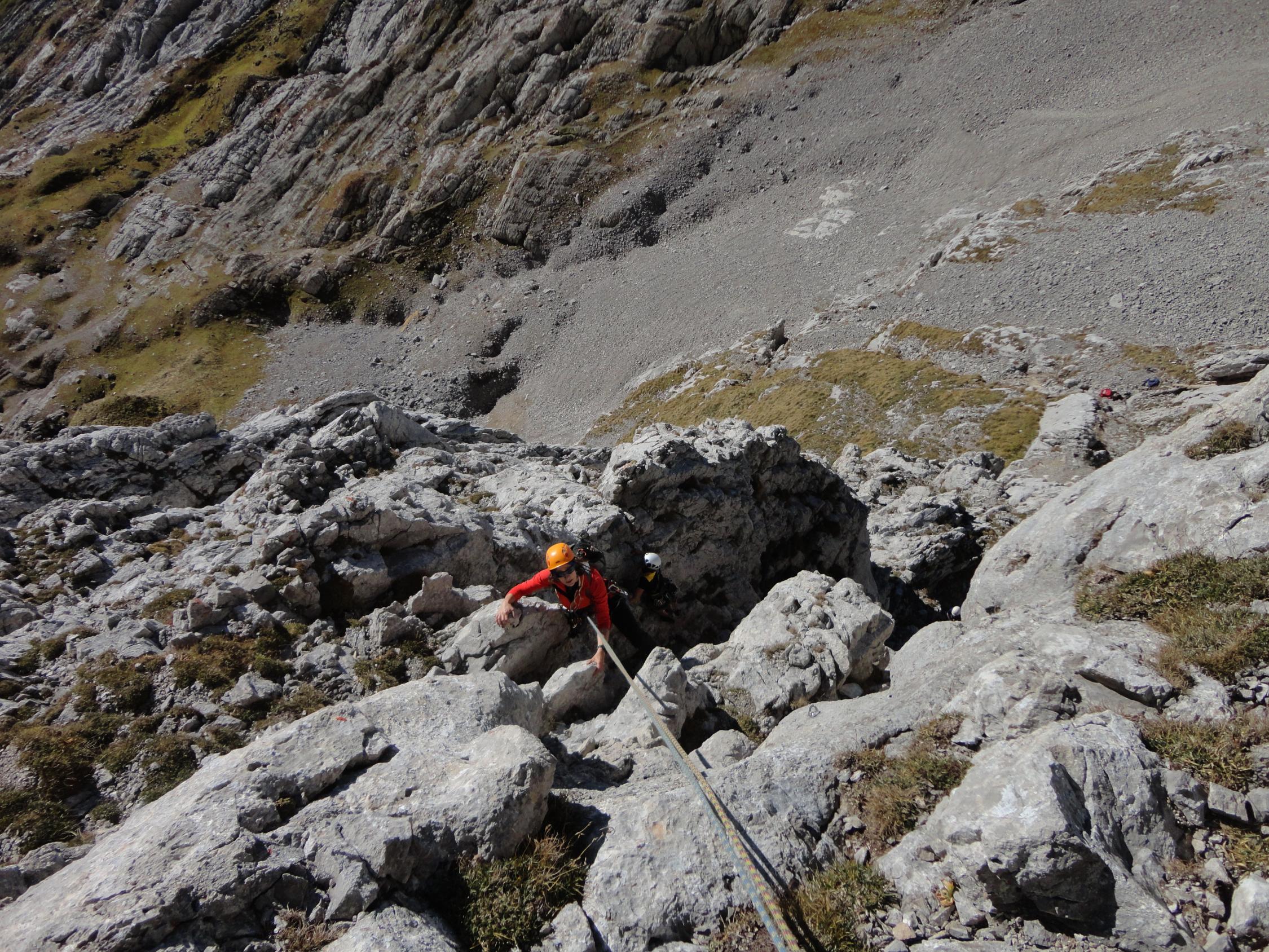 Wetter sonnig und bis zum Einstieg sehr warm, am Grat und im Gipfelbereich dann böiger Wind und recht frisch.