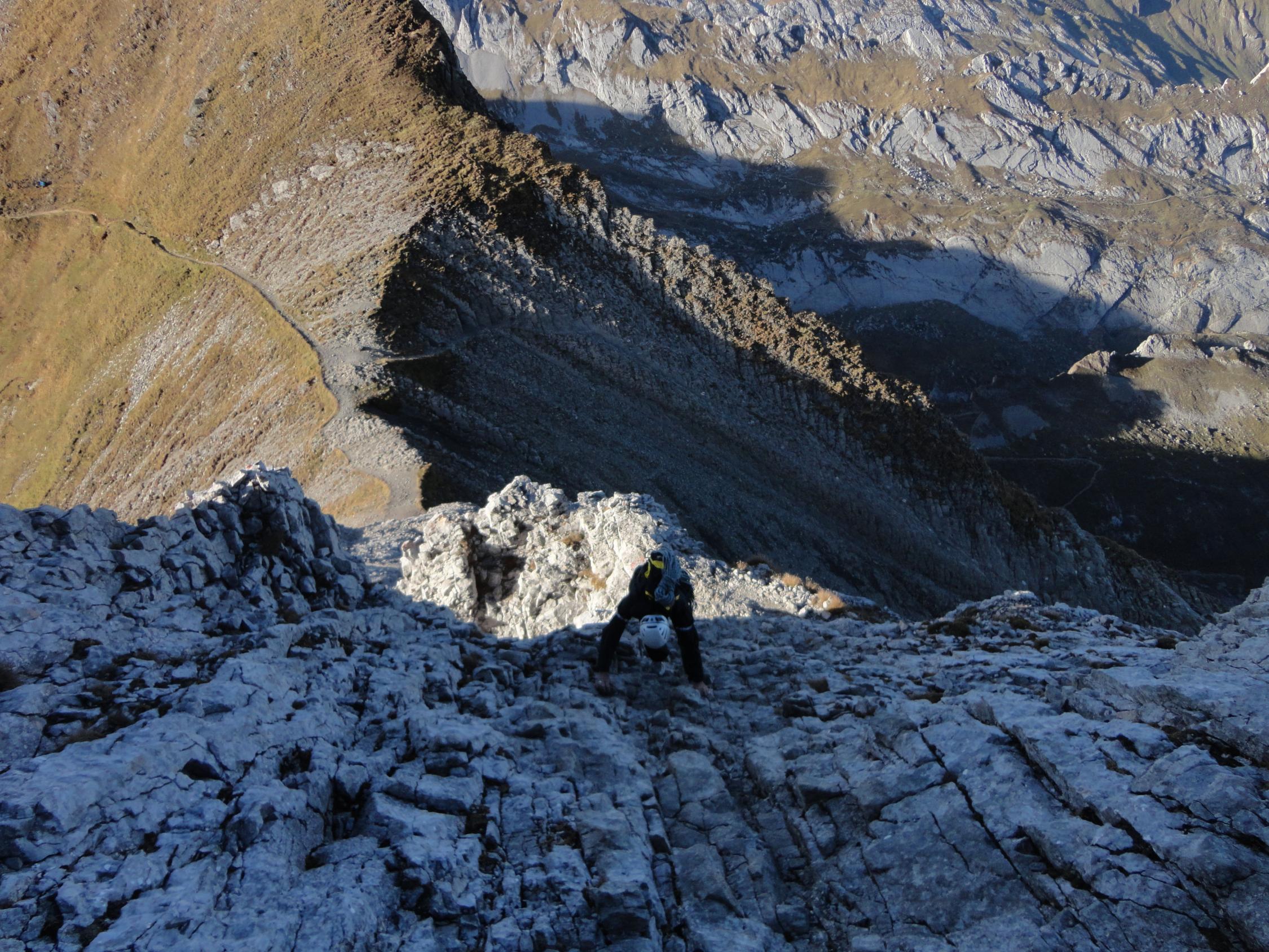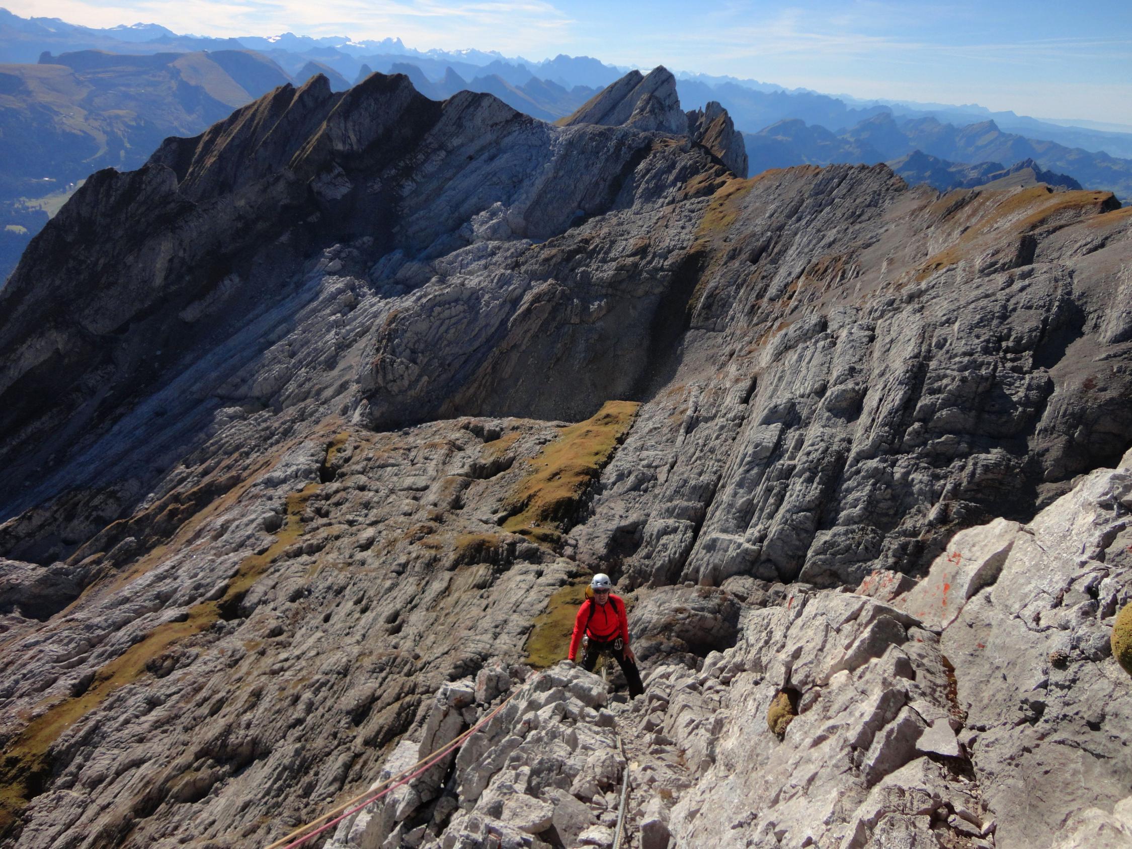 Schöne, teils ausgesetzte Genusskletterei in festem, griffigen Fels. Nur der Abstieg am Normalweg ist ziemlich speckig und erfordert etwas Vorsicht. Alles trocken und bis auf den Einstiegskamin ab spätem Vormittag in der Sonne.
