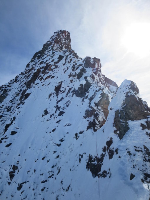 Gipfelgrat viel pulvriger Schnee und viel Wind. Trotz guter Spur für uns nicht ganz einfach zu klettern, und anspruchsvoller als die Rampe selbst. Gut machbar, aber nicht zu unterschätzen.