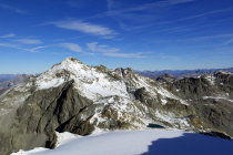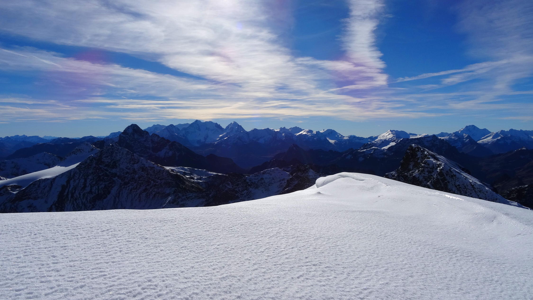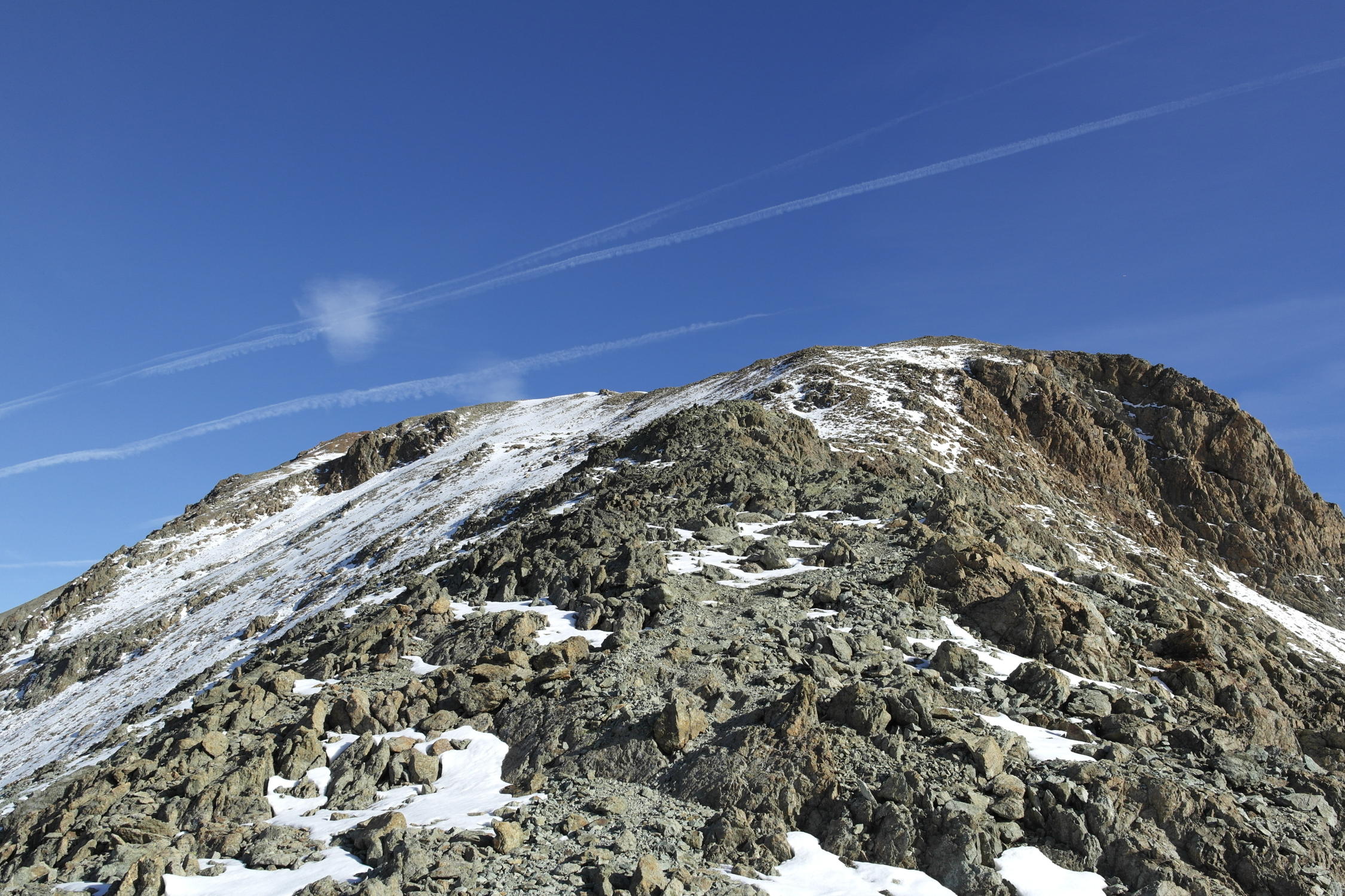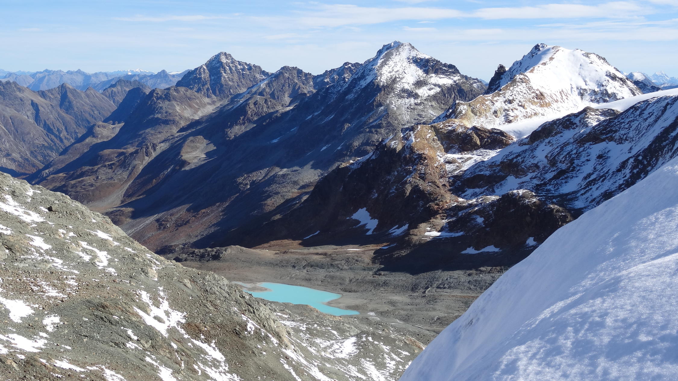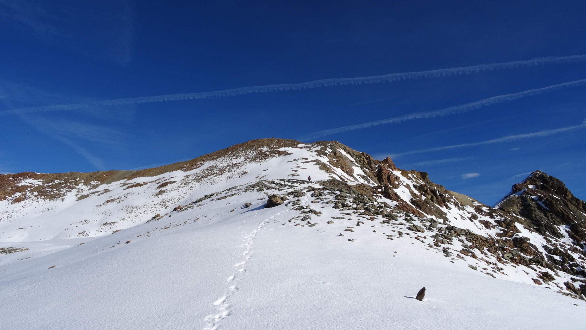 Erst ab der Fuorcla da Flix etwas Schnee, kurz vor dem Gipfel dann eine tragende Schneedecke.