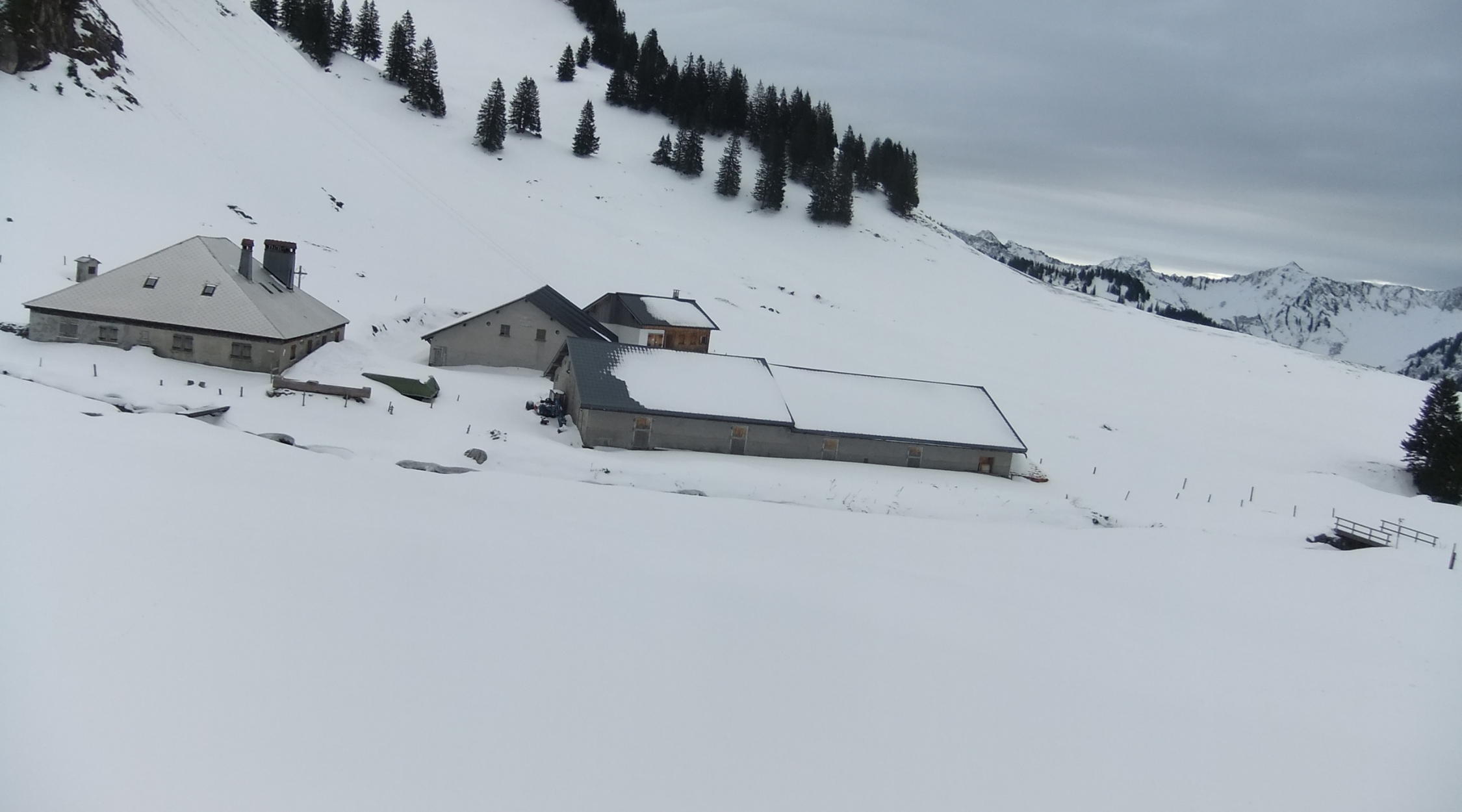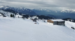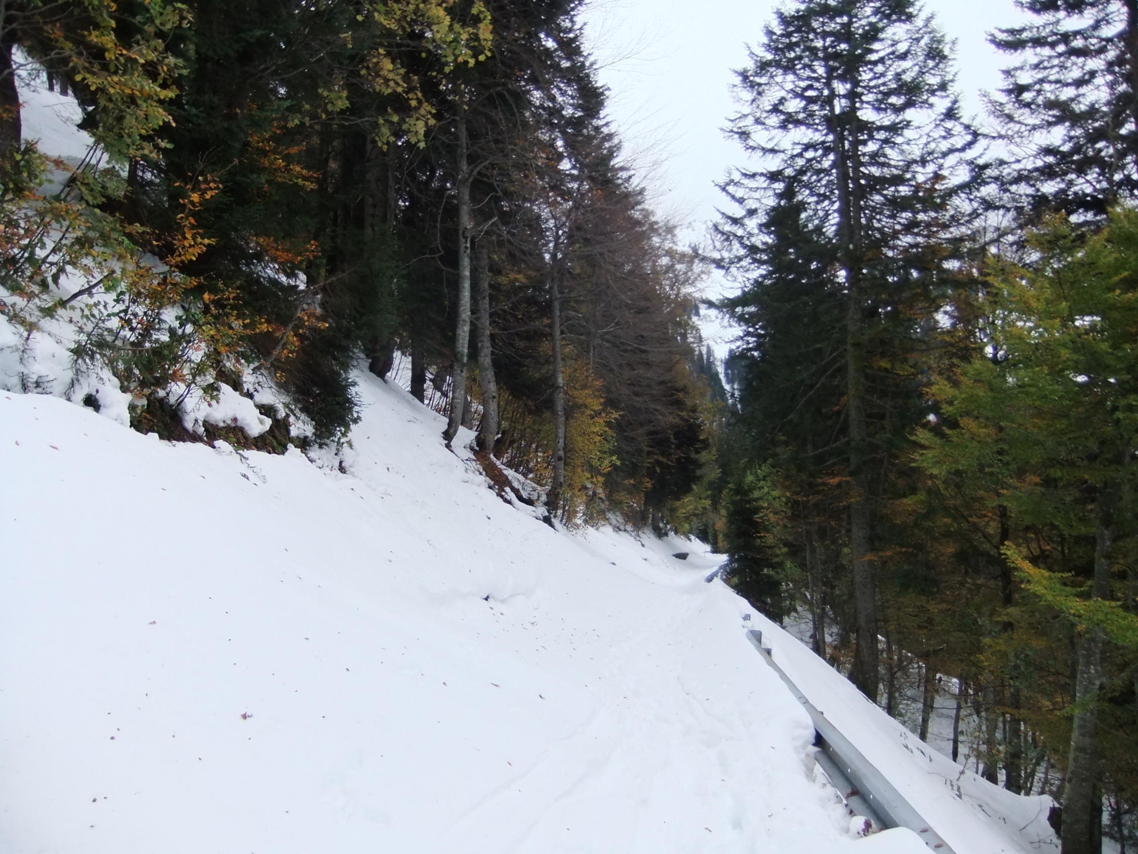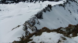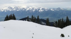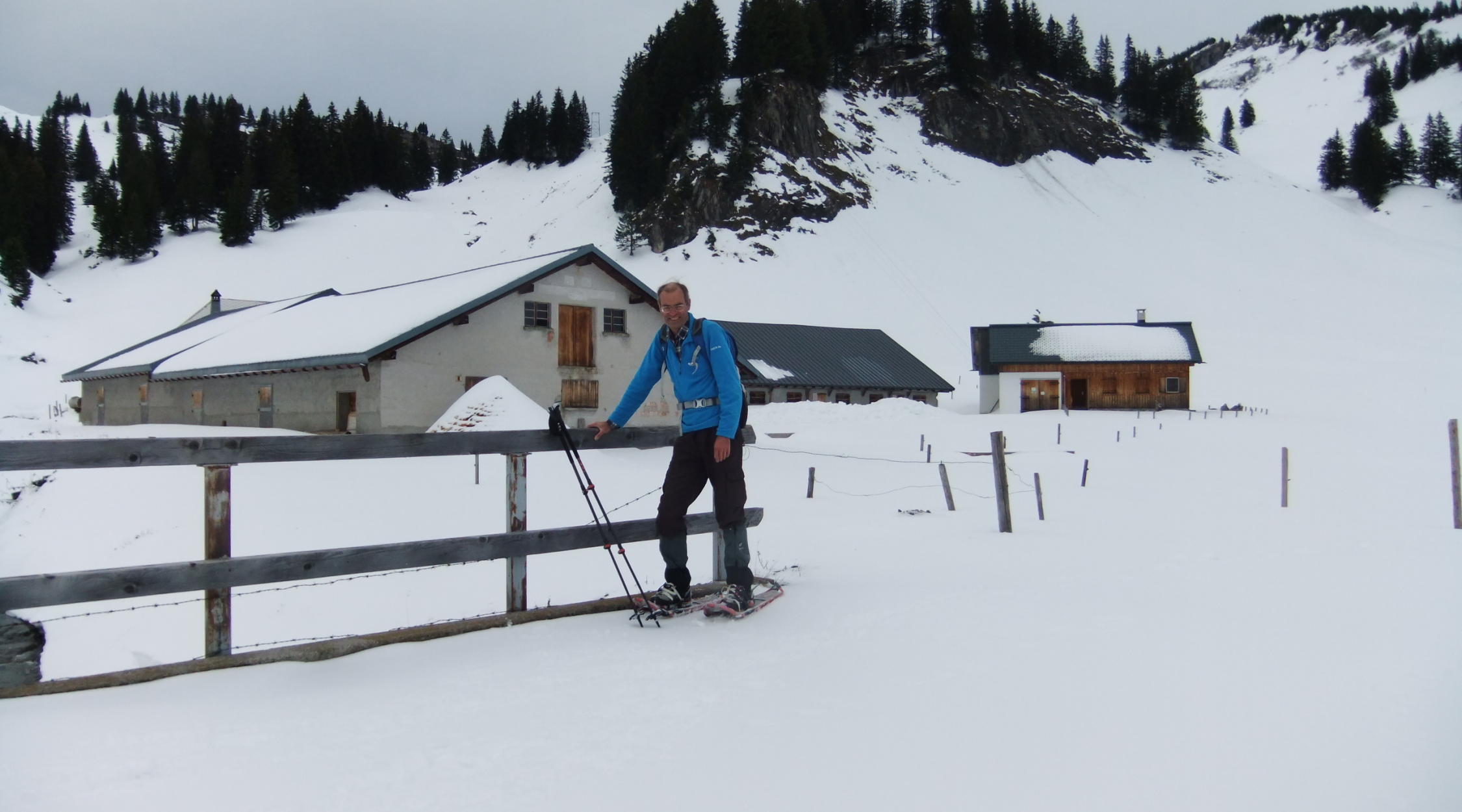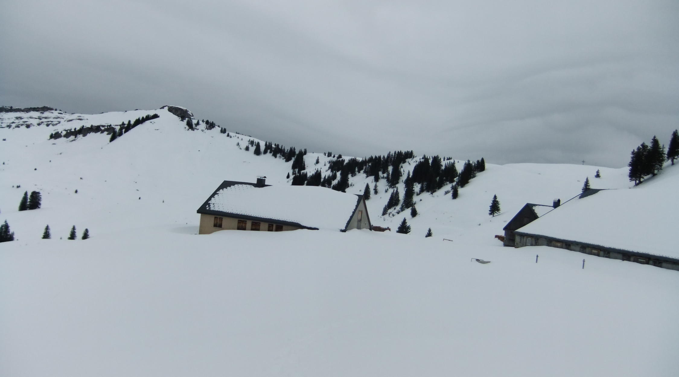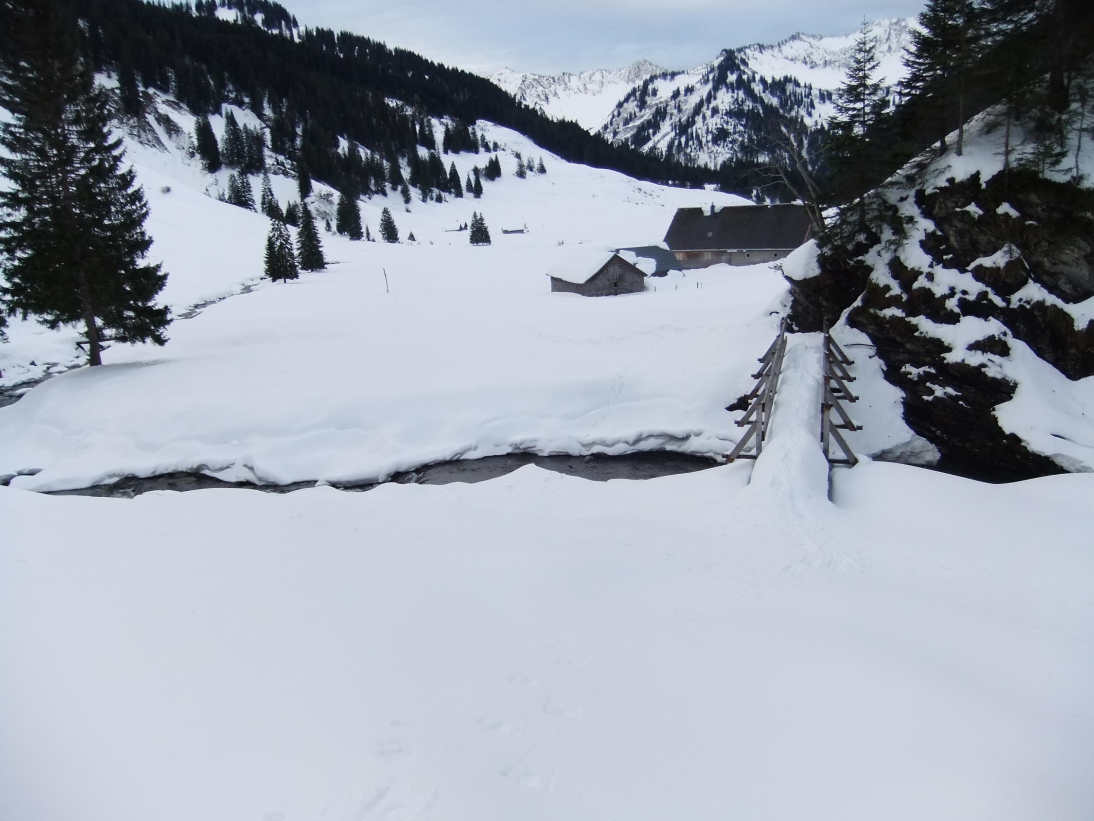 kompakter Naßschnee, aber tragend.Im oberen Bereich über 40 cm Schnee. Am Freschenhaus 2 Skispuren gesehen: Aufstieg (wohl von Gapfohlalpe kommend) zur Matona über u. Abfahrt zur Unt.Saluveralpe