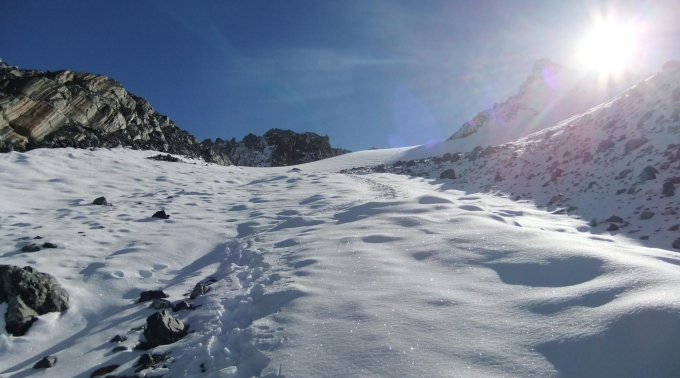Tourenbeginn um 06:30 bei +4° C. Spätsommerwetter im November nach sternenklarer Nacht. Ideal für SS-Läufer: morgens überfrostete Schneedecke im Aufstieg, ohne einzusinken. Nachmittags von der Sonne aufgesulzt knieschonend mit abgefederter Wirkung, so daß man es den Gletscher hinunter "platzen" lassen konnte. Bis zur Wiesbadener Hütte und ca. unterhalb des Kaiserspitz viele Stellen schneefrei, so daß bis dahin auch ohne Schneeschuhe der Zustieg möglich gewesen wäre.