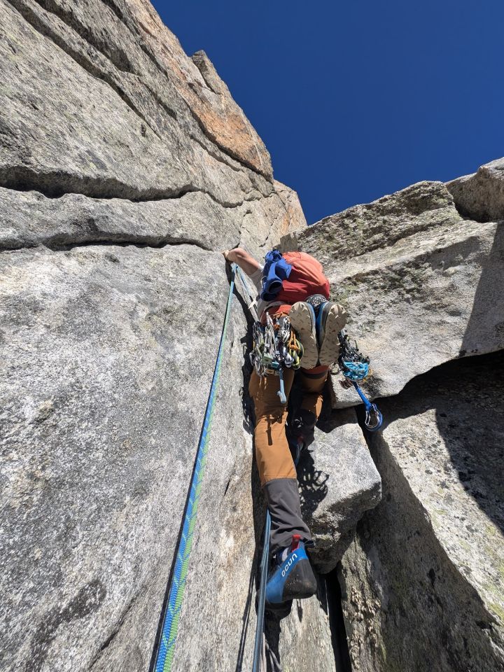 Traumhafte 22 SL-Klettertour auf einen Gipfel, der anders als viele andere Gipfel immer noch beste Felsqualität hat. An schwierigen Stellen meistens gut gesichert über Normalhaken, insgesamt aber alpin gesichert und am besten u.a. mit komplettem Friends-Set bis 3 zu sichern. An manchen Seillängen auch längere Stellen, die man nicht sichern kann. Wegen manchmal fehlenden Ständen sind v.a. bei der Umquerung der zwei Zwischengipfel die nächste Seillängen nicht leicht zu finden.