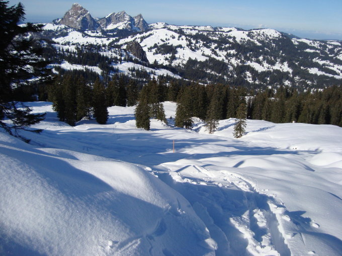 Obwohl das Laucherenstöckli "bloss" eine unscheinbare Erhebung ist,so eignet es sich auf Grund der Exposition dieser Seite gut für die erste Skitour der Saison.