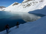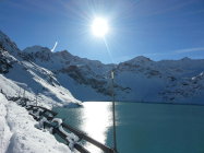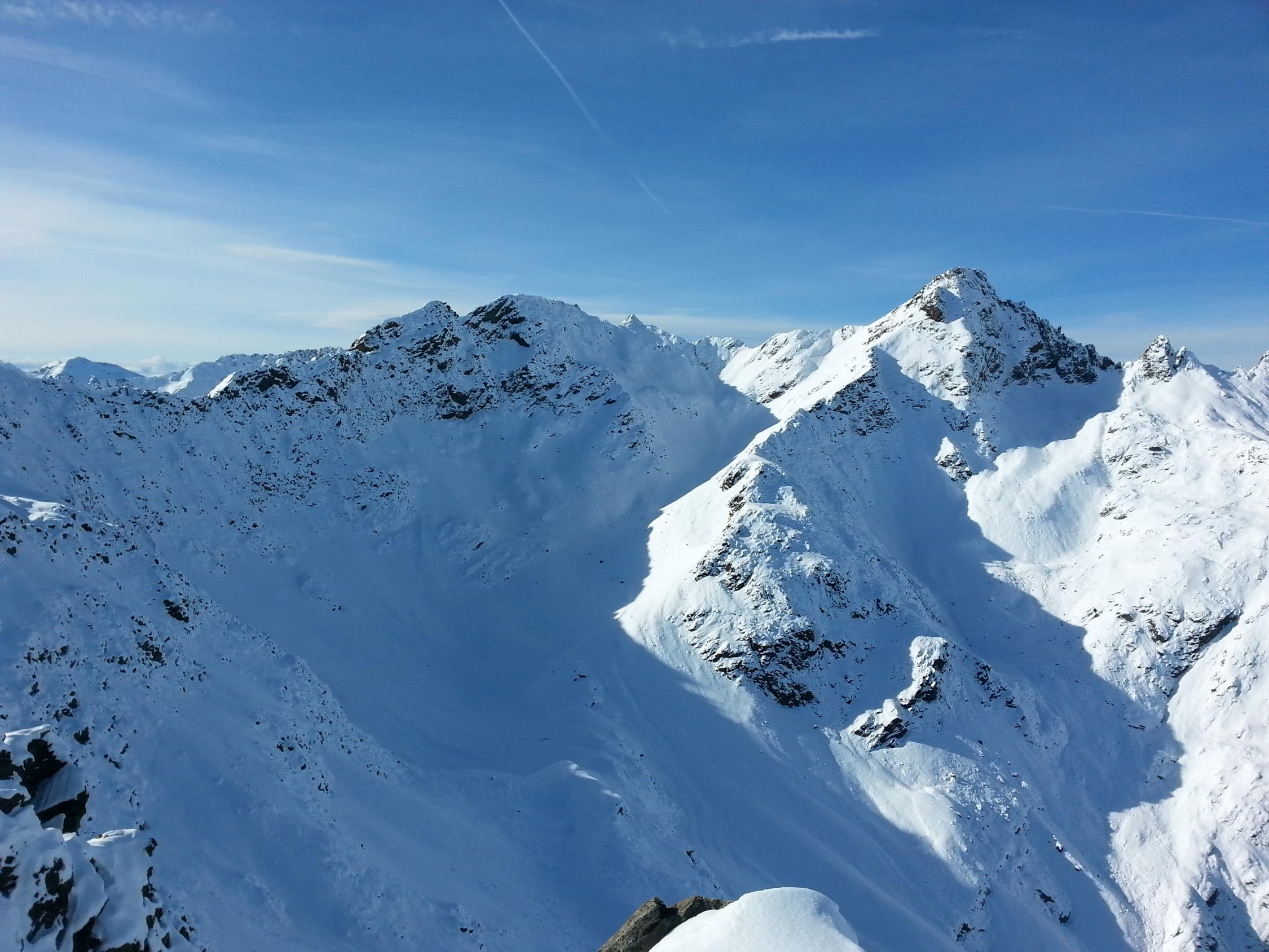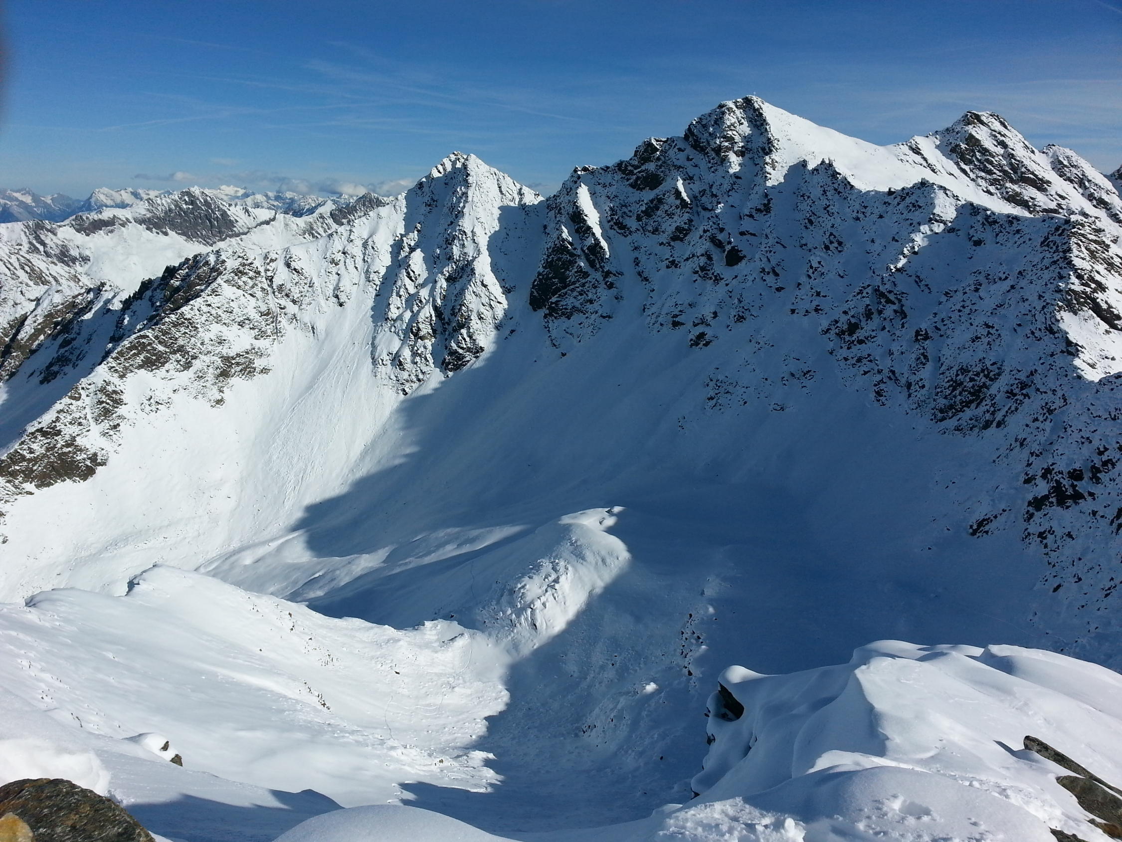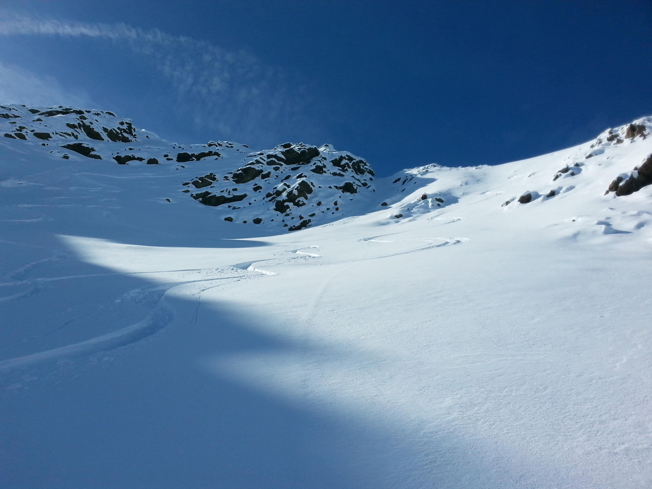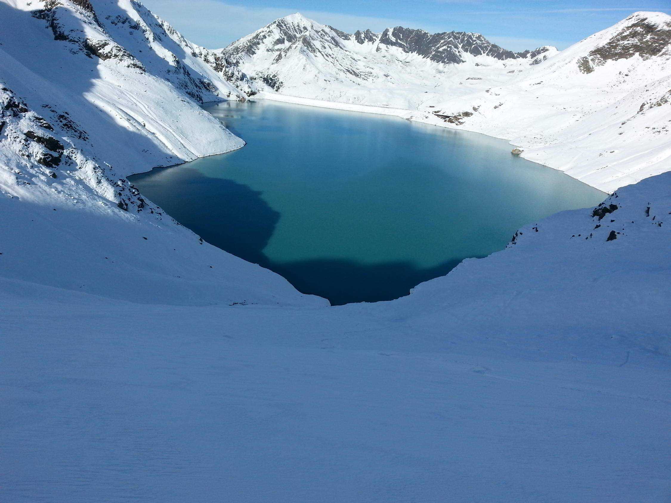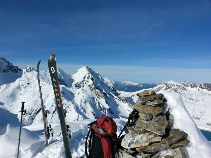 Auf der noch nicht geöffneten Piste richtig viel los! Schätze mal heute waren ca 70 Tourengeher da unten unterwegs(?!) Ab der Abzweigung zur Staumauer sehr ruhig. Ab da wird der Schnee dann auch immer besser. Vor allem vom südlichen Ende des Stausees durch das Kar nach oben liegt fast nur Pulver mit sogar einigermaßen brauchbarer Unterlage. Kurz vorm Gipfel wirds dann doch noch mal steinig. Zuerst in der steilen Querung zur Scharte hoch (da liegen ein paar große Brocken) und spätestens auf der Südostseite, über die man den Gipfel erreicht wirds dann eng.